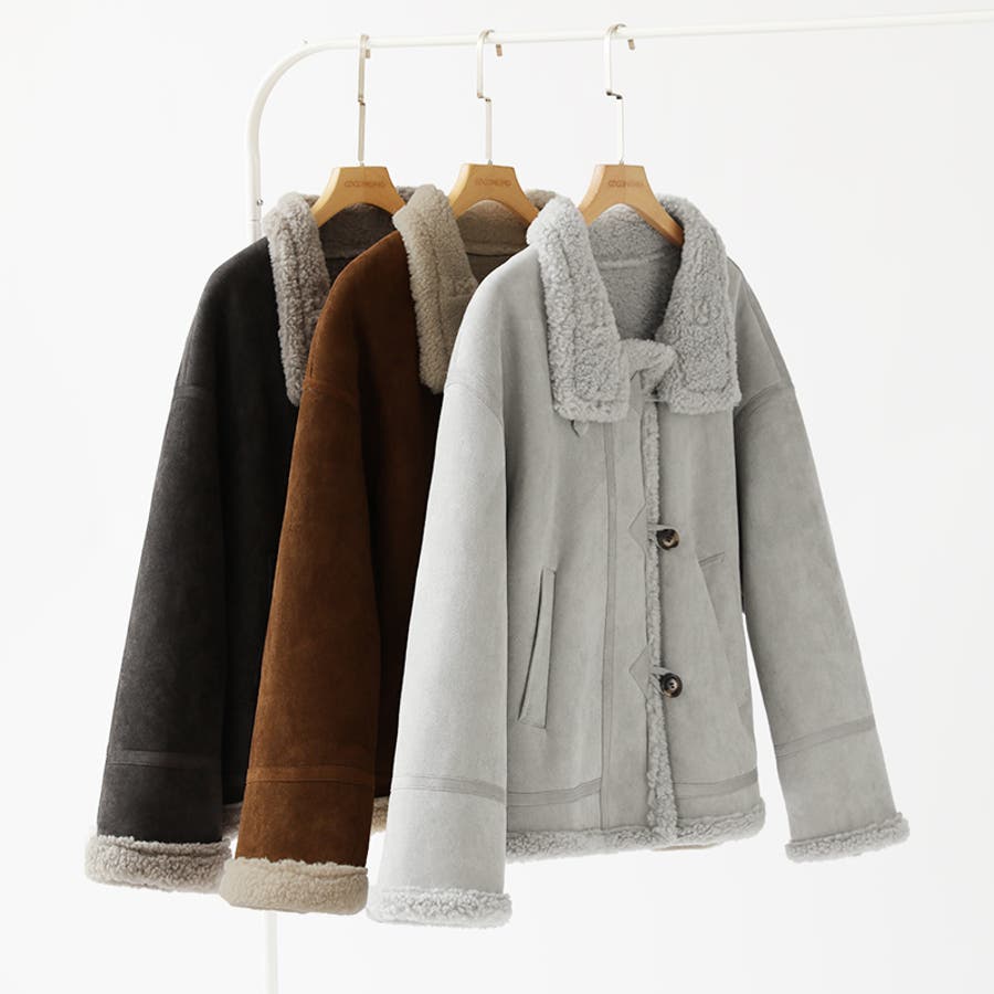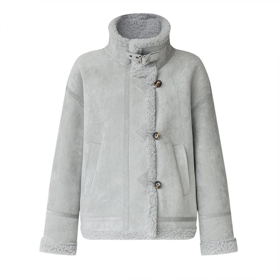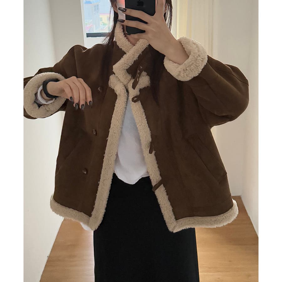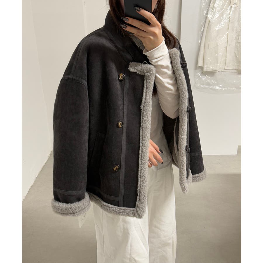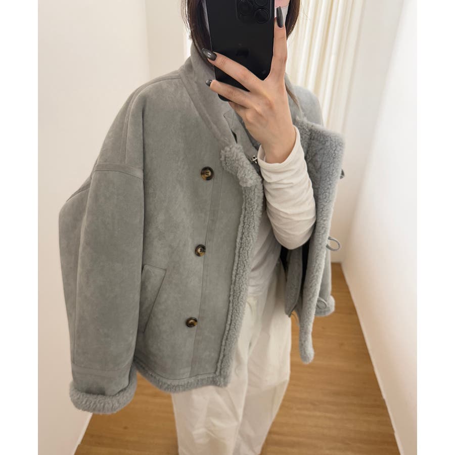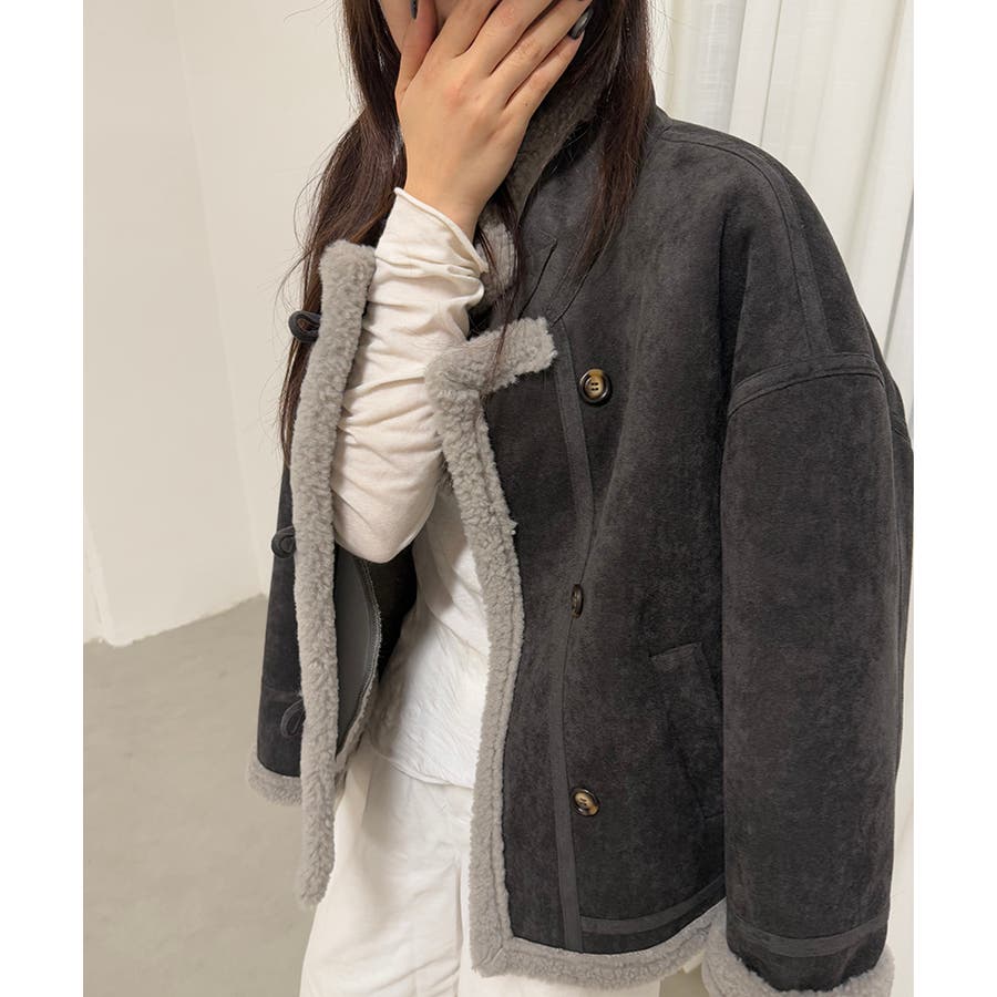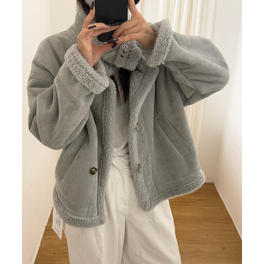 もこもこボアとスエード調の フェイクムートンを組み合わせた フェイクムートンジャケット。 襟元までしっかり包み込む スタンドカラー仕様で、 冷たい風を通さずあたたかに。 首元のバックルデザインが アクセントになり、着るだけで こなれた印象に仕上がります。