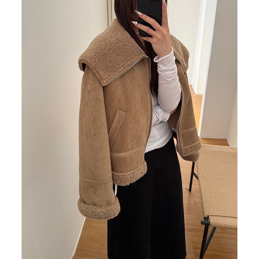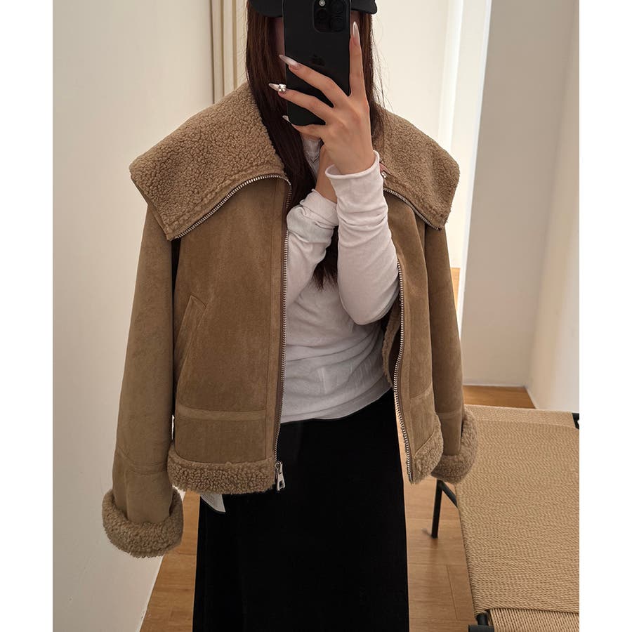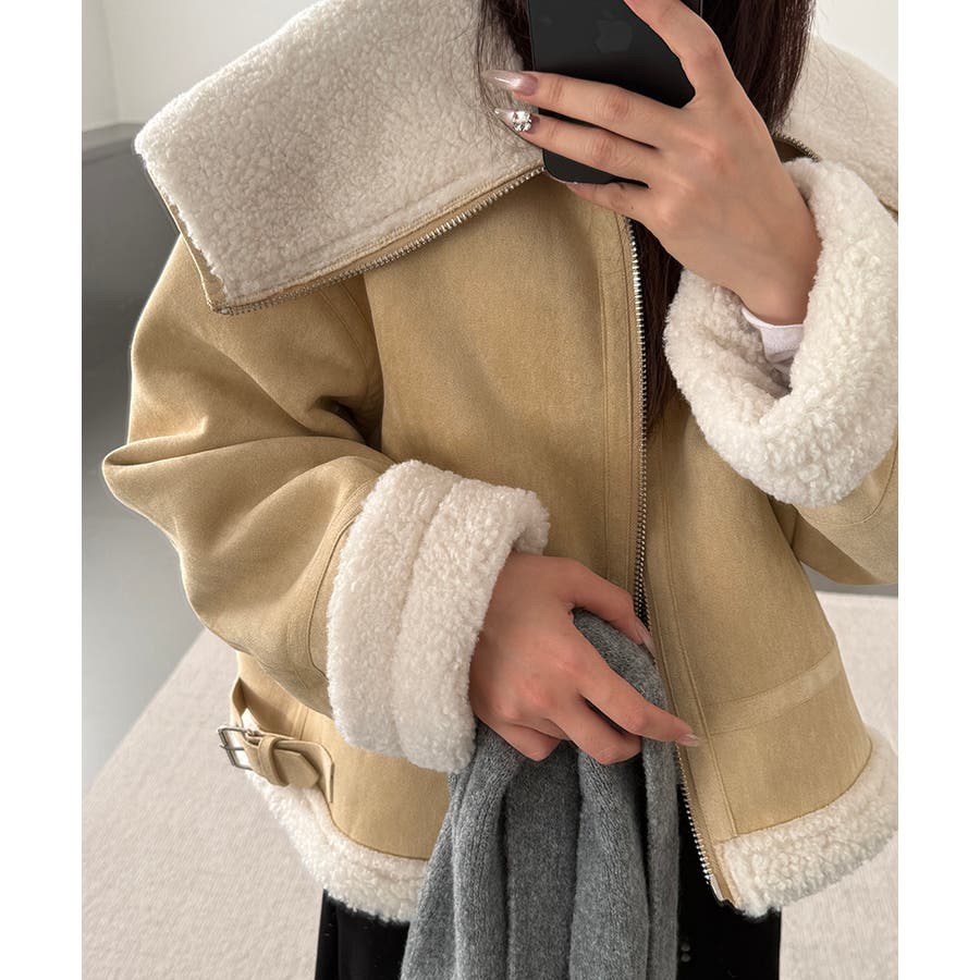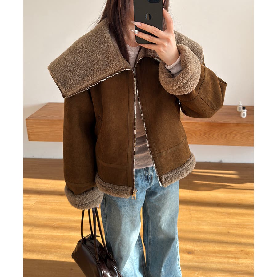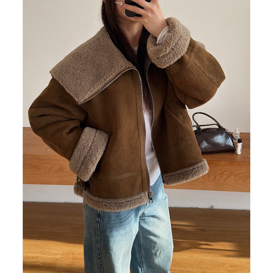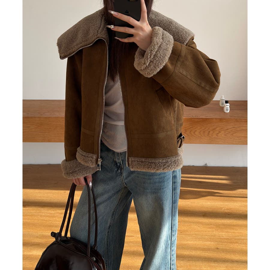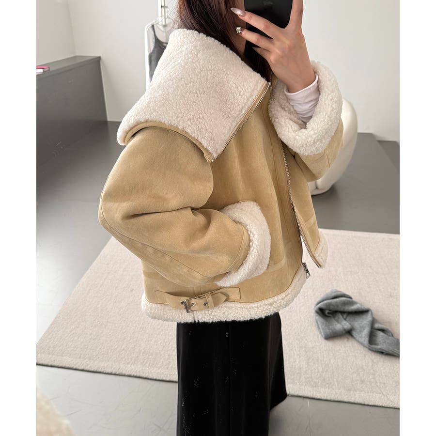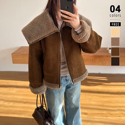 もこもこ裏ボアのフェイクムートンに、 存在感のあるビッグカラーを合わせた フェイクムートンボアジャケット。 柔らかなスエード調の表面と、 内側のふかふかボアがしっかり暖かく 冬も快適に。 ビッグカラーと両サイドには ベルトを配し、羽織るだけで 冬コーデを格上げしてくれます。