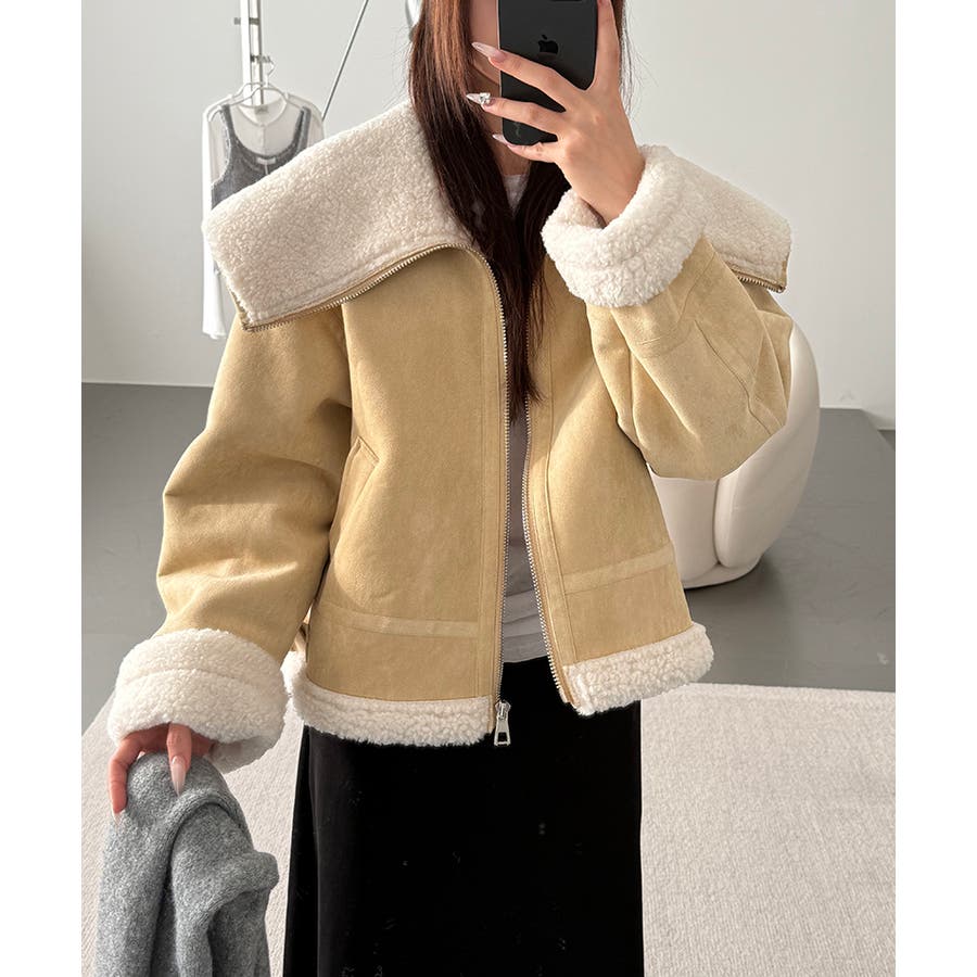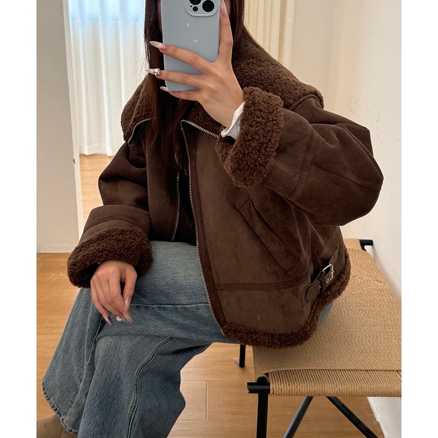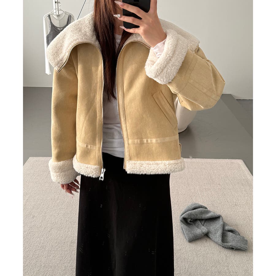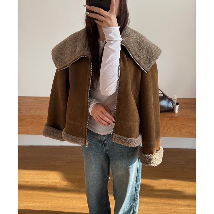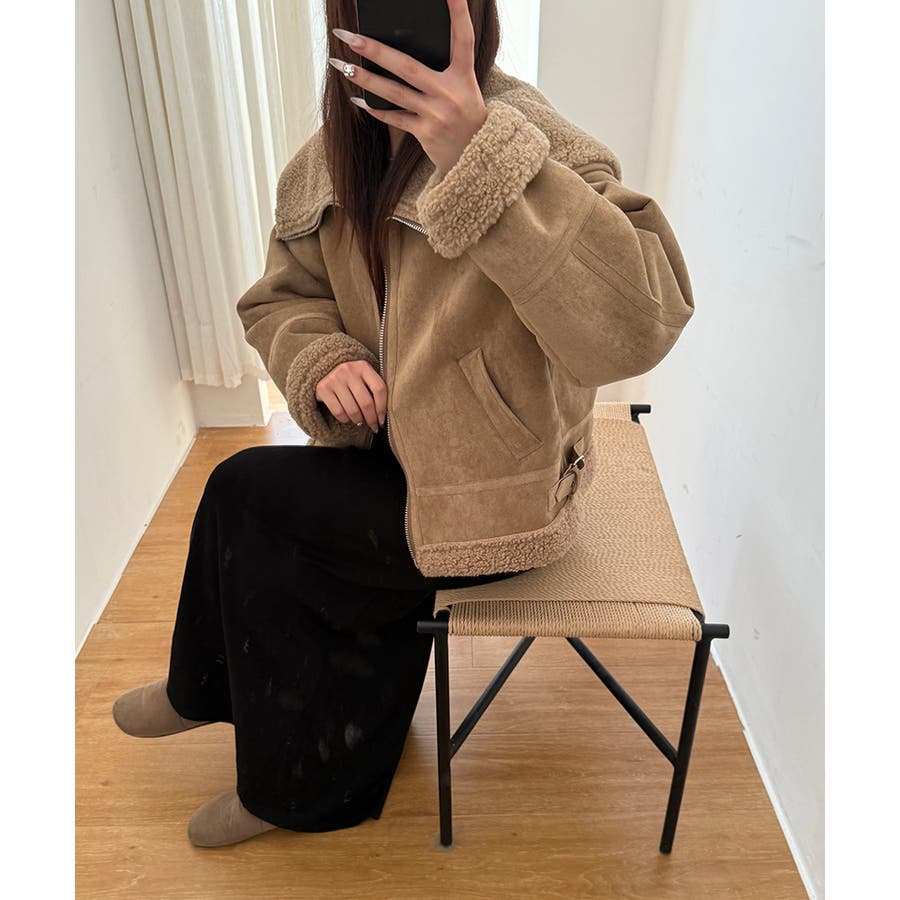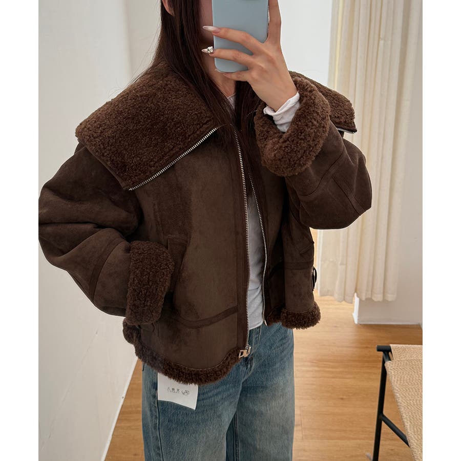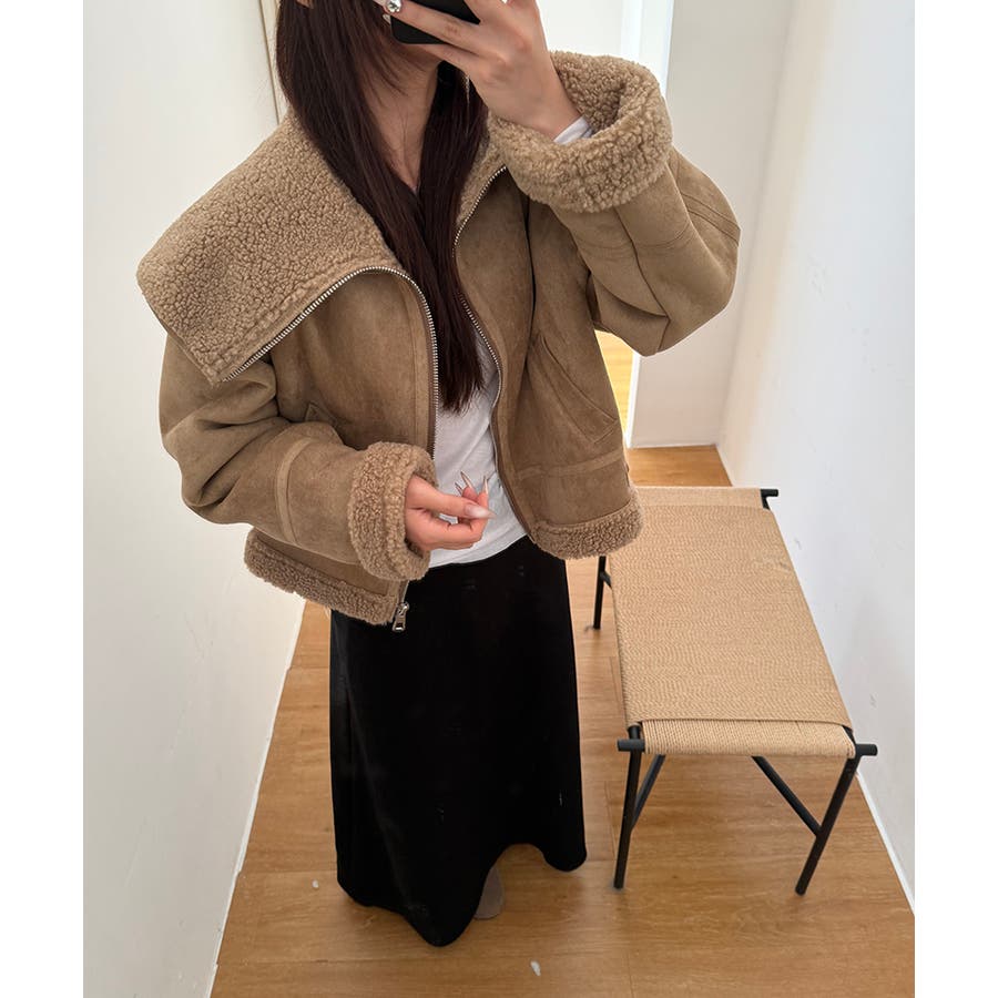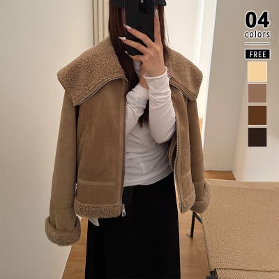もこもこ裏ボアのフェイクムートンに、 存在感のあるビッグカラーを合わせた フェイクムートンボアジャケット。 柔らかなスエード調の表面と、 内側のふかふかボアがしっかり暖かく 冬も快適に。 ビッグカラーと両サイドには ベルトを配し、羽織るだけで 冬コーデを格上げしてくれます。