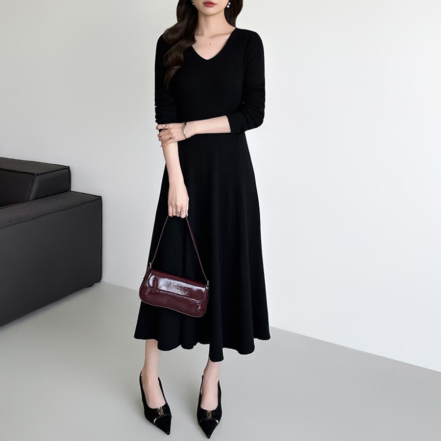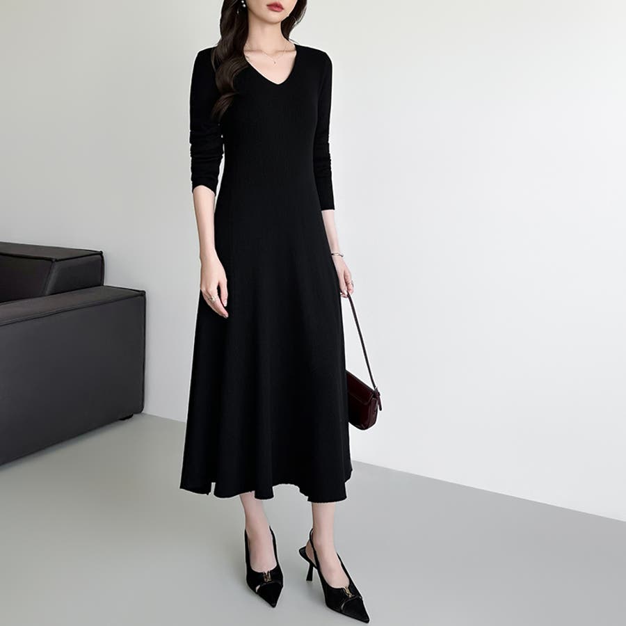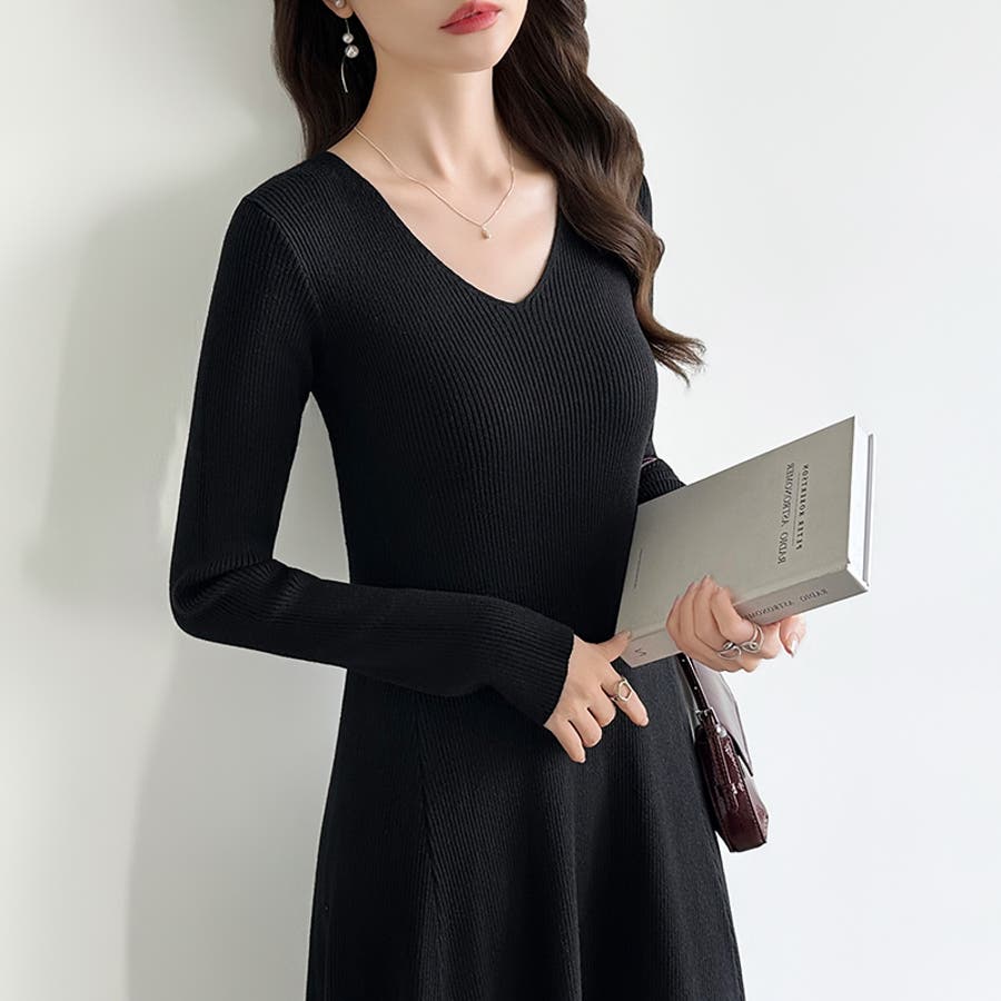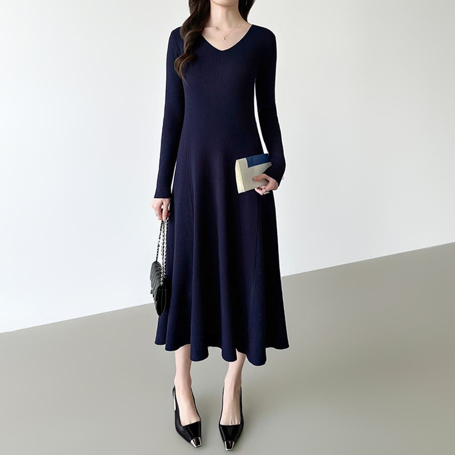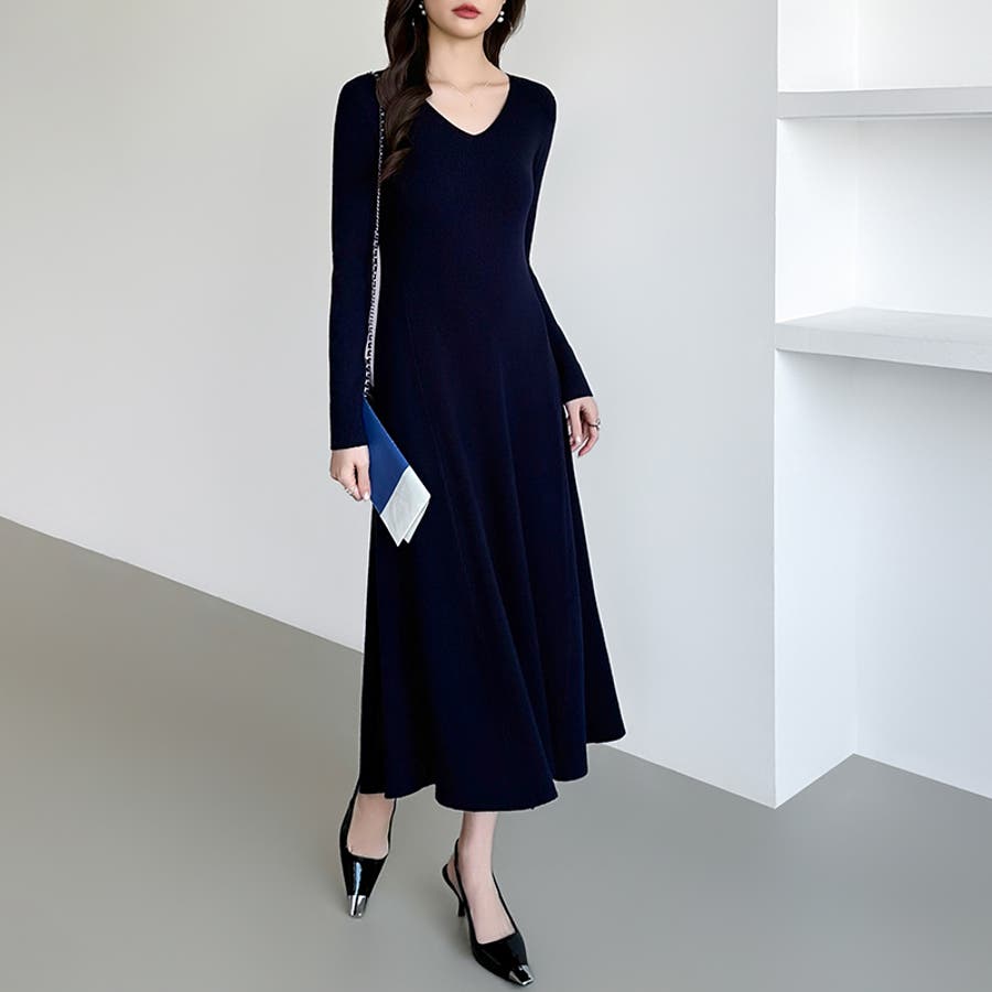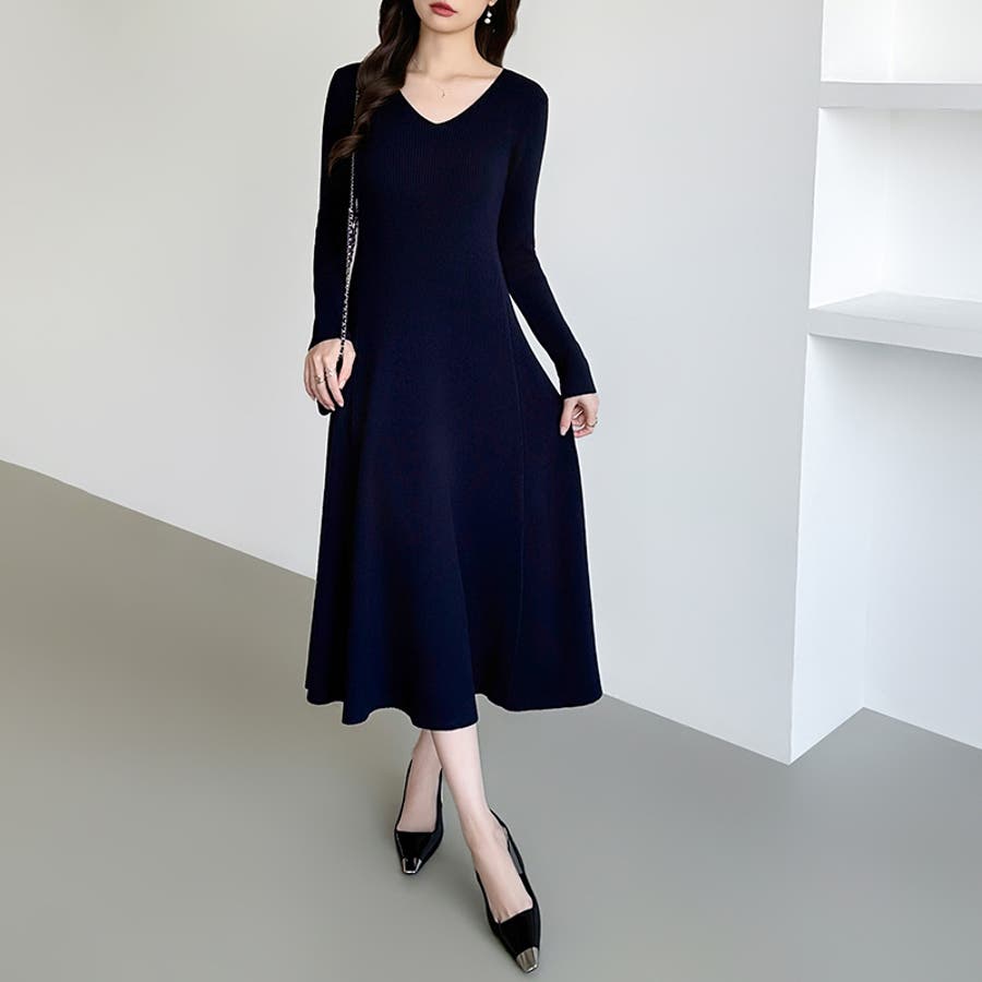 やわらかくしなやかな落ち感が魅力の Vネックニットワンピース。 ウエストから自然と広がるフレア シルエットが女性らしいラインを 美しく演出し、シンプルながらも 大人っぽく上品な印象に。
