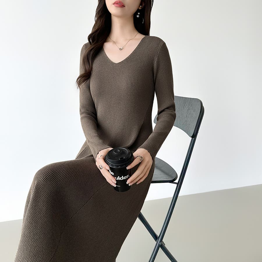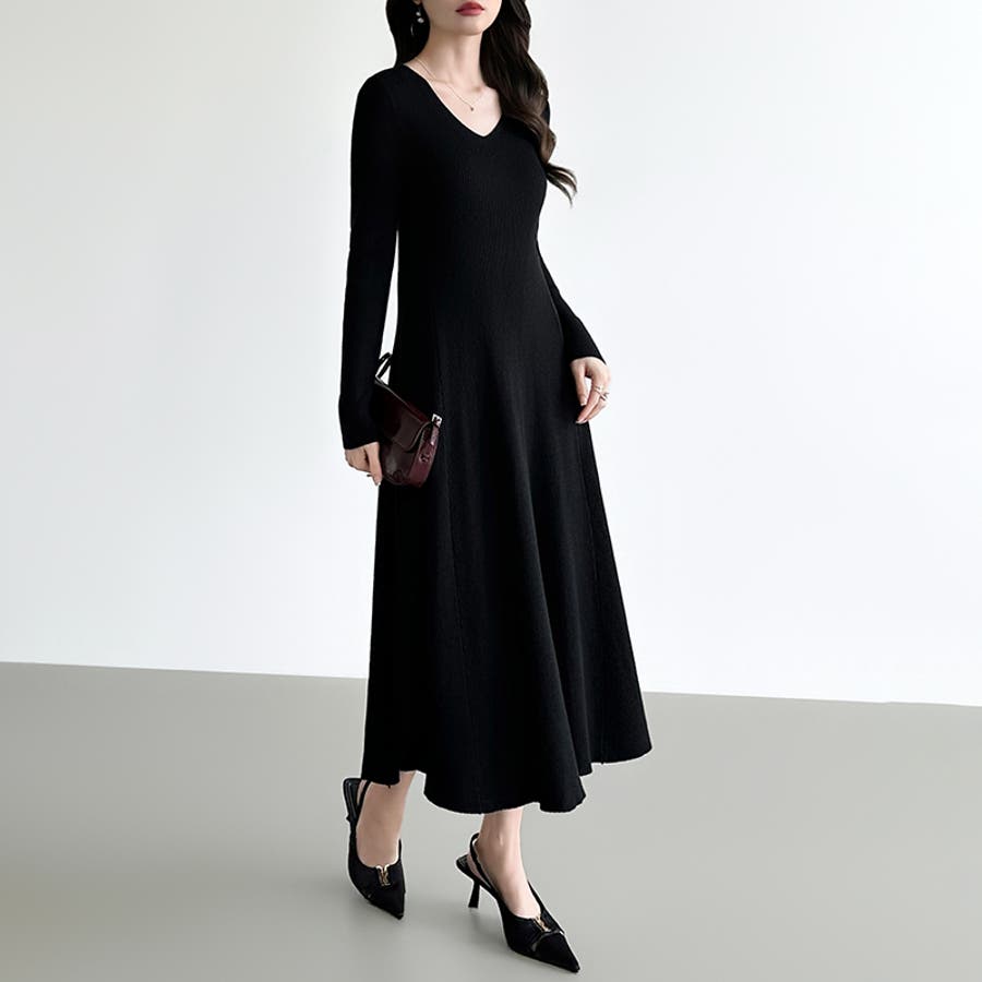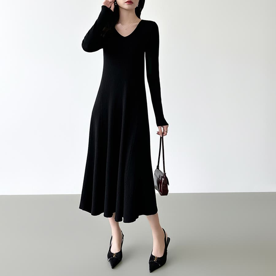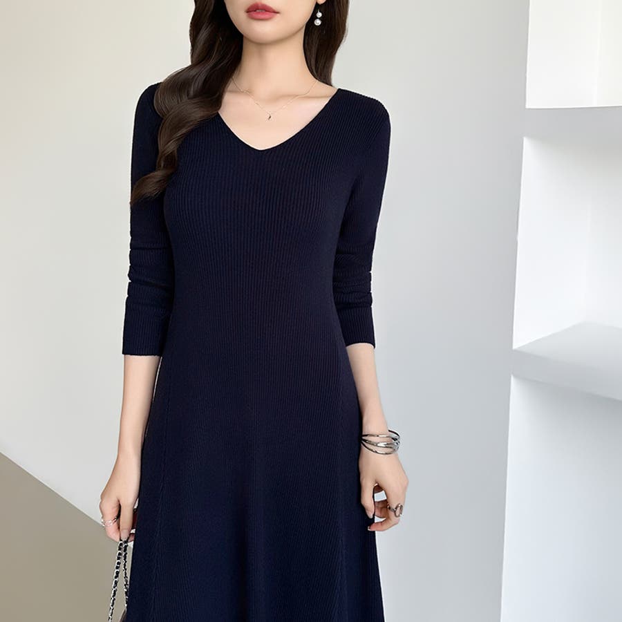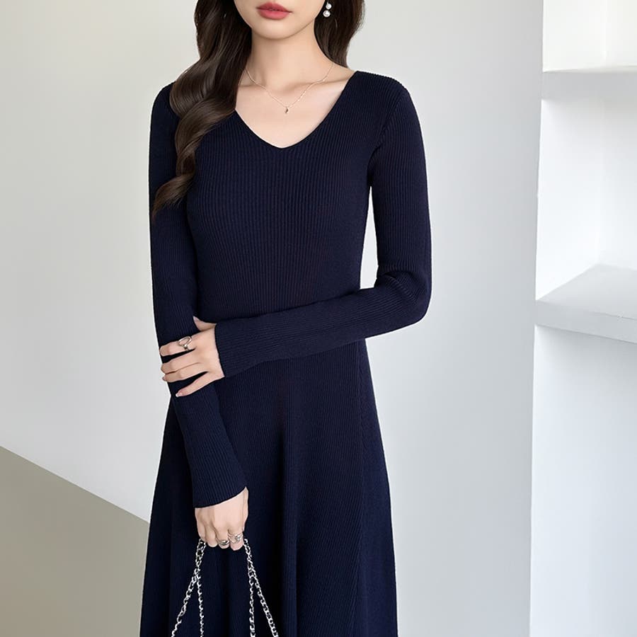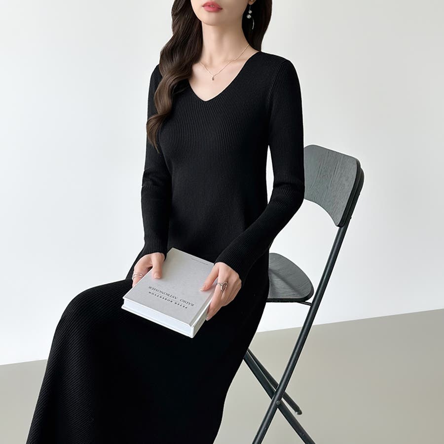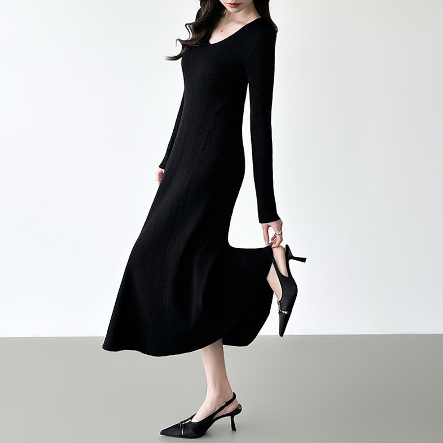 やわらかくしなやかな落ち感が魅力の Vネックニットワンピース。 ウエストから自然と広がるフレア シルエットが女性らしいラインを 美しく演出し、シンプルながらも 大人っぽく上品な印象に。