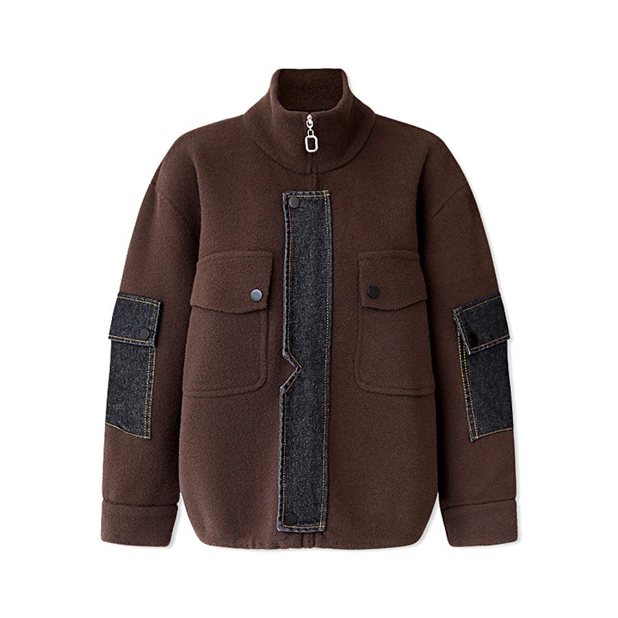 異素材のコントラストが目を惹く デニムドッキングデザインのブルゾン。 起毛感のある生地に袖や前立てへ デニム生地を組み合わせることで、 シンプルな装いに個性を添える カジュアルな一着に仕上げました。 裾にはドロストコードを採用。 シルエットをキュッと絞れば コンパクトで女性らしいバランスに。