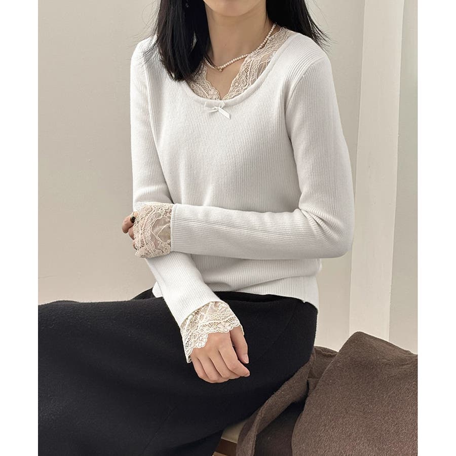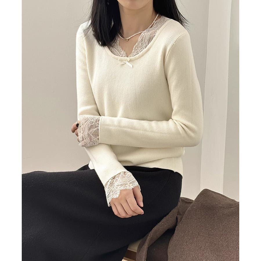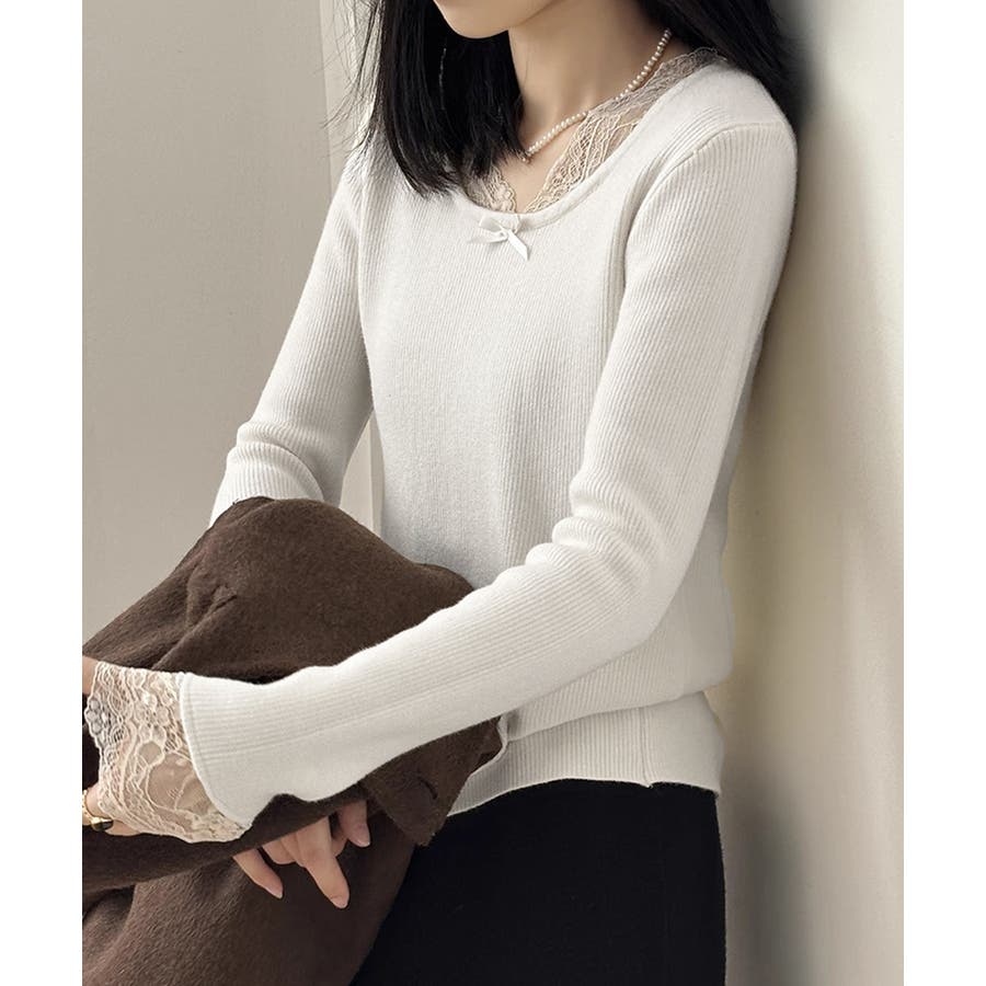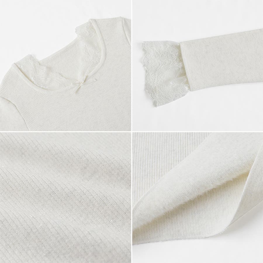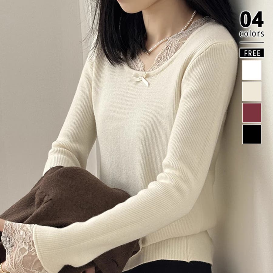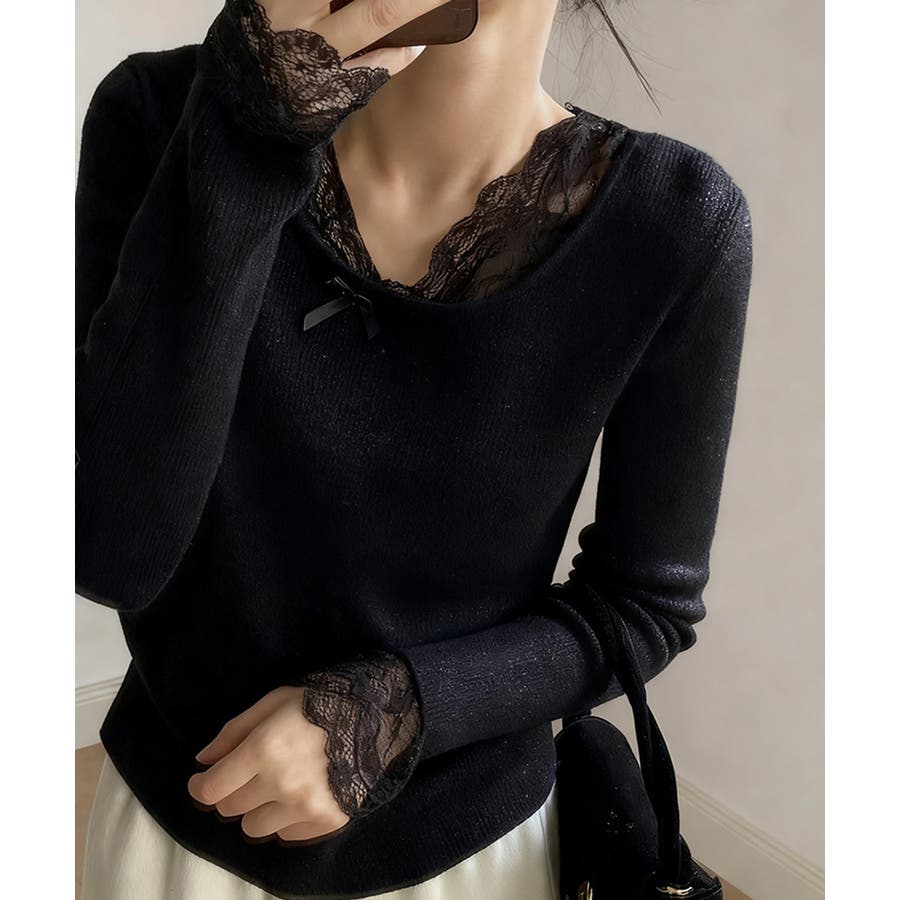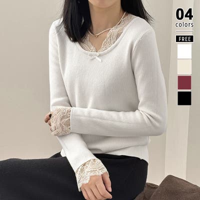 袖口と襟元にあしらわれた 繊細レースとラメ感が 女性らしいレースニット。 胸元の小さなリボンが ポイントになり上品で 可愛らしい印象に。 やわらかな肌触りの裏起毛生地は、 伸縮性があり快適な着心地に。 トップスにもジャケットや コートのインナーとしても 活躍します。