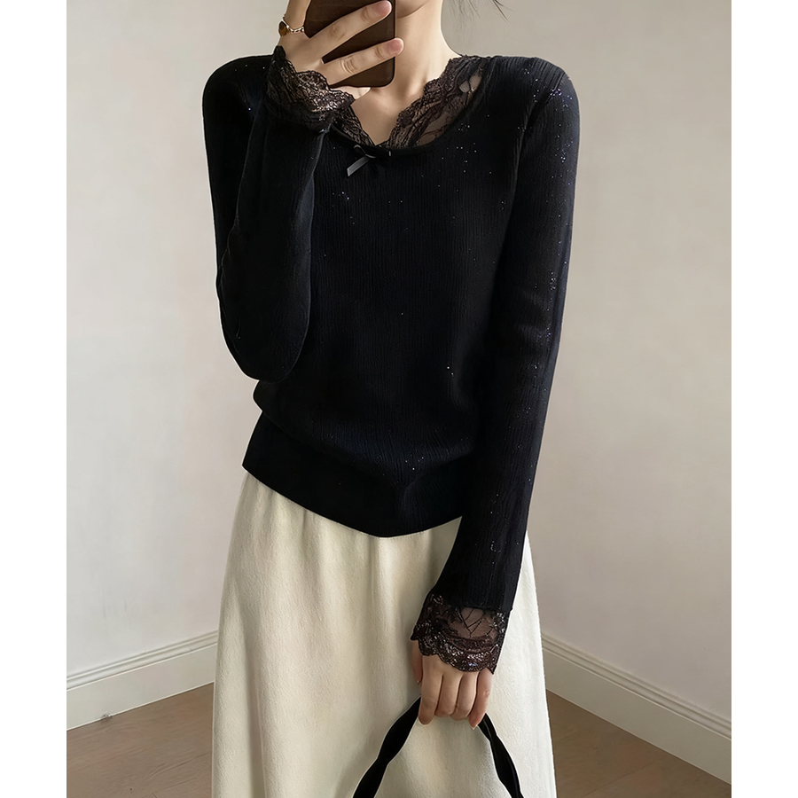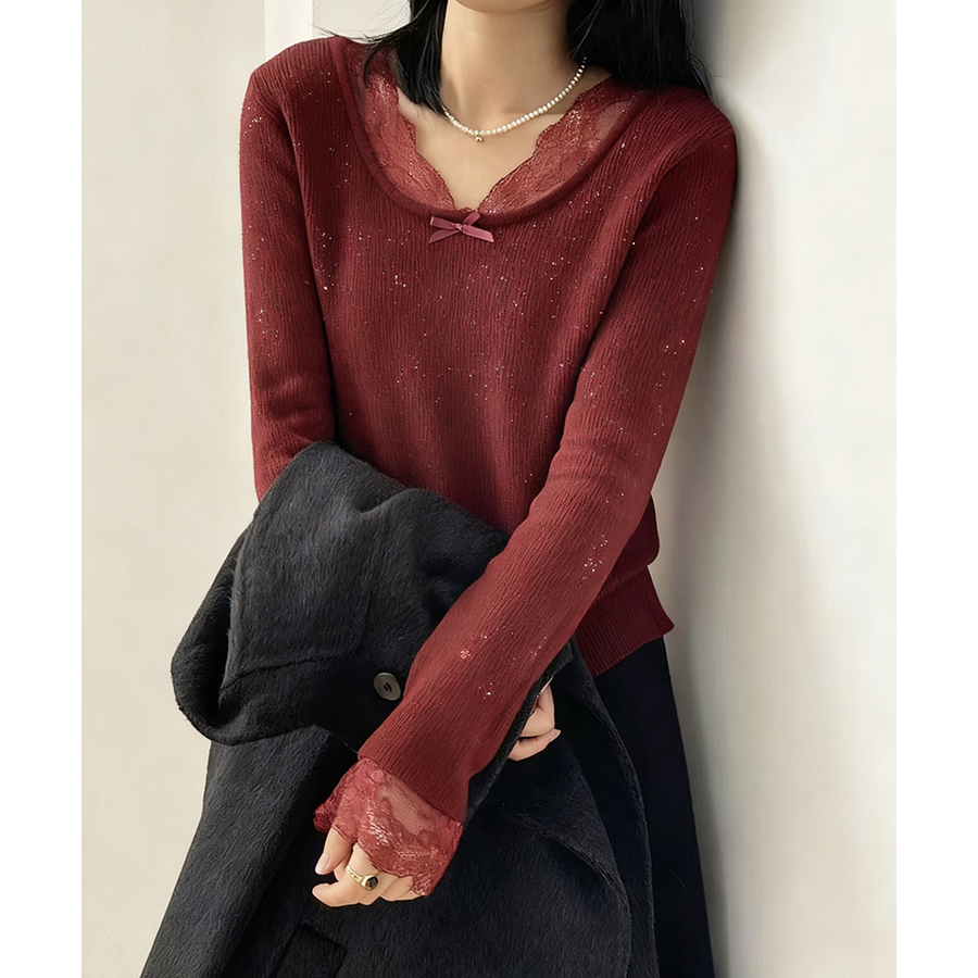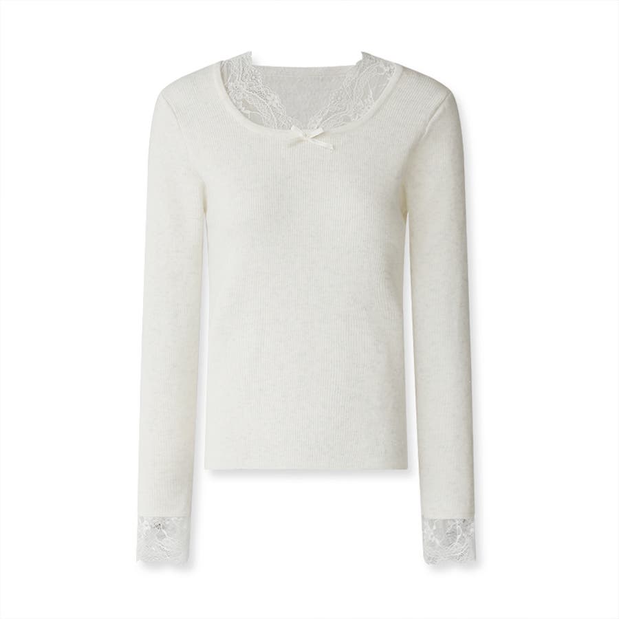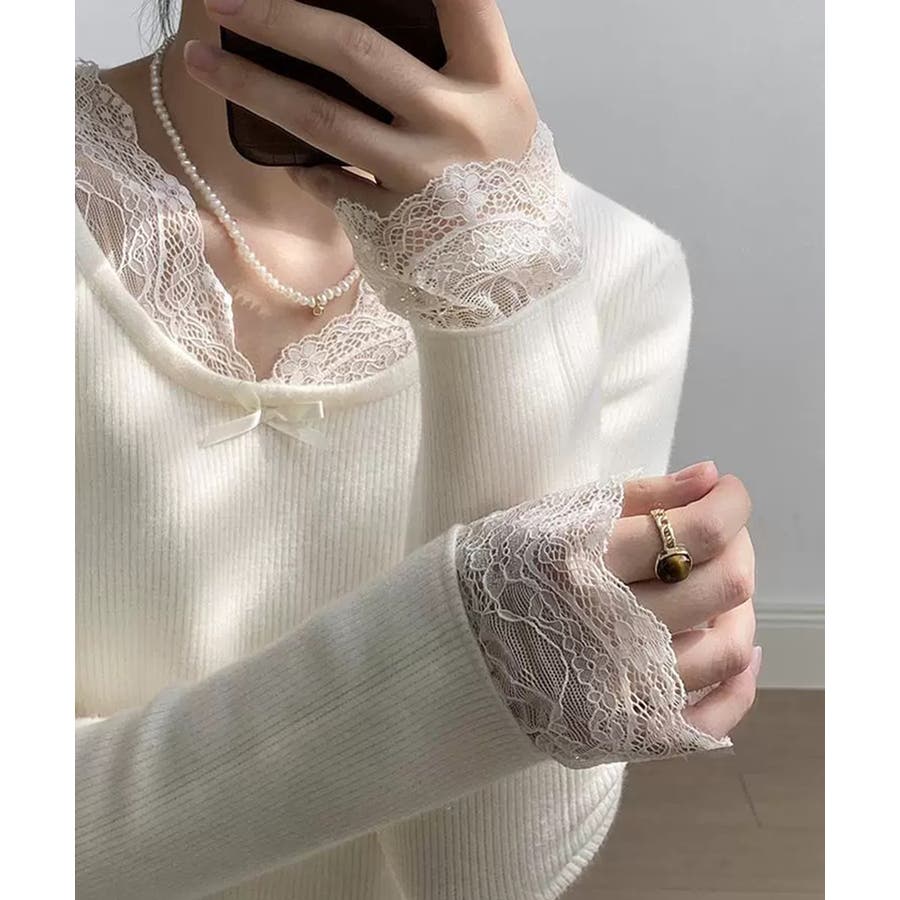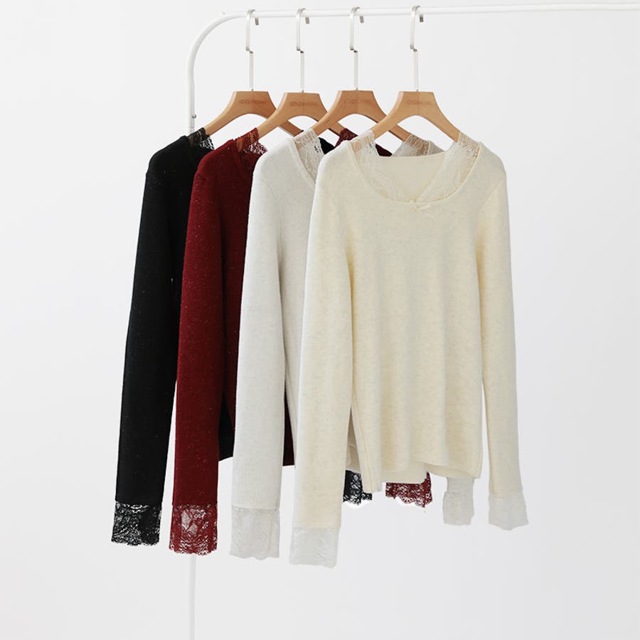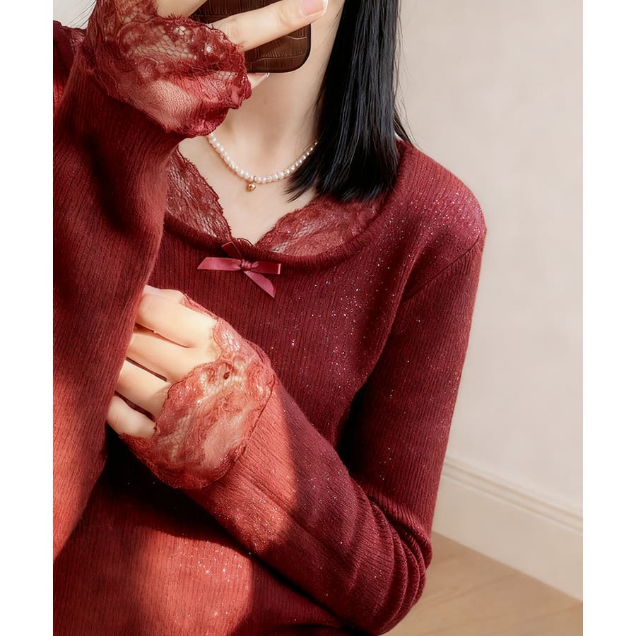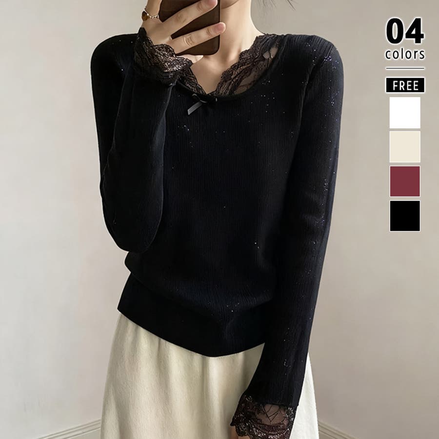 袖口と襟元にあしらわれた 繊細レースとラメ感が 女性らしいレースニット。 胸元の小さなリボンが ポイントになり上品で 可愛らしい印象に。 やわらかな肌触りの裏起毛生地は、 伸縮性があり快適な着心地に。 トップスにもジャケットや コートのインナーとしても 活躍します。