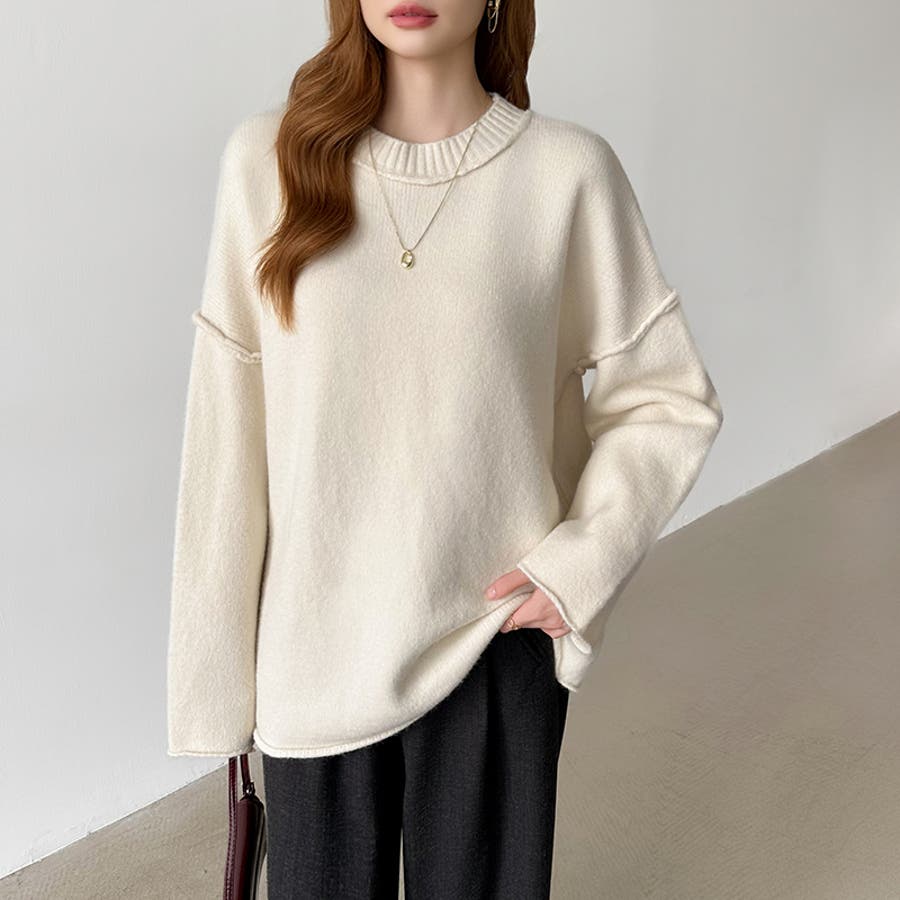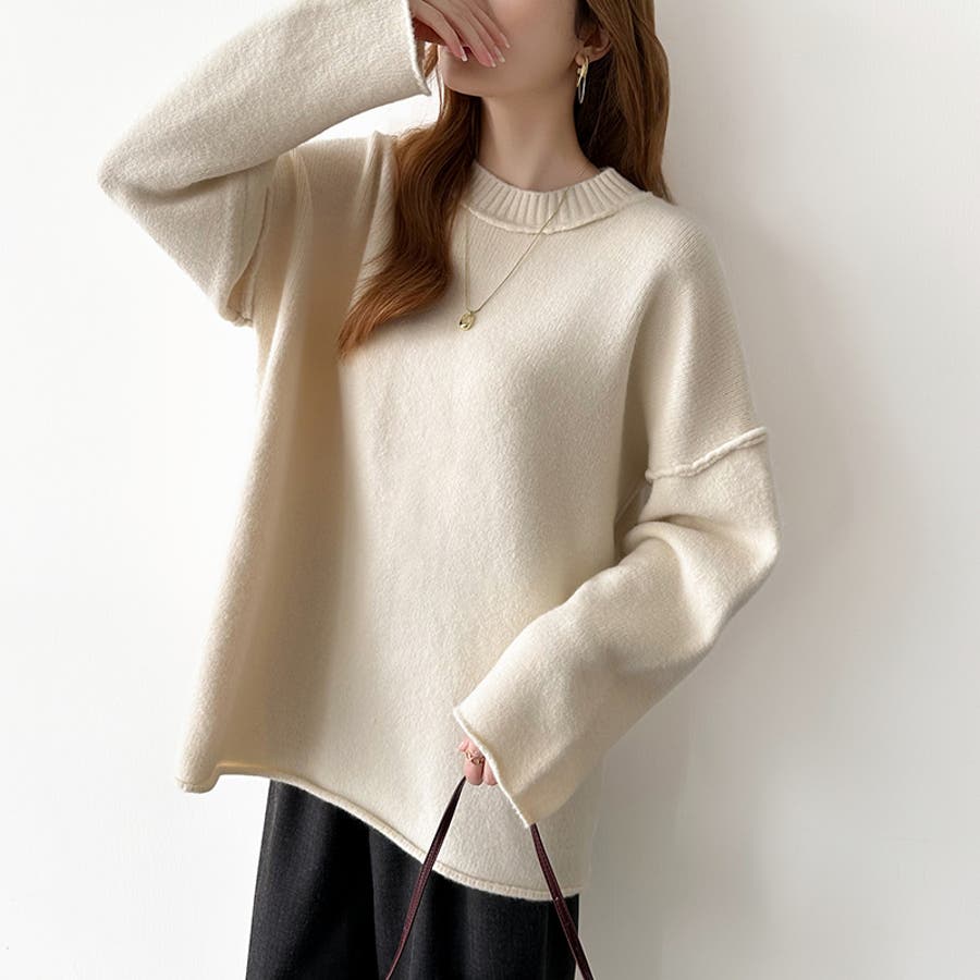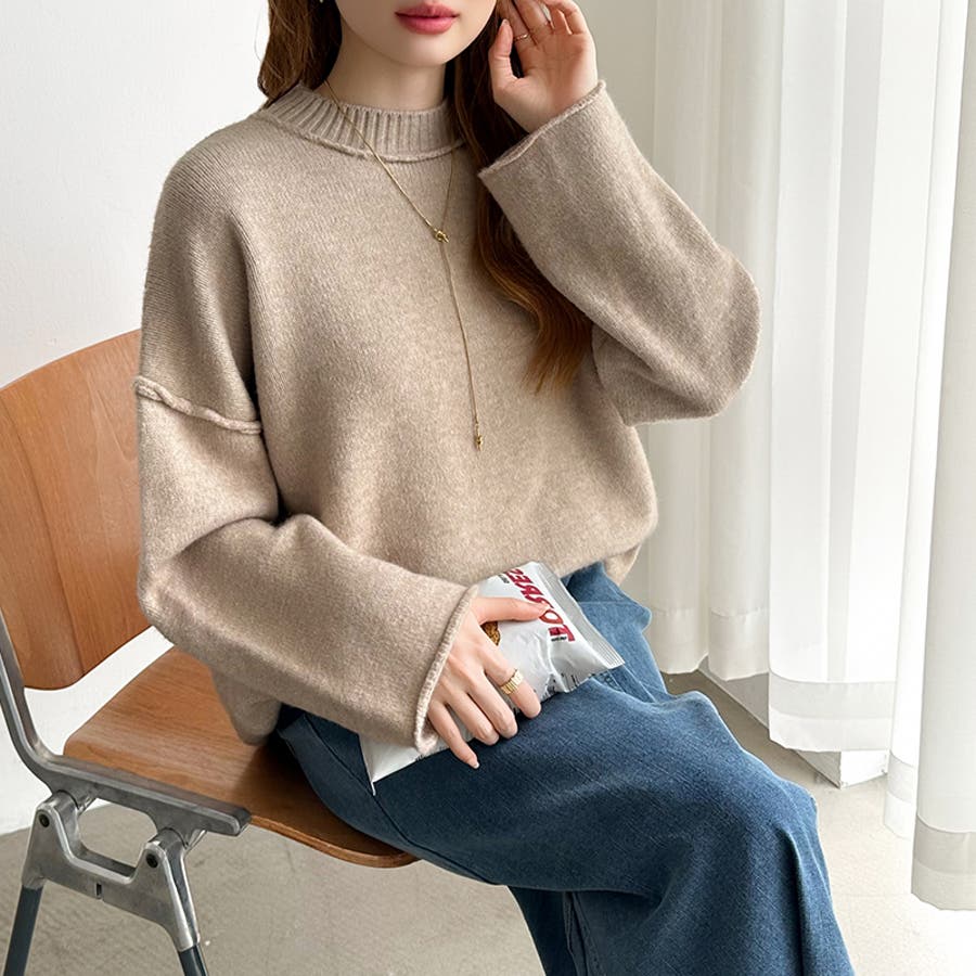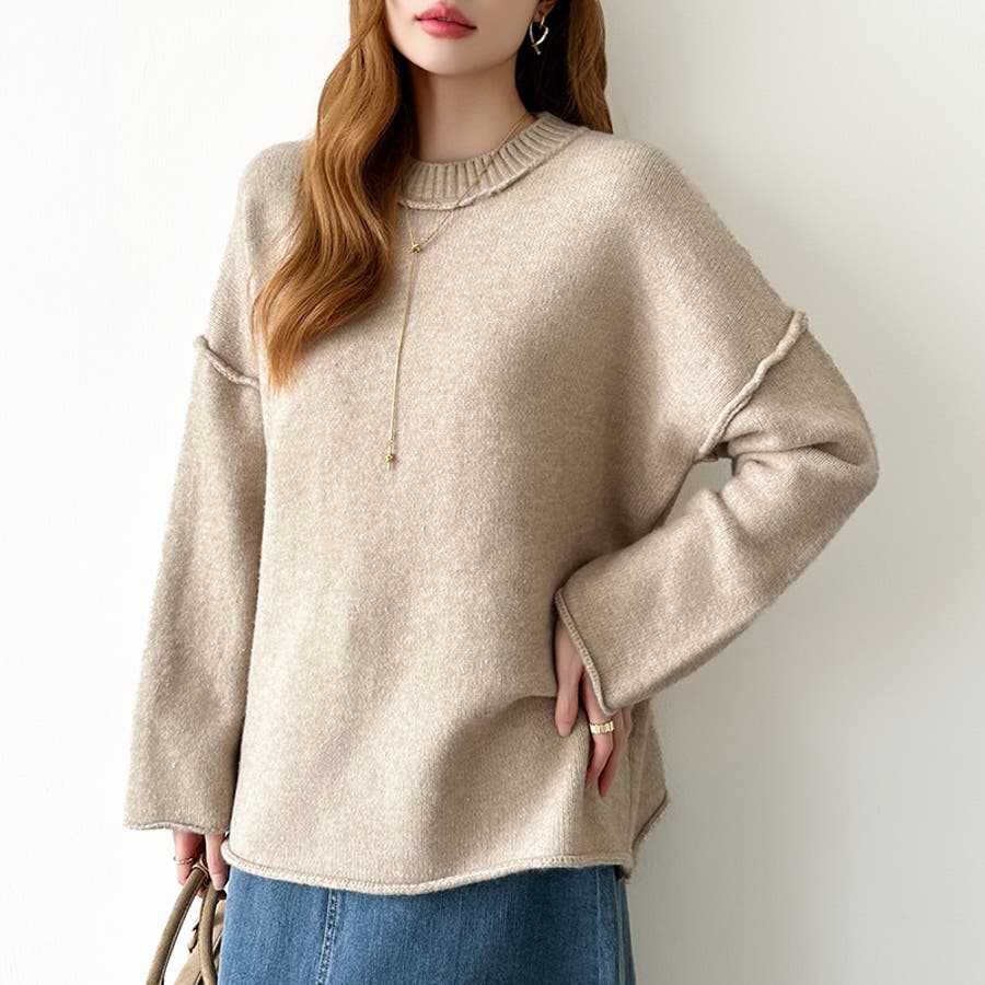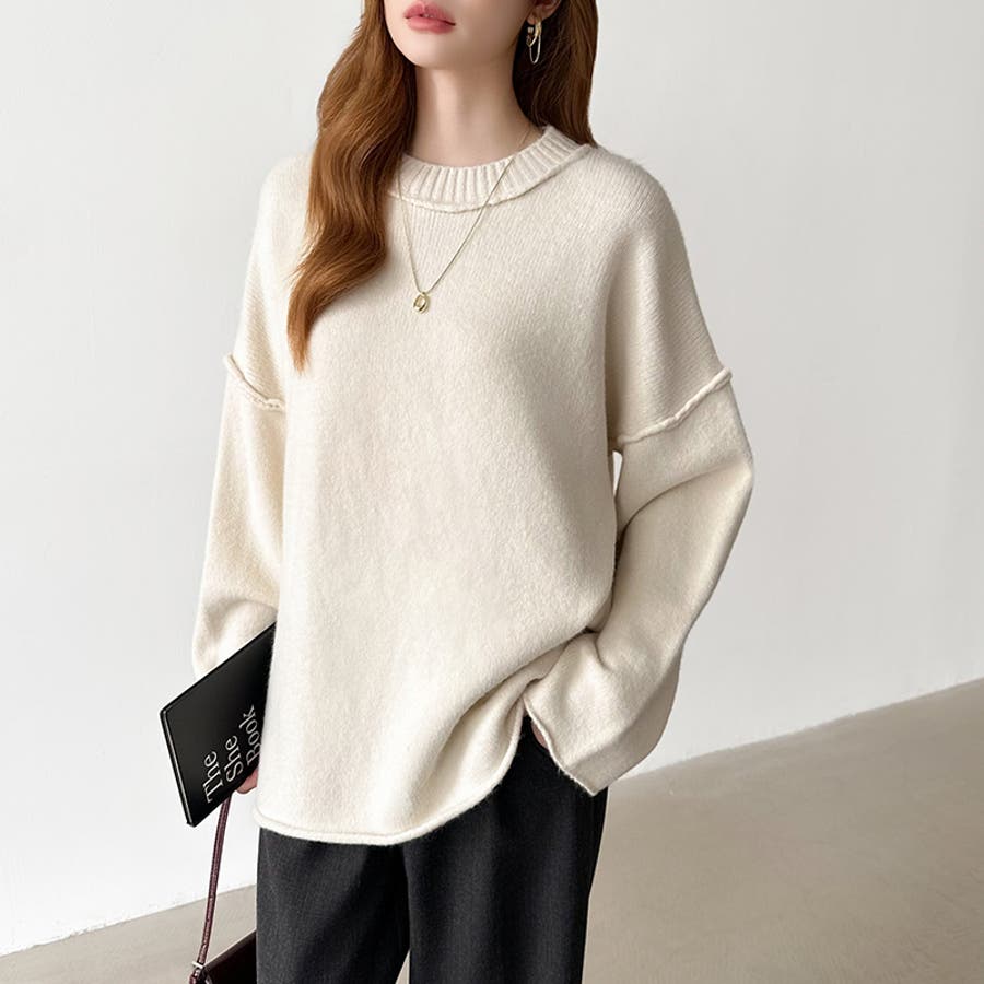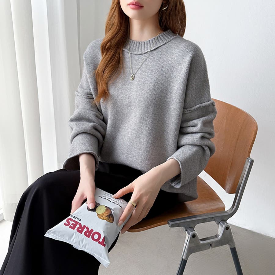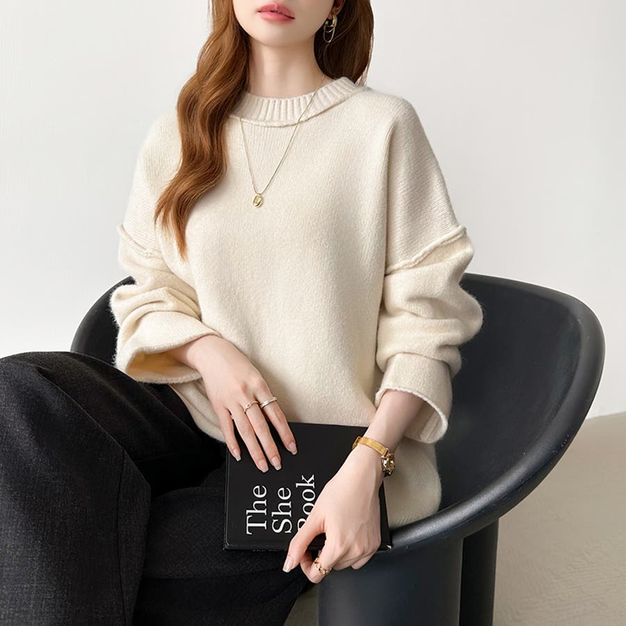肩から袖にかけて入った 切替ラインがアクセントを添える シームラインニット。 ゆったりシルエットで、 抜け感のある大人カジュアルを 楽しめる一枚。 ヒップにかかる丈感でパンツや スカートどちらにも合わせやすい 万能アイテムです。