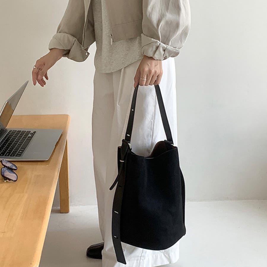 やわらかな質感とマットな風合いが 魅力のフェイクスエードバッグ。 丸みのあるバケツ型シルエット がほどよい抜け感を演出し、 マグネット開閉で出し入れも スムーズ。 肩紐は自分サイズに長さ調整可能、 必要な物はしっかり収まる 便利なサイズ感。