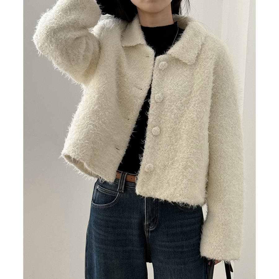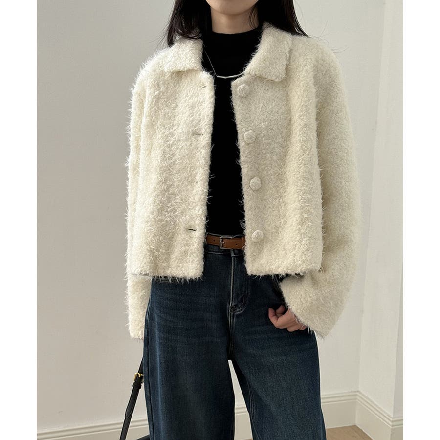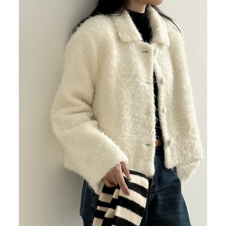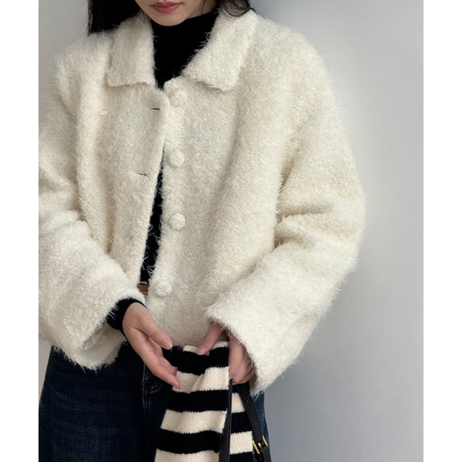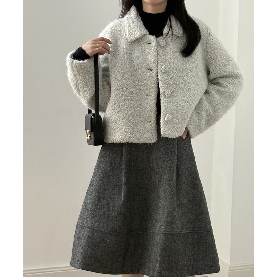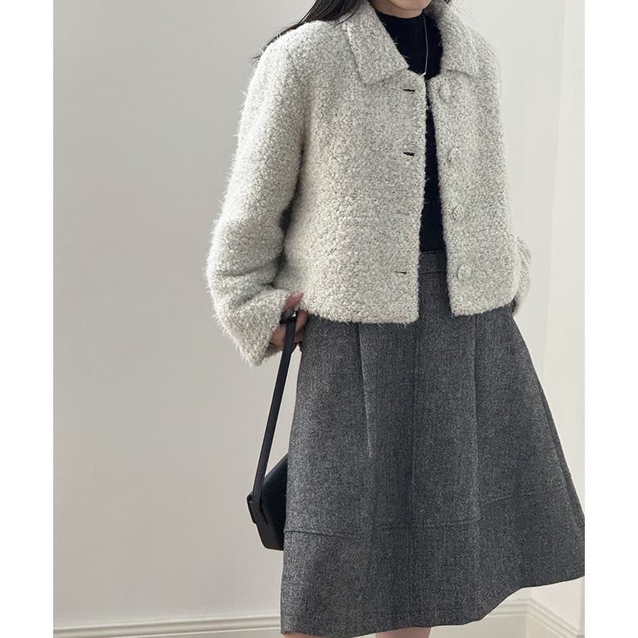 ふんわりとしたブークレ素材が魅力の ブークレショートジャケット。 襟付きのデザインにフロントの くるみボタンが優しいアクセントに。 ショート丈でスカートにもパンツにも バランス良く着こなせてデイリーから お出かけスタイルまで幅広く活躍します。