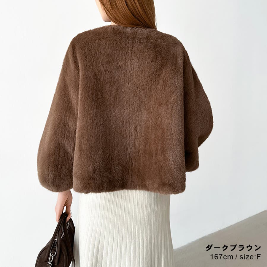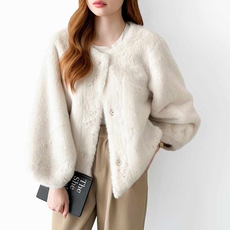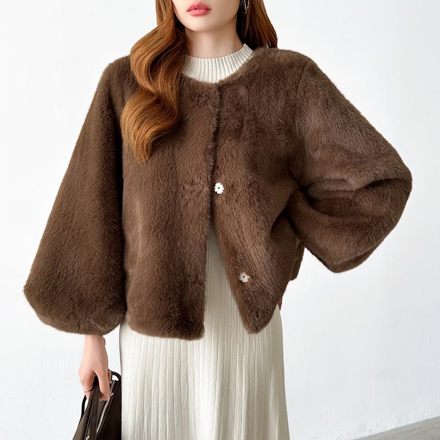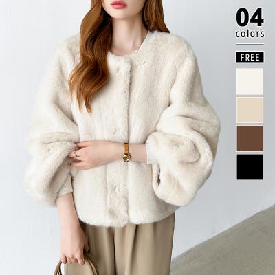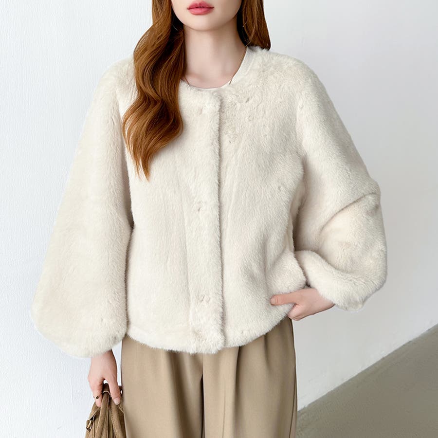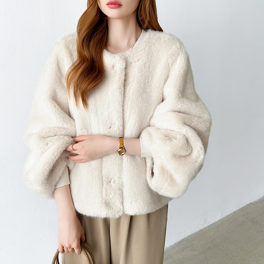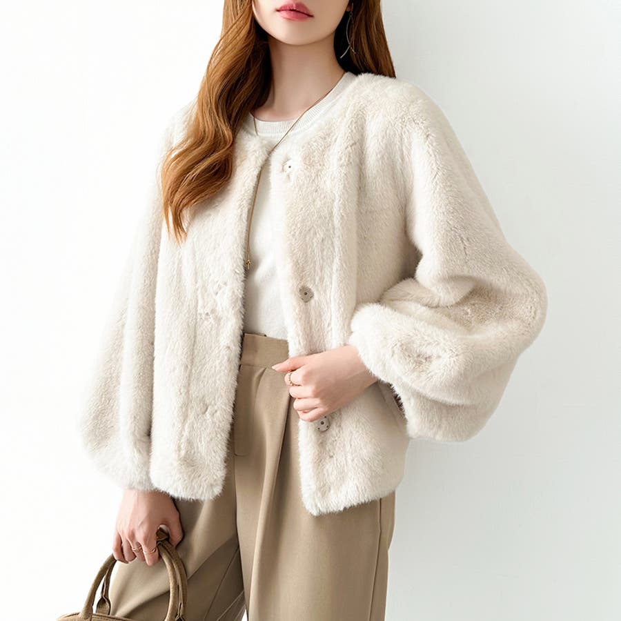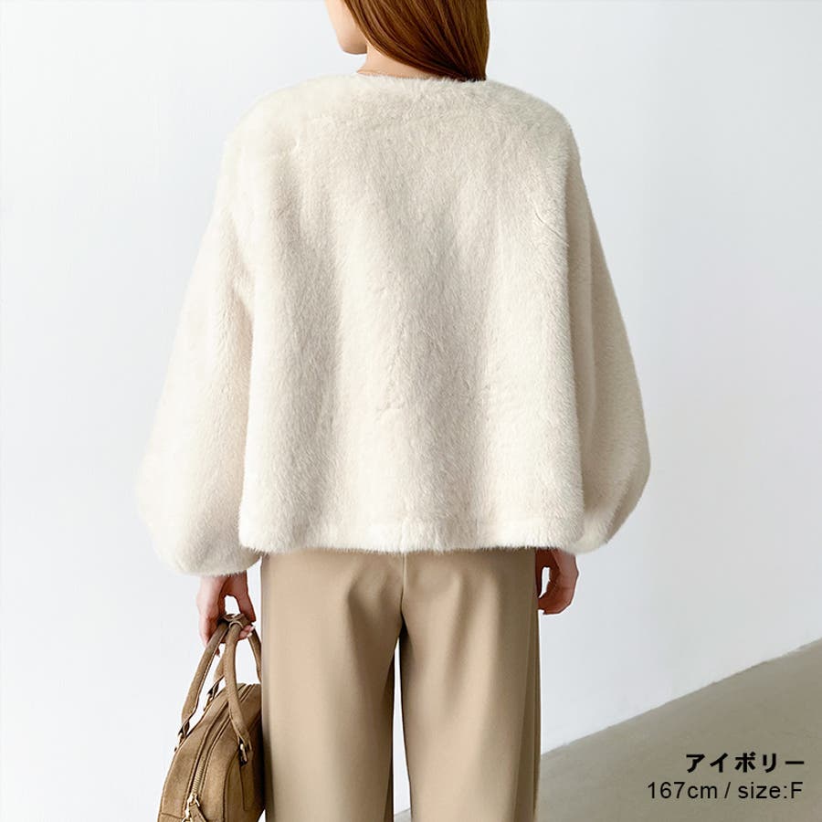 触れた瞬間、虜。ミンクタッチの フェイクファーショートコート。 ゆったりとボリュームを持たせた スリーブデザインと隠しスナップ ボタン仕様で、ミニマルで上品な印象に。 きめ細やかなしっとりと柔らかな 肌触りで羽織るだけで冬コーデを ぐっと格上げしてくれます。