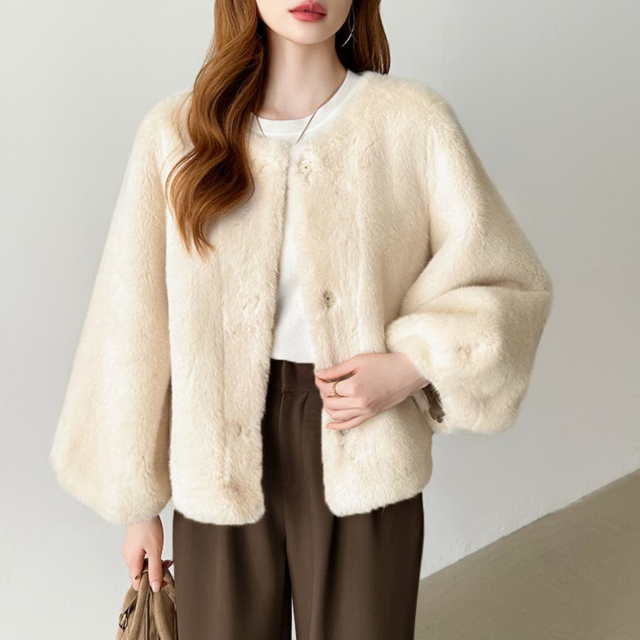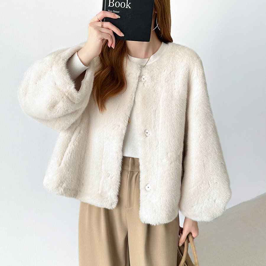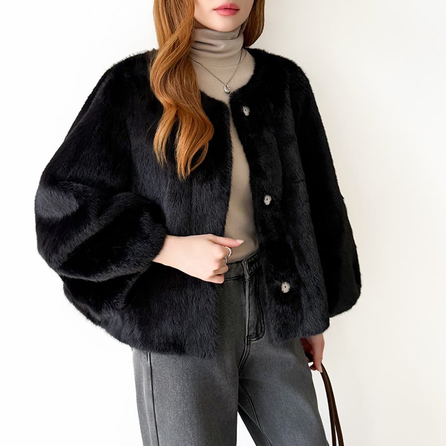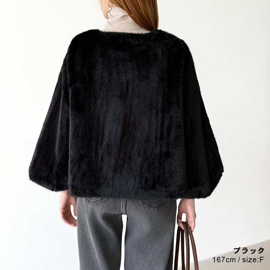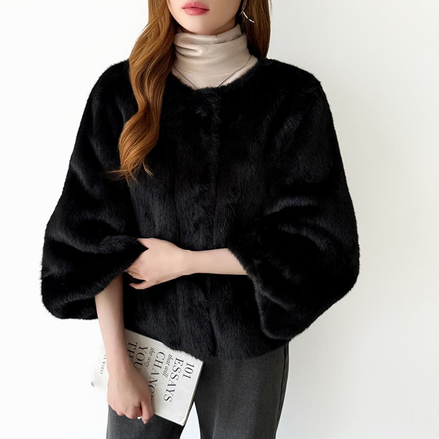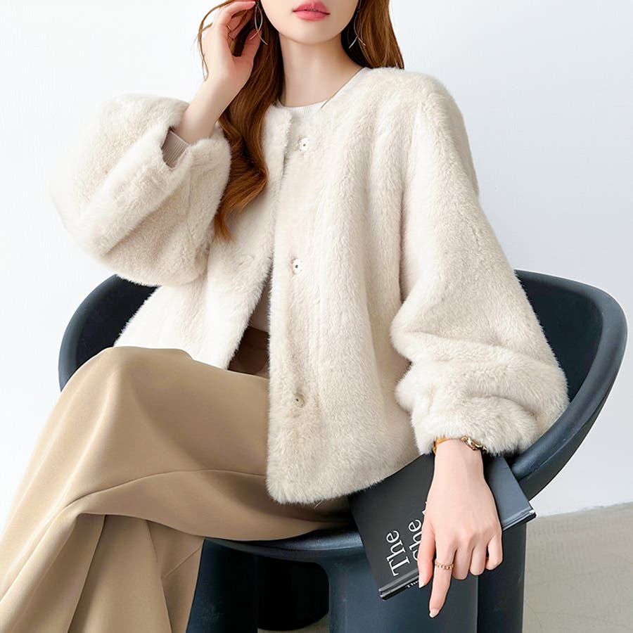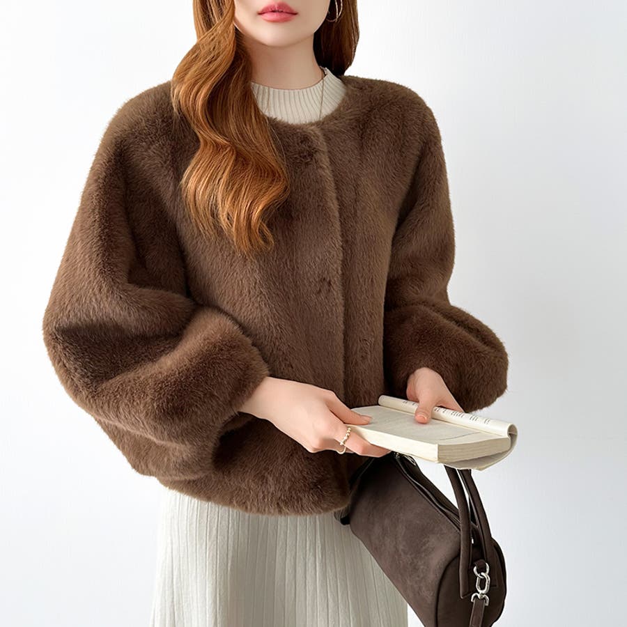 触れた瞬間、虜。ミンクタッチの フェイクファーショートコート。 ゆったりとボリュームを持たせた スリーブデザインと隠しスナップ ボタン仕様で、ミニマルで上品な印象に。 きめ細やかなしっとりと柔らかな 肌触りで羽織るだけで冬コーデを ぐっと格上げしてくれます。