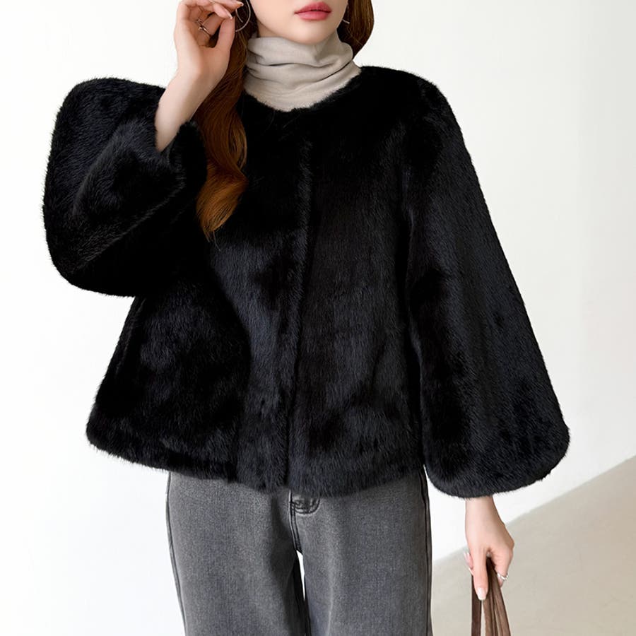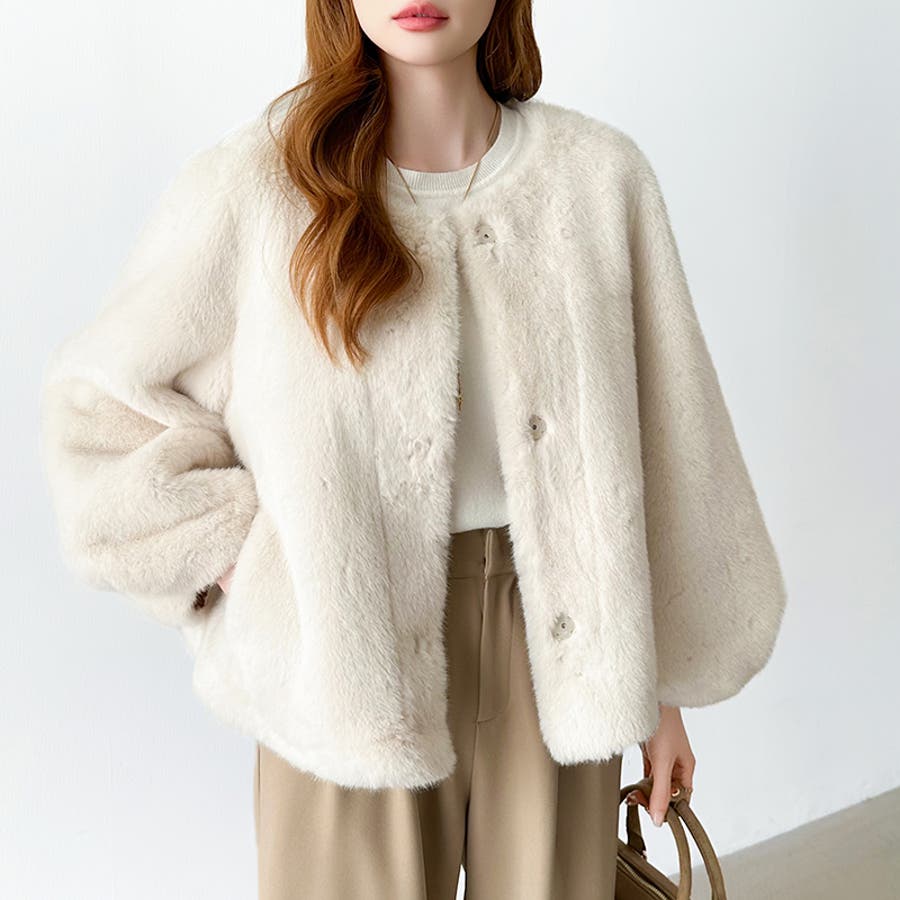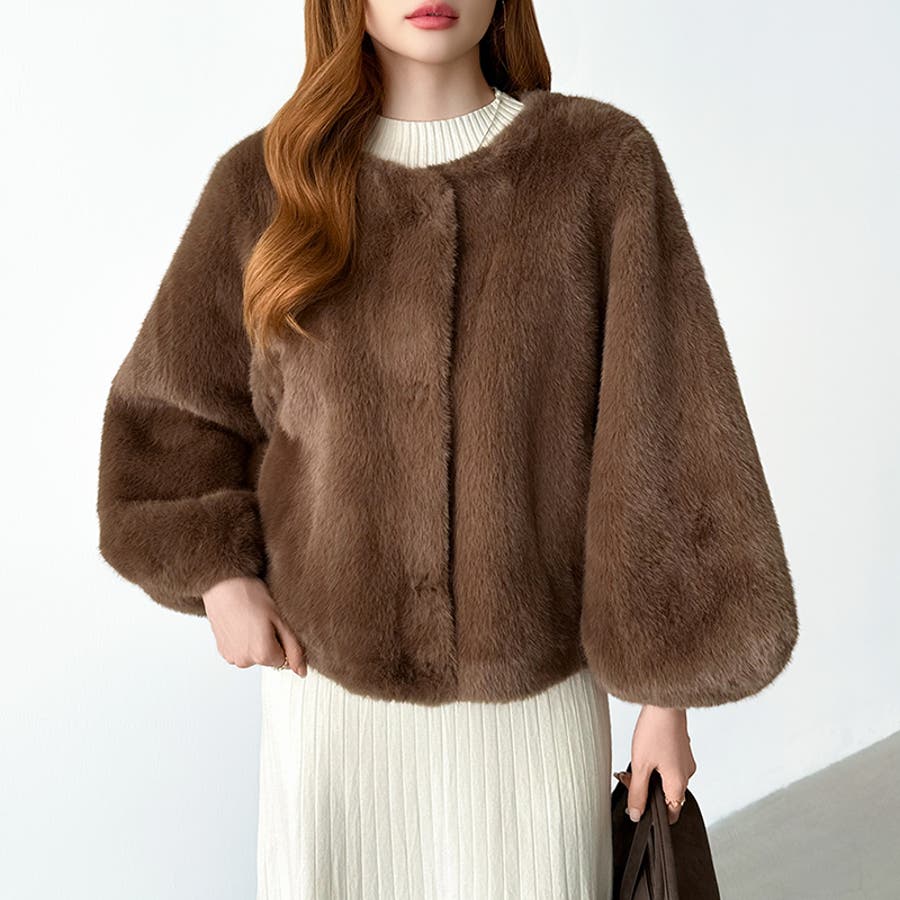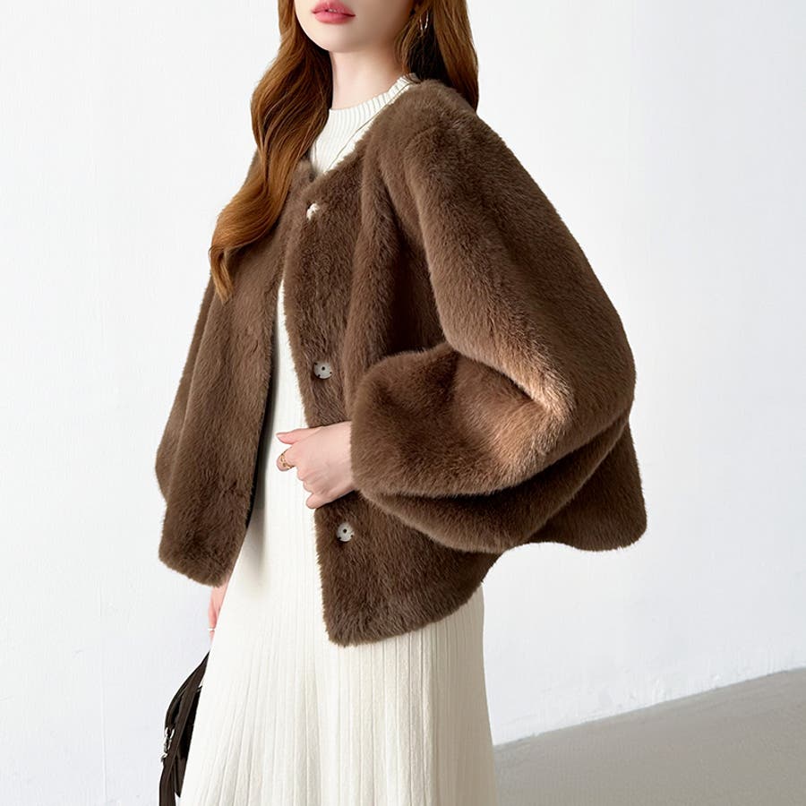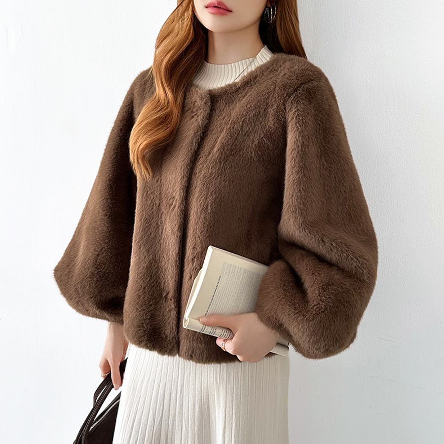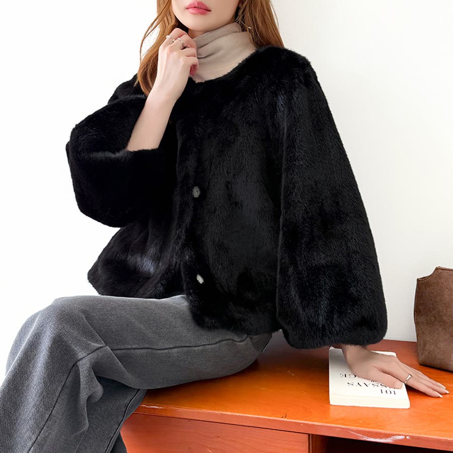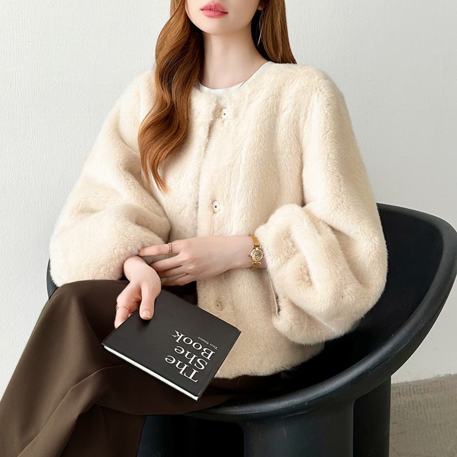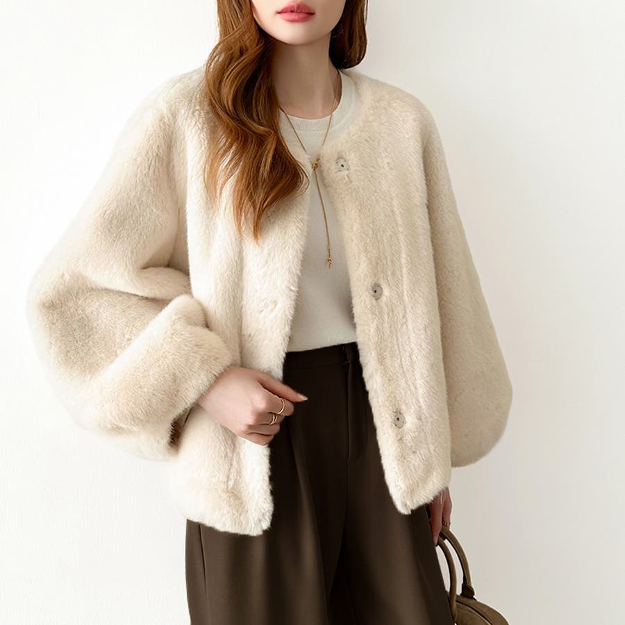 触れた瞬間、虜。ミンクタッチの フェイクファーショートコート。 ゆったりとボリュームを持たせた スリーブデザインと隠しスナップ ボタン仕様で、ミニマルで上品な印象に。 きめ細やかなしっとりと柔らかな 肌触りで羽織るだけで冬コーデを ぐっと格上げしてくれます。