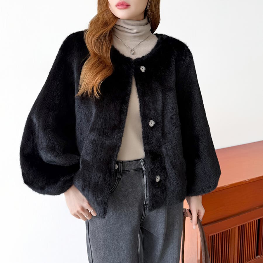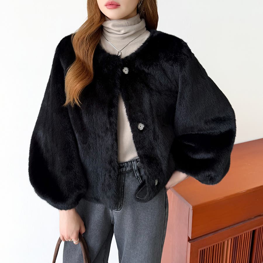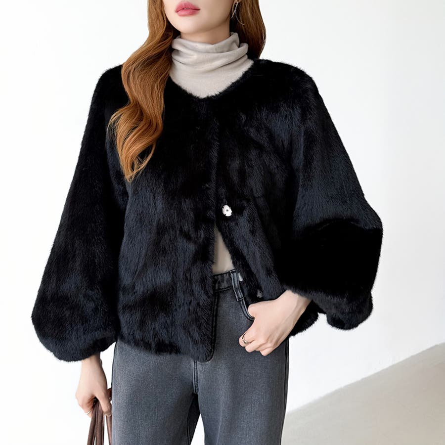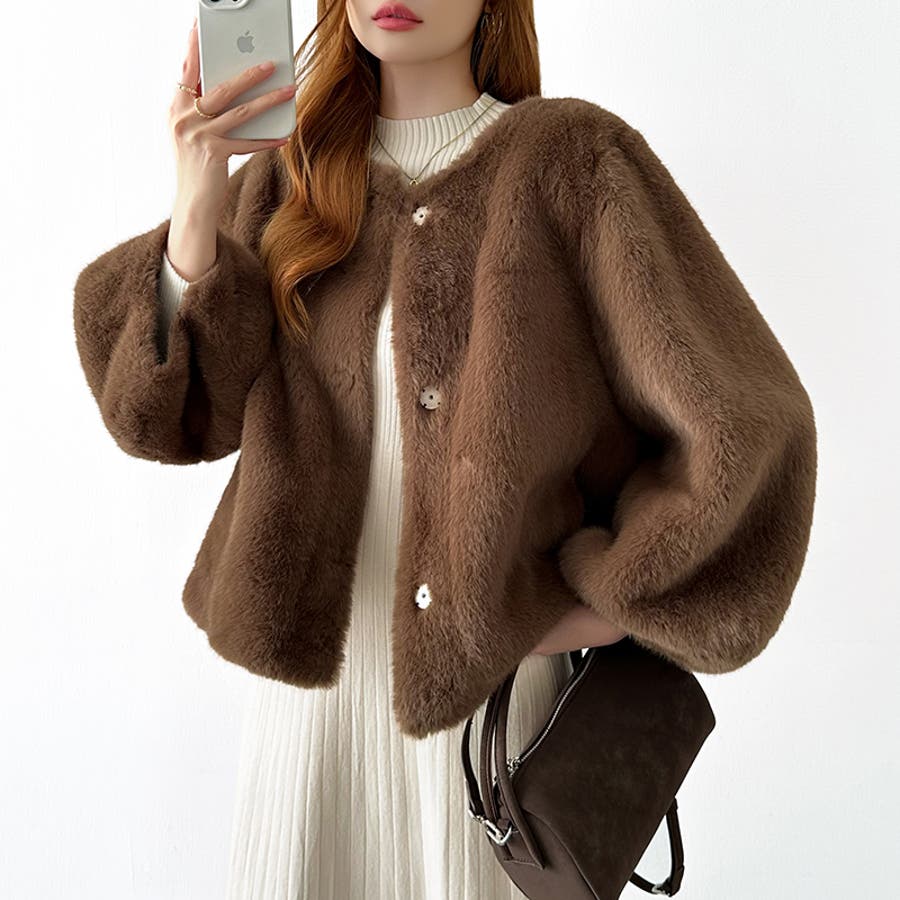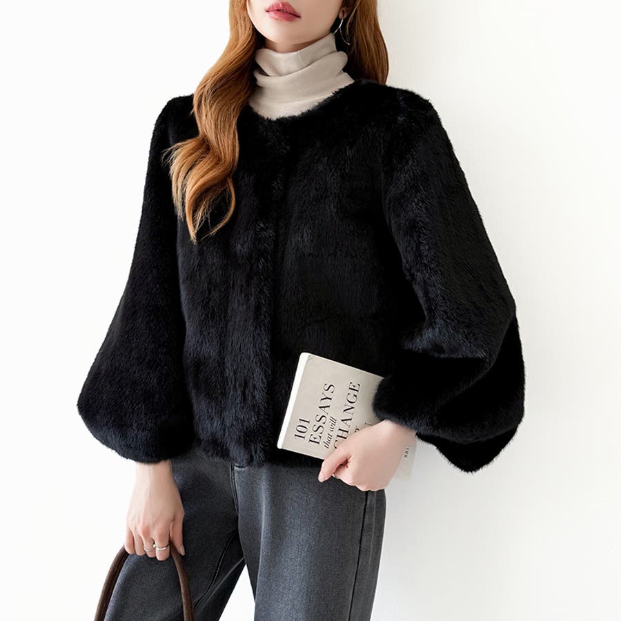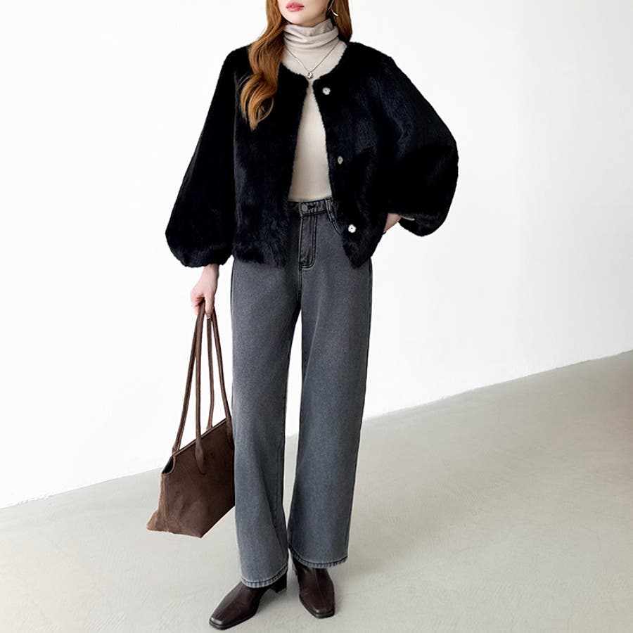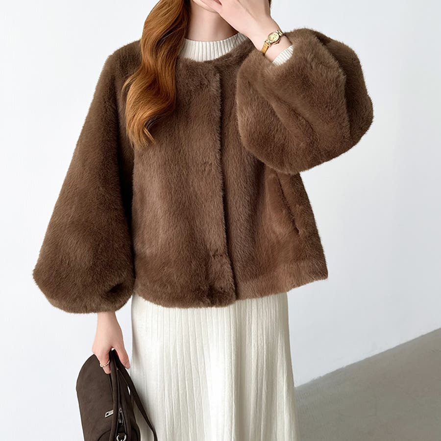 触れた瞬間、虜。ミンクタッチの フェイクファーショートコート。 ゆったりとボリュームを持たせた スリーブデザインと隠しスナップ ボタン仕様で、ミニマルで上品な印象に。 きめ細やかなしっとりと柔らかな 肌触りで羽織るだけで冬コーデを ぐっと格上げしてくれます。