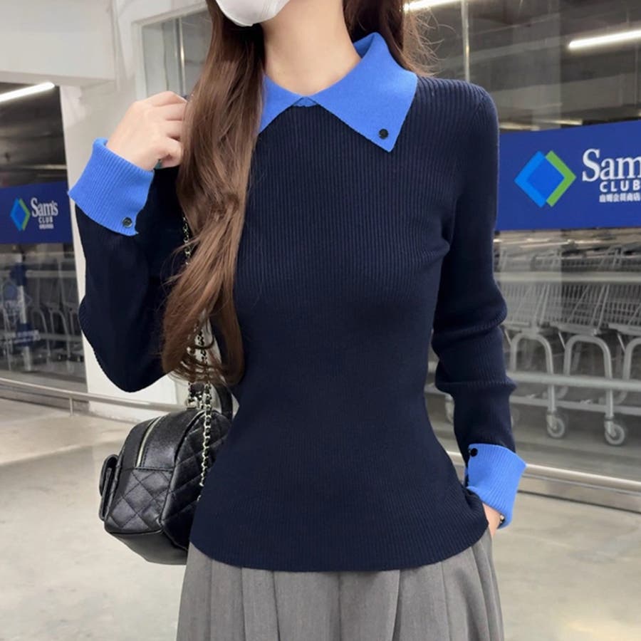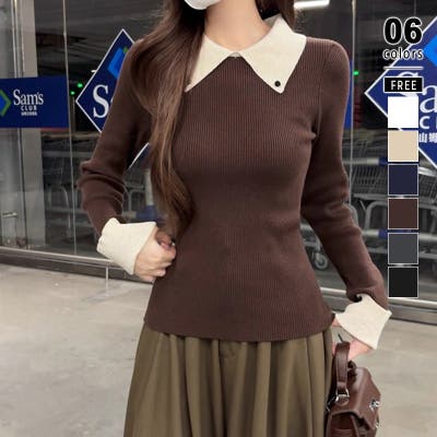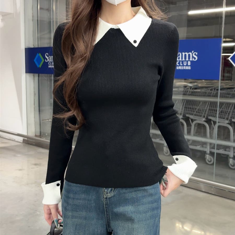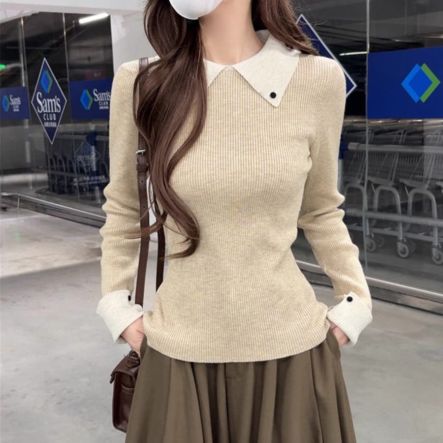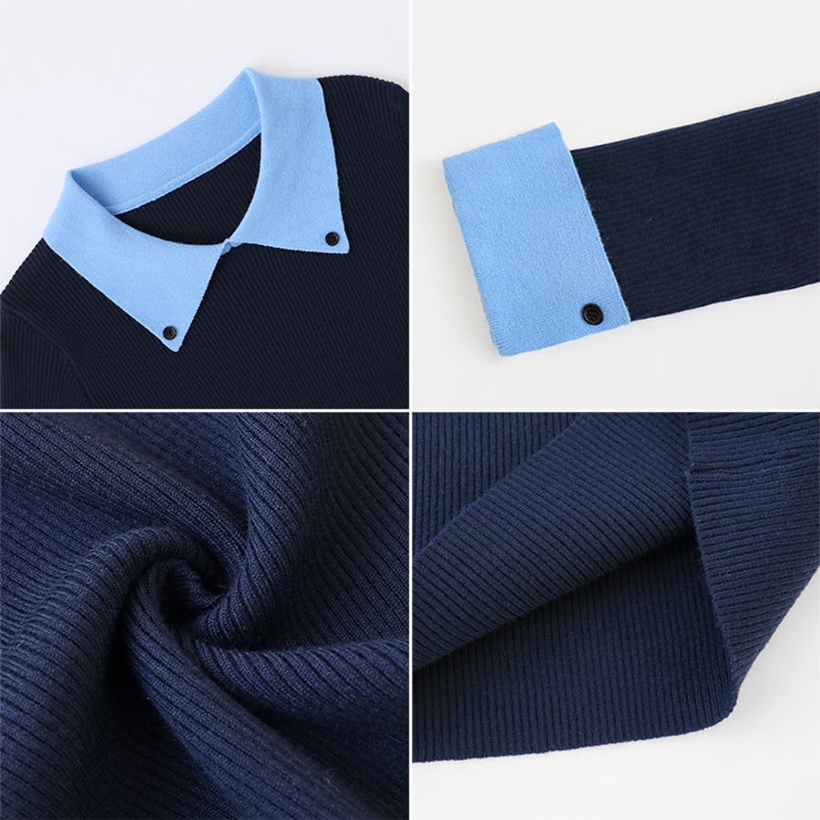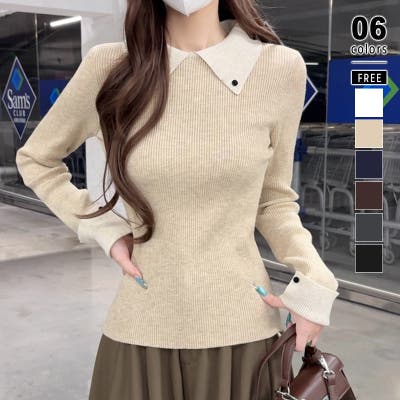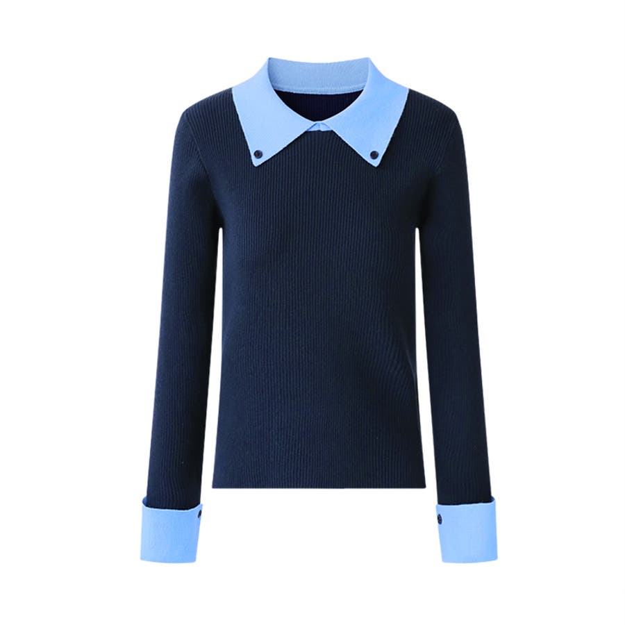 シャツを重ね着したような レイヤード風襟付きニット。 リブニット仕立てですっきりと、 襟と袖口の配色デザインが目を惹き コーデをキュッと引き締めてくれます。 きれいめカジュアルや大人フェミニン など幅広いシーンで活躍します。