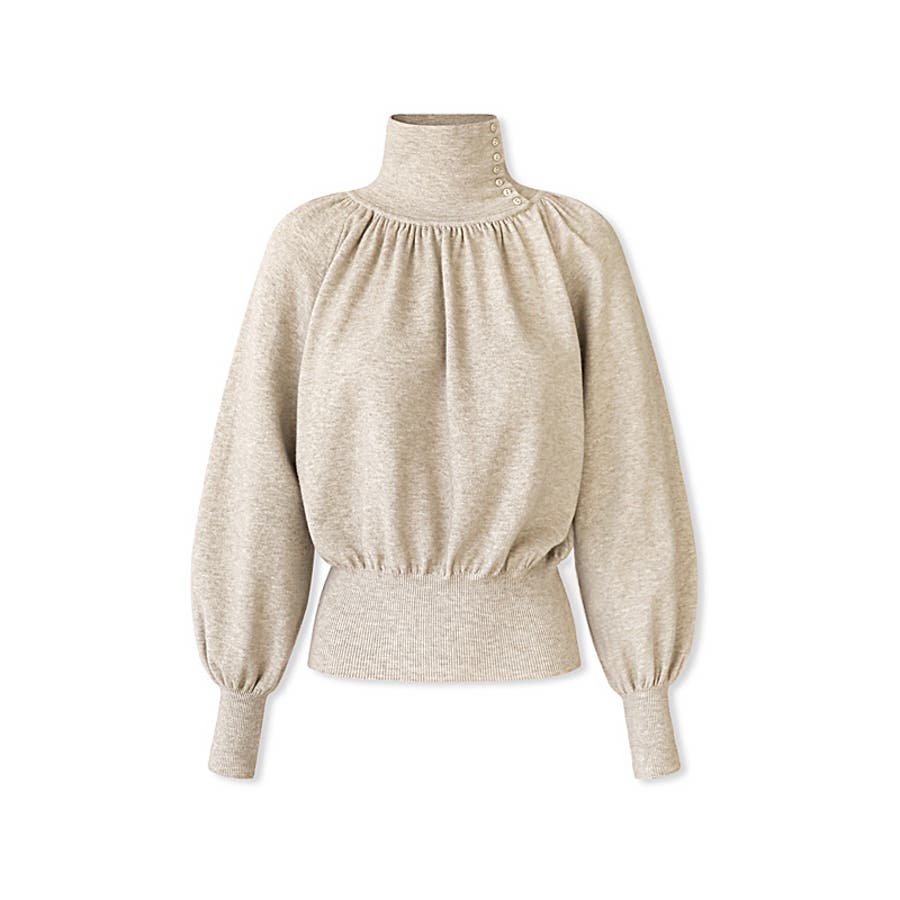 女性らしいドレープが美しい 2wayネック仕様の バルーンスリーブトップス。 首元はハイネックと折り返しの 2パターンで楽しめ、コーデの 雰囲気を自在にチェンジ。 ふんわりとしたバルーンスリーブと メリハリを作るリブ切り替えが 立体シルエットを演出します。 柔らかく滑らかなレーヨン混素材で 着心地も抜群。大人フェミニンを 叶える一枚です。