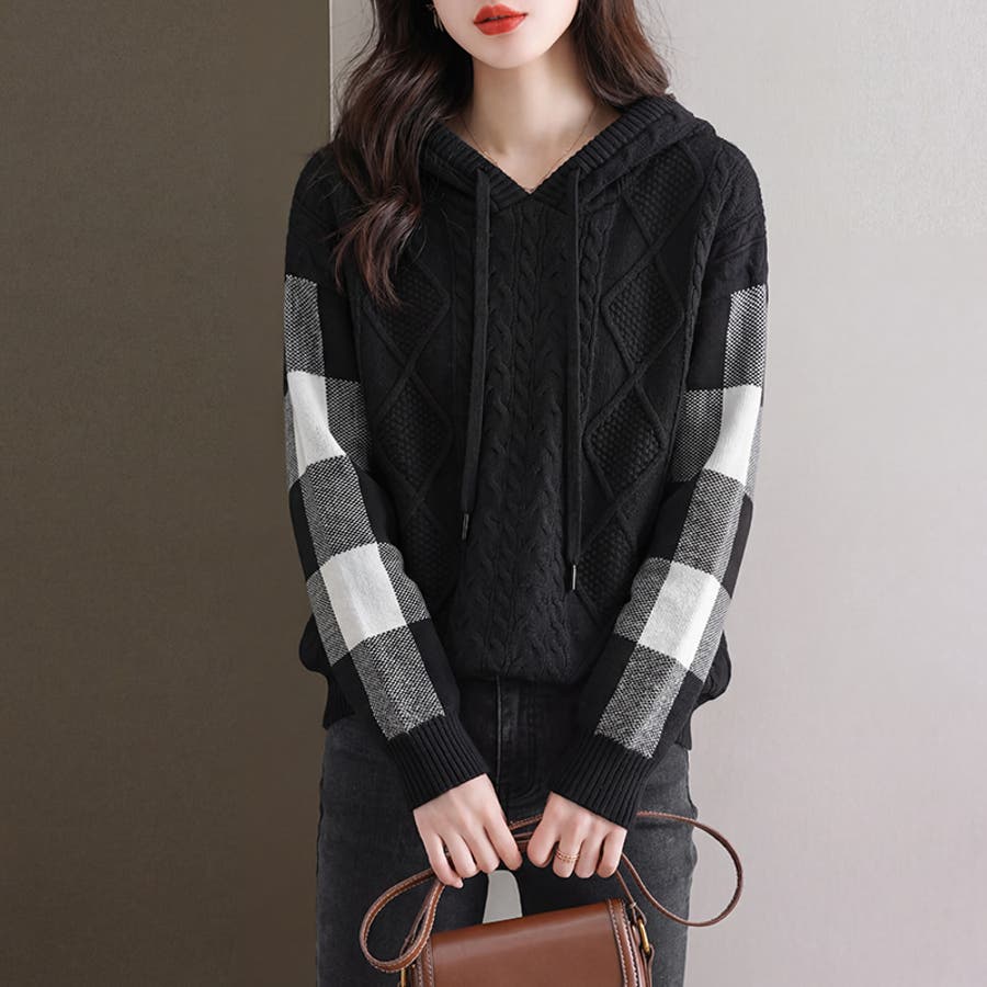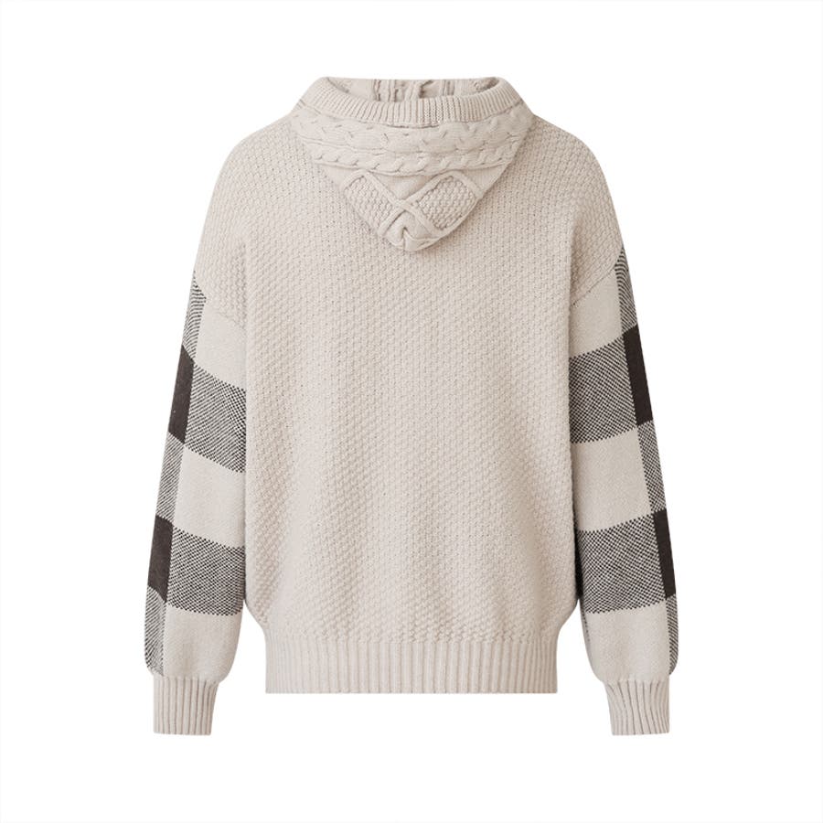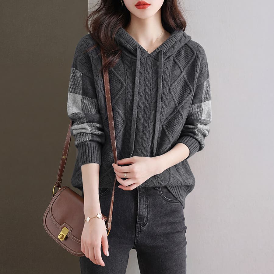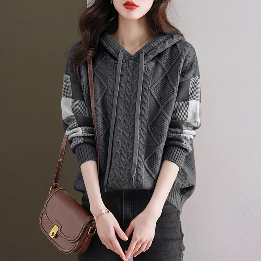 立体感のあるケーブル編みと 袖のチェック柄が魅力の ケーブルニットパーカー。 フロントの編み模様がシンプルに なりがちなニットスタイルに 存在感をプラスします。 袖のチェック柄デザインが全体の アクセントとなり、女性らしい 柔らかさを感じる一枚です。