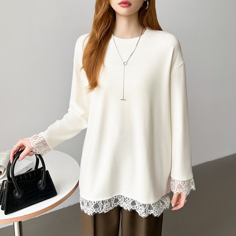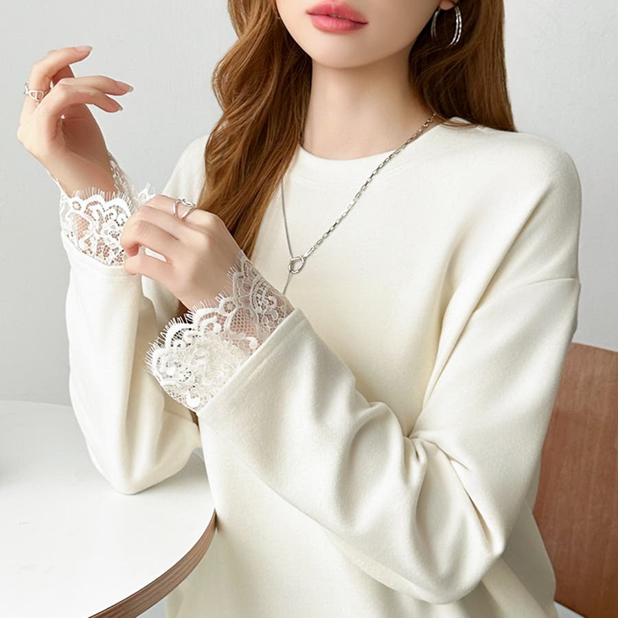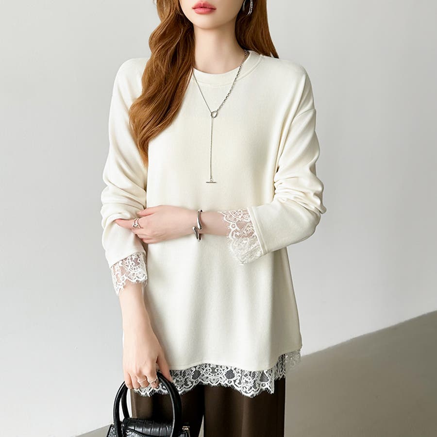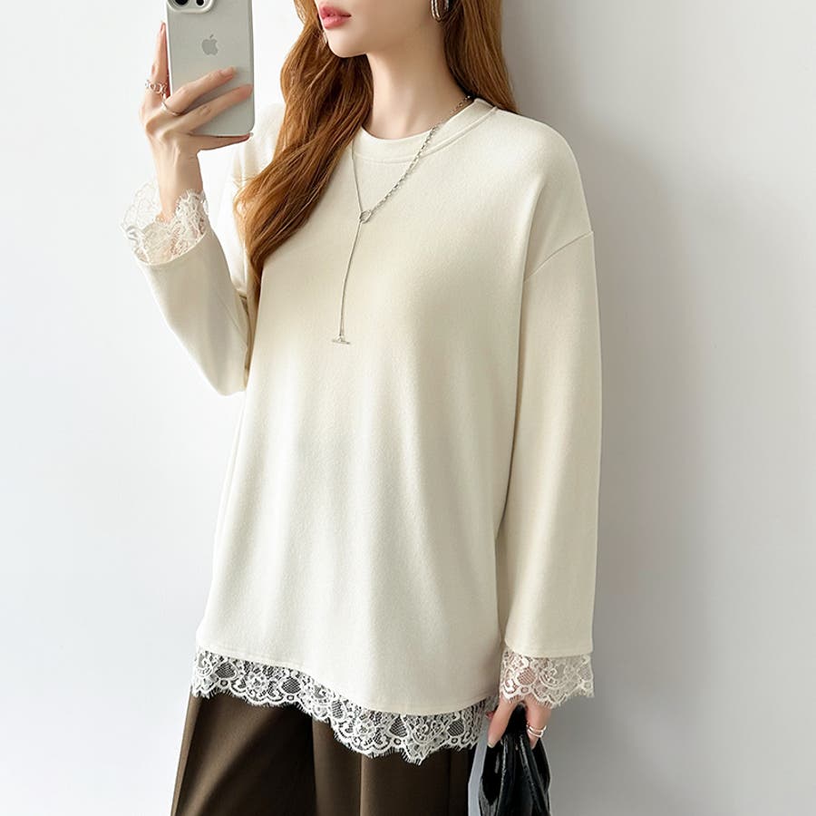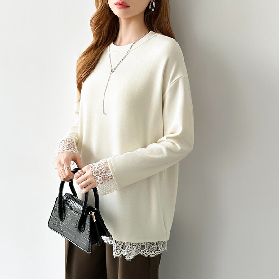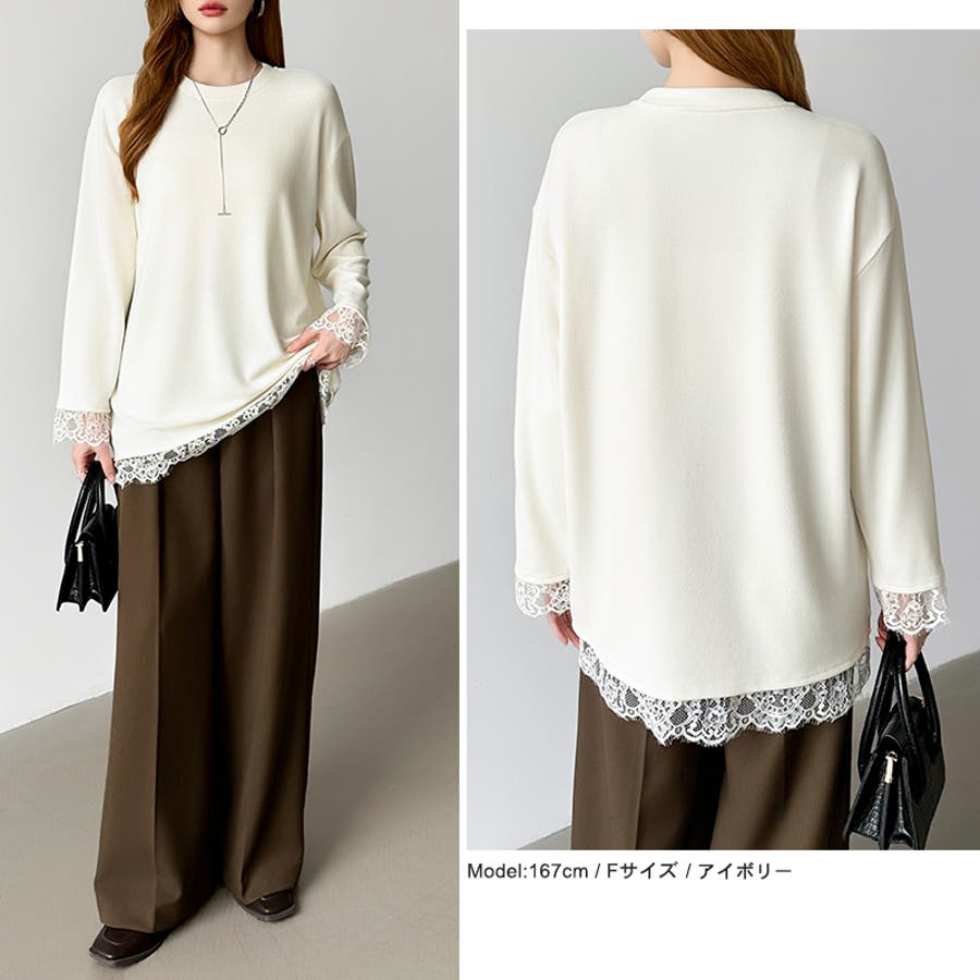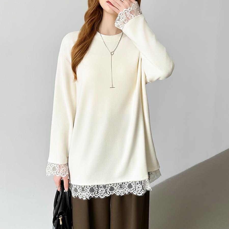 女性らしさをさりげなく引き立てる 袖口と裾に繊細なレースをあしらった レースカットソー。 ピーチスキンのしっとりとなめらかな 生地感が上品な風合いに。 ゆったりとしたシルエットで 体のラインを拾わずヒップも隠れる 長め丈が嬉しいポイント。 トップスとしてもインナーとして セーターやスウェットの下に重ねて、 レースをチラ見せしたコーデも楽しめます。