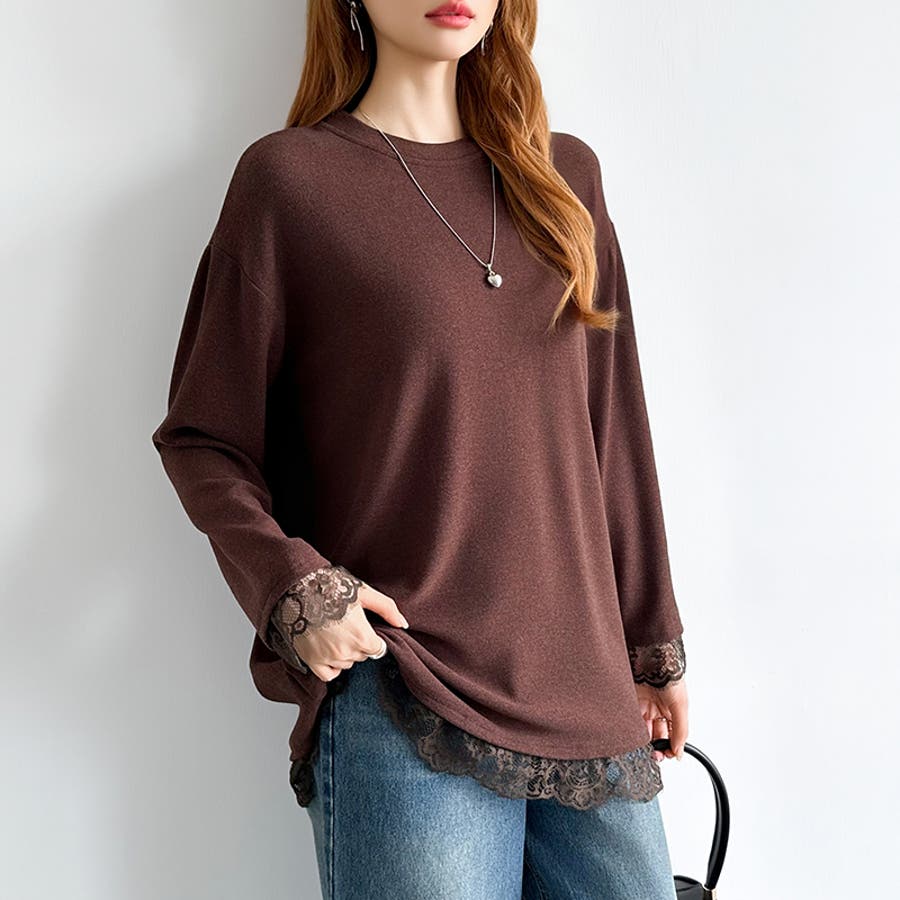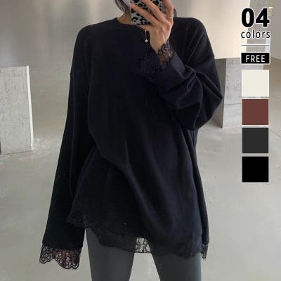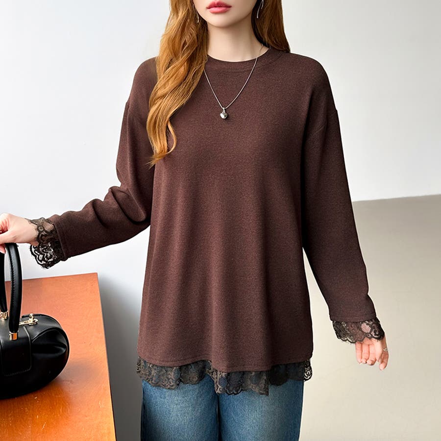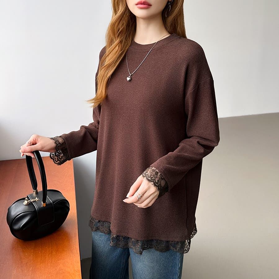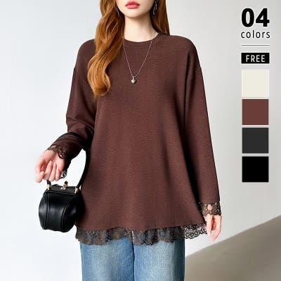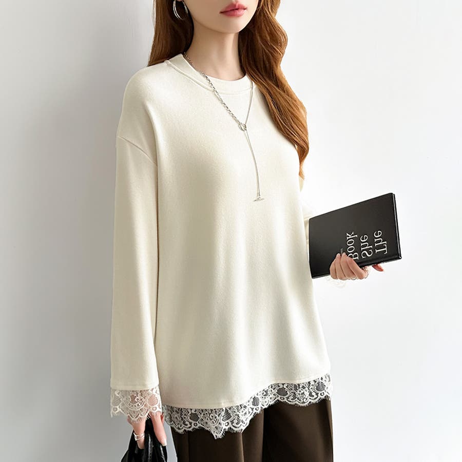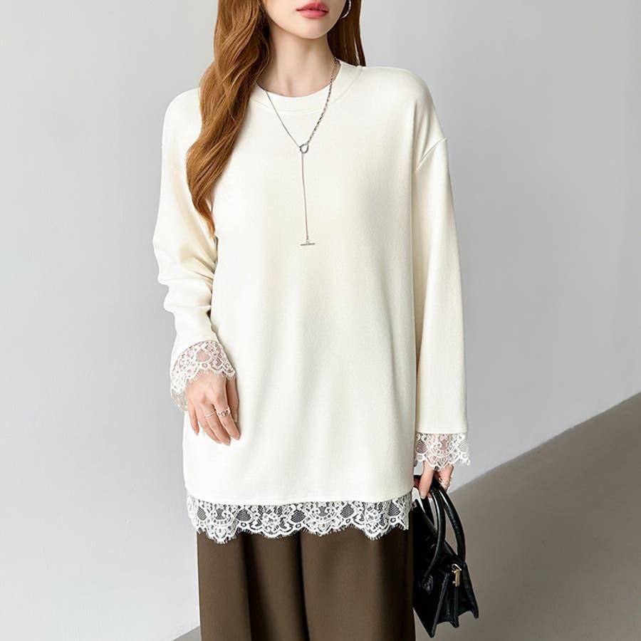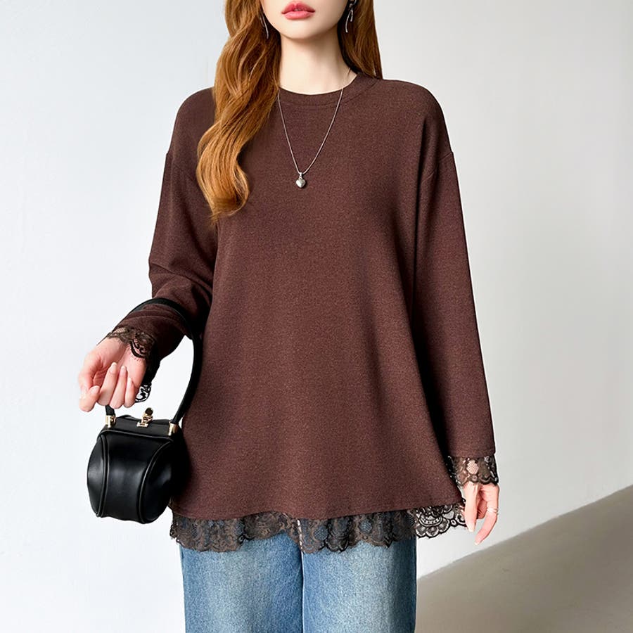 女性らしさをさりげなく引き立てる 袖口と裾に繊細なレースをあしらった レースカットソー。 ピーチスキンのしっとりとなめらかな 生地感が上品な風合いに。 ゆったりとしたシルエットで 体のラインを拾わずヒップも隠れる 長め丈が嬉しいポイント。 トップスとしてもインナーとして セーターやスウェットの下に重ねて、 レースをチラ見せしたコーデも楽しめます。