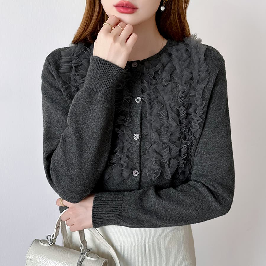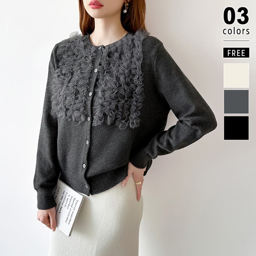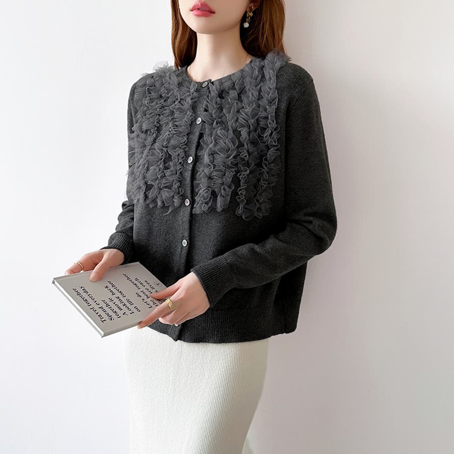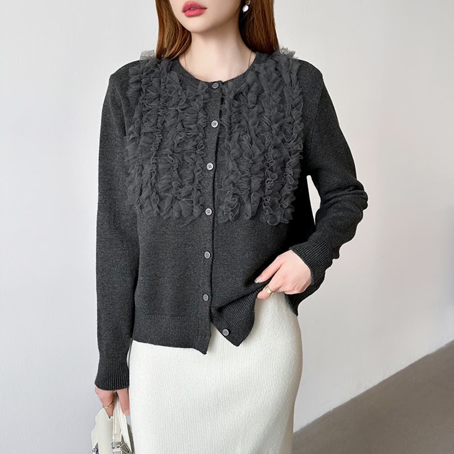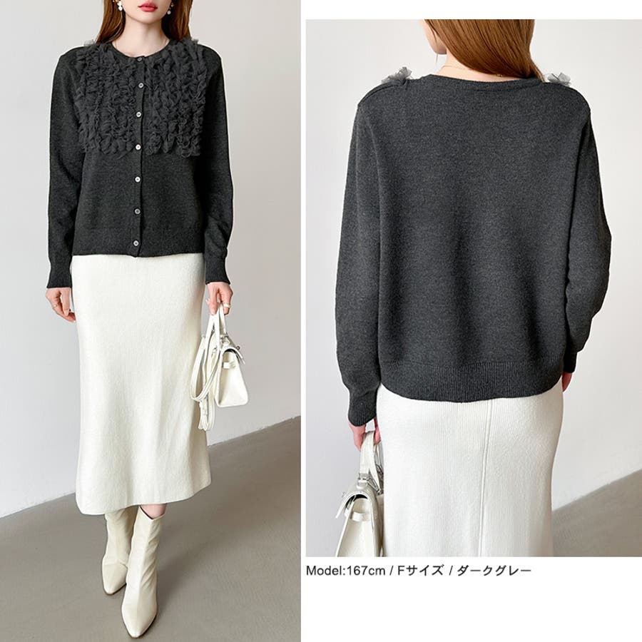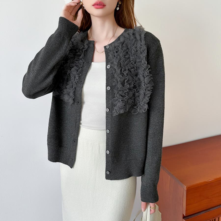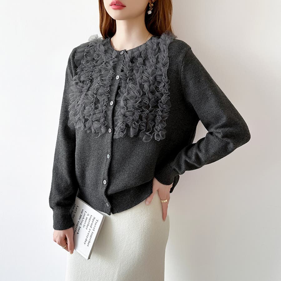 カーディガン チュールフリルカーディガン レディース チュール フリル ニットカーディガン きれいめ トップス 長袖 クルーネック 丸首 ニット クルーネックカーディガン オフィス オフィスカジュアル 大人 羽織 おしゃれ 重ね着 レイヤード ニットトップス きれいめカーディガン ニットカーデ ニットセーター 羽織り 羽織りもの 上着 tops 着回し 伸縮性 ストレッチ 前開き 前あき 柔らかい やわらかい 洗える 暖 暖かい あったかい セレモニー 食事会 デート おでかけ お出かけ 旅行 オフィスカジュアル秋冬 オフィカジ カジュアル フェミニン 韓国風 韓国服 華やか 上品 大人カジュアル 大人可愛い 大人かわいい かわいい 可愛い きれい め きれいめカジュアル 大人カジュアル オシャレ 女性 プチプラ 高見え トレンド ヒット 商品 おすすめ 服 服装 ファッション コーデ コーディネート アイボリー ダークグレー グレー 灰色 ブラック 黒 春ニット 秋ニット 冬ニット 春トップス 秋トップス 冬トップス 秋トップスレディース レディース秋冬 レディース春 レディース秋 レディース冬 レディース秋物 レディース秋冬トップス 羽織りものレディース トップスレディース トップスレディース長袖 レディーストップス 長袖レディース 二ットレディース 長袖トップス 長袖トップスレディース 長袖トップスおしゃれ ニットカーディガンレディース 新作 春秋 秋冬 春 秋 冬 春服 秋服 冬服 春物 秋物 冬物 春用 秋用 冬用 韓国 韓国ファッション 10代 20代 30代 40代 50代 60代 70代 cocomomo ココモモ
