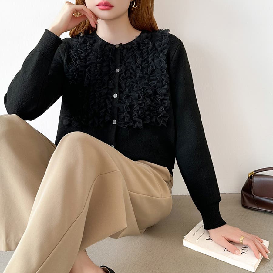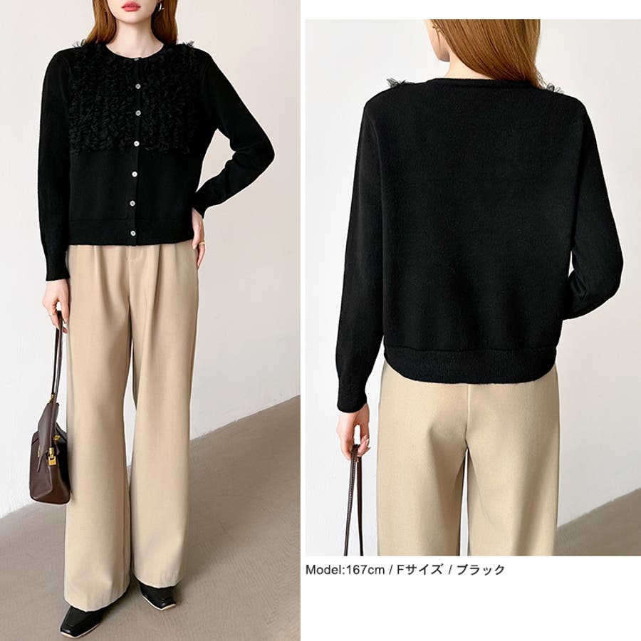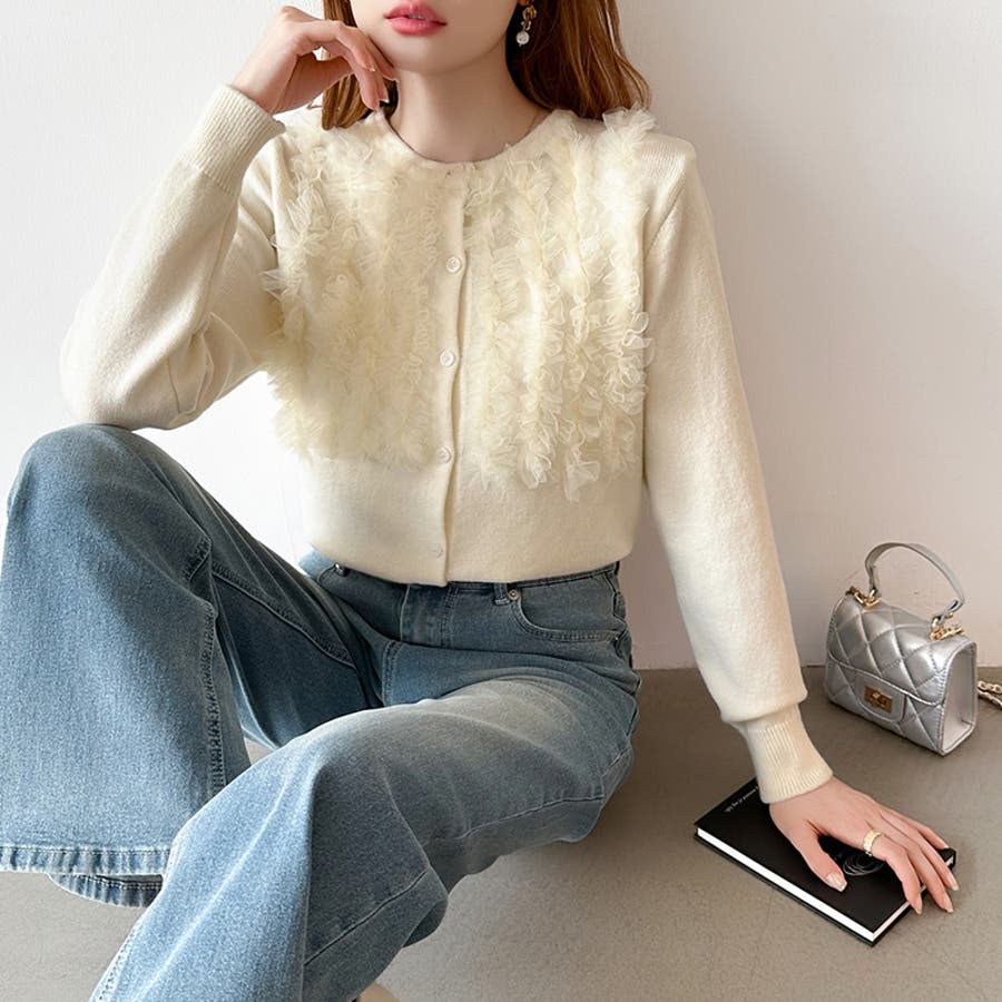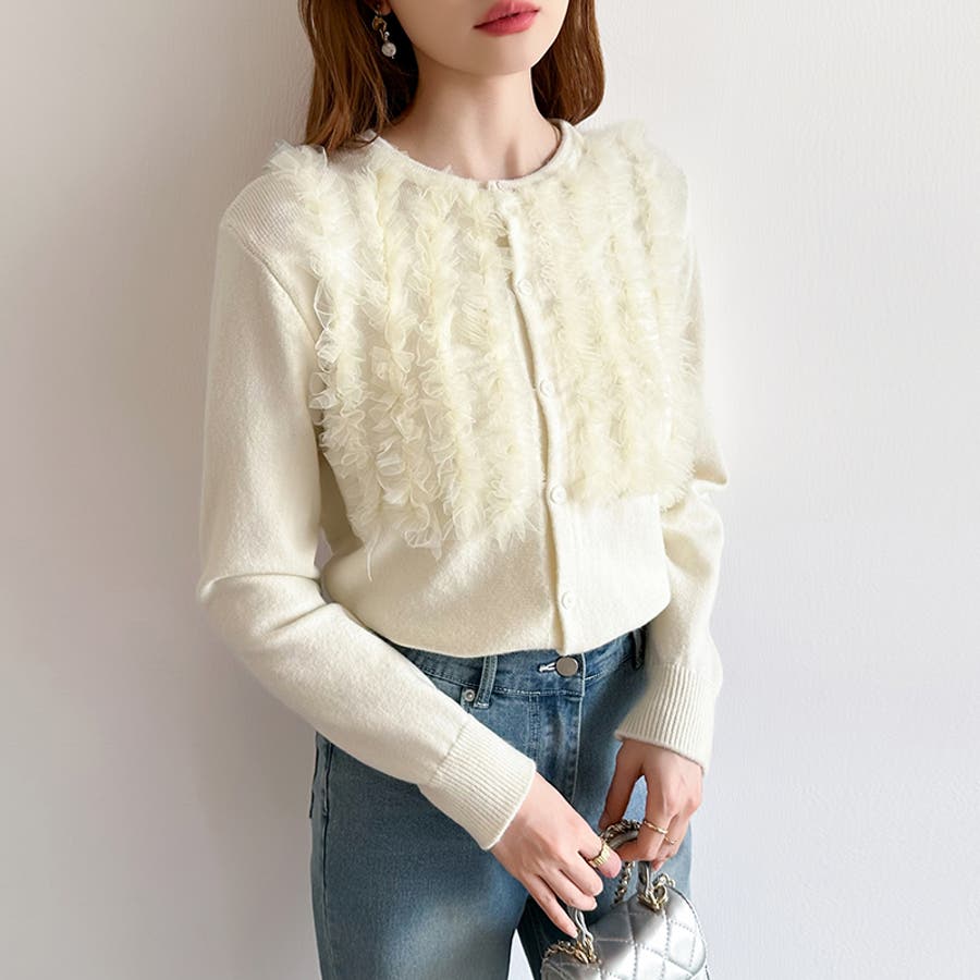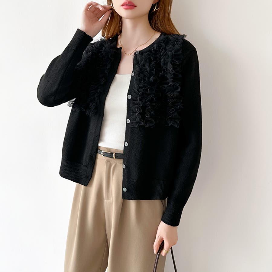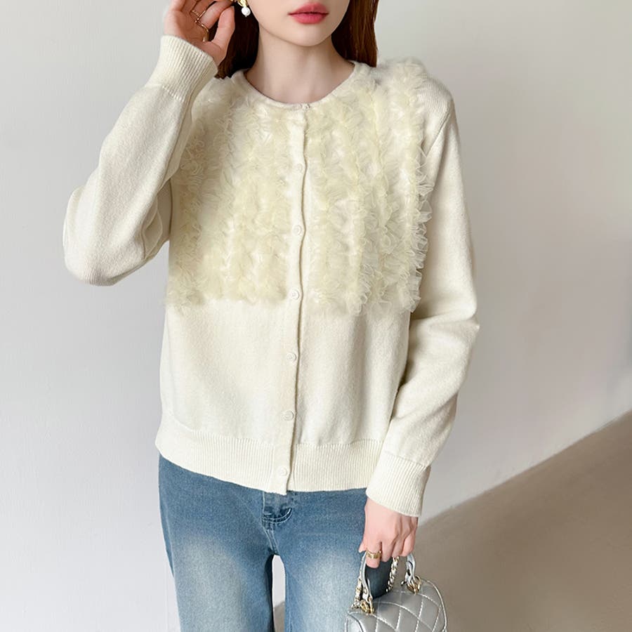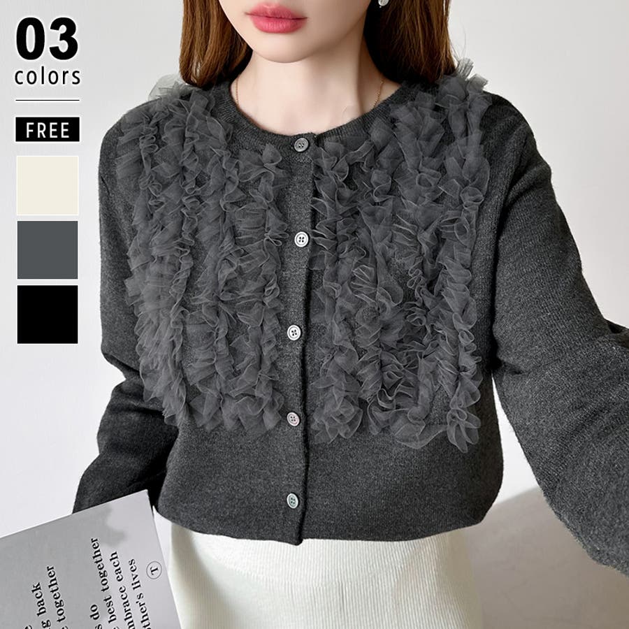 カーディガン チュールフリルカーディガン レディース チュール フリル ニットカーディガン きれいめ トップス 長袖 クルーネック 丸首 ニット クルーネックカーディガン オフィス オフィスカジュアル 大人 羽織 おしゃれ 重ね着 レイヤード ニットトップス きれいめカーディガン ニットカーデ ニットセーター 羽織り 羽織りもの 上着 tops 着回し 伸縮性 ストレッチ 前開き 前あき 柔らかい やわらかい 洗える 暖 暖かい あったかい セレモニー 食事会 デート おでかけ お出かけ 旅行 オフィスカジュアル秋冬 オフィカジ カジュアル フェミニン 韓国風 韓国服 華やか 上品 大人カジュアル 大人可愛い 大人かわいい かわいい 可愛い きれい め きれいめカジュアル 大人カジュアル オシャレ 女性 プチプラ 高見え トレンド ヒット 商品 おすすめ 服 服装 ファッション コーデ コーディネート アイボリー ダークグレー グレー 灰色 ブラック 黒 春ニット 秋ニット 冬ニット 春トップス 秋トップス 冬トップス 秋トップスレディース レディース秋冬 レディース春 レディース秋 レディース冬 レディース秋物 レディース秋冬トップス 羽織りものレディース トップスレディース トップスレディース長袖 レディーストップス 長袖レディース 二ットレディース 長袖トップス 長袖トップスレディース 長袖トップスおしゃれ ニットカーディガンレディース 新作 春秋 秋冬 春 秋 冬 春服 秋服 冬服 春物 秋物 冬物 春用 秋用 冬用 韓国 韓国ファッション 10代 20代 30代 40代 50代 60代 70代 cocomomo ココモモ