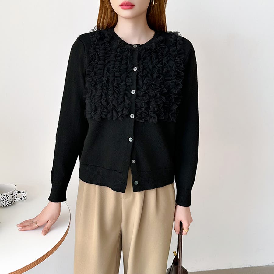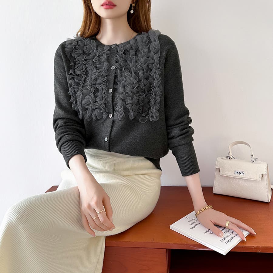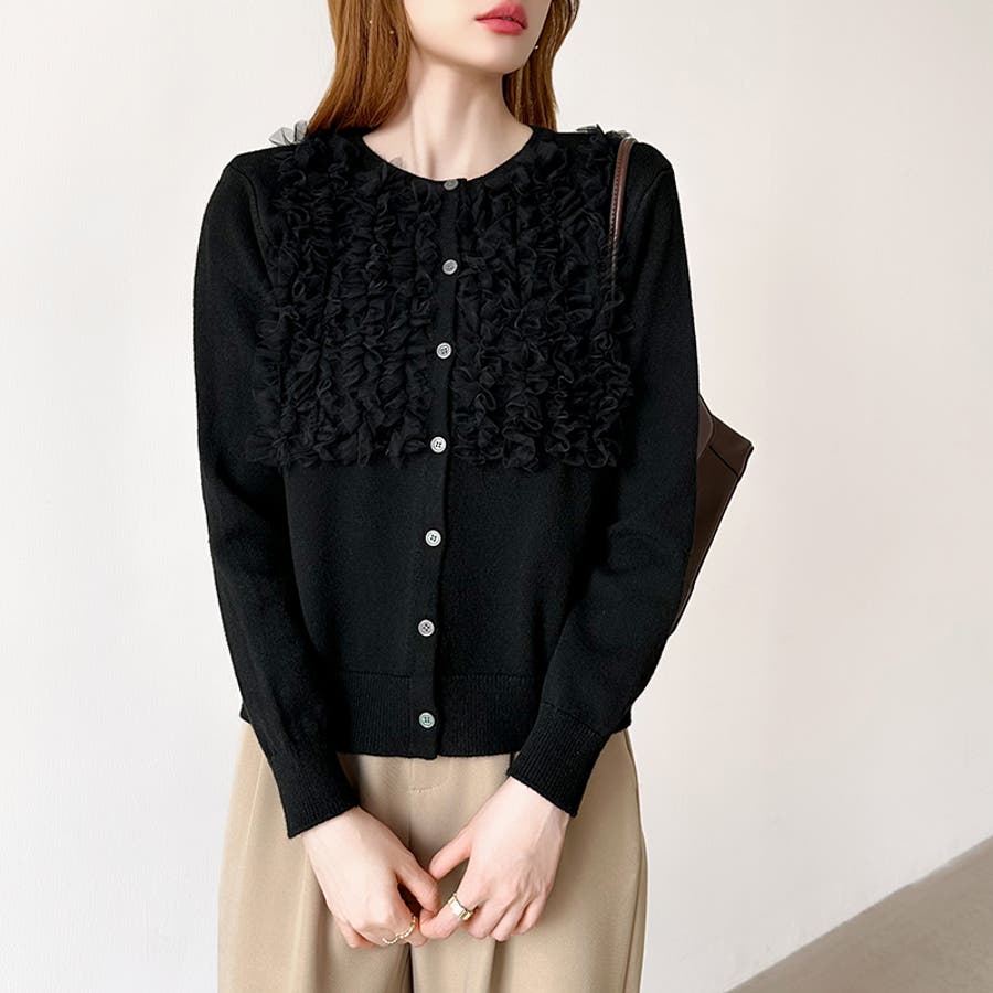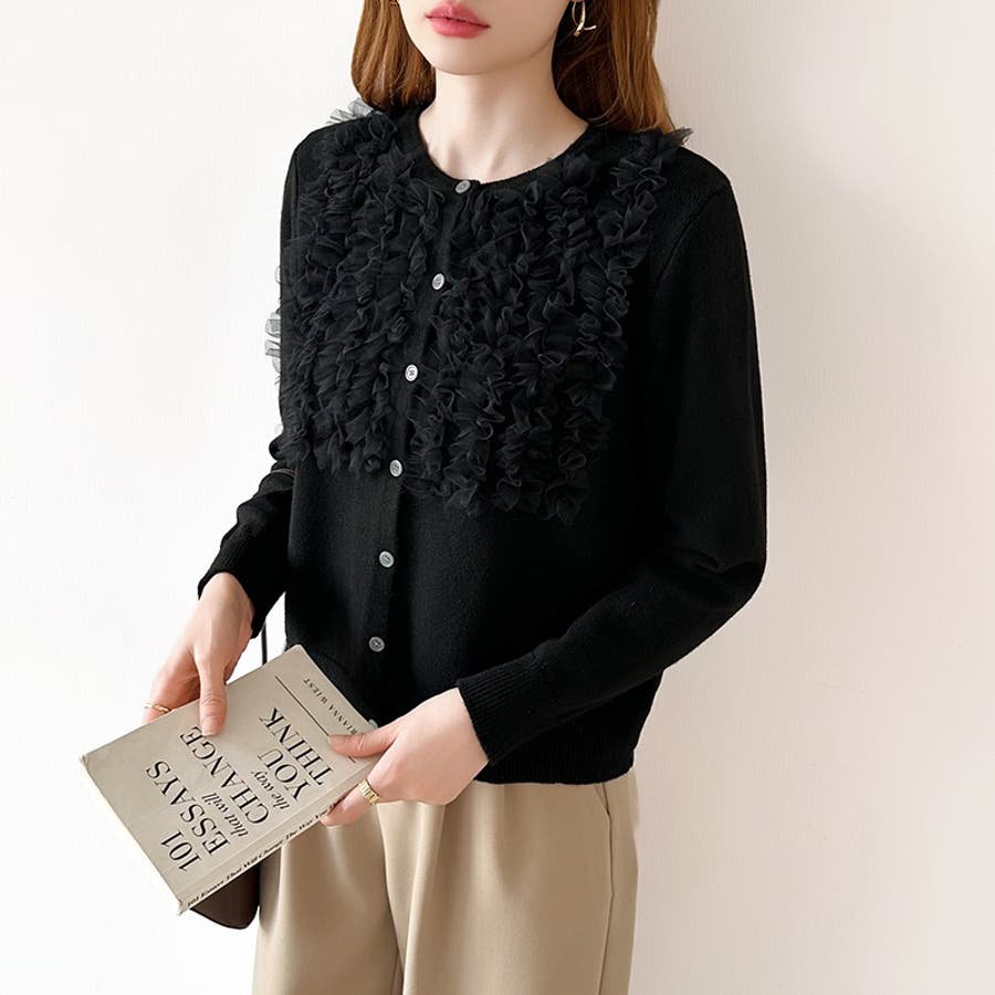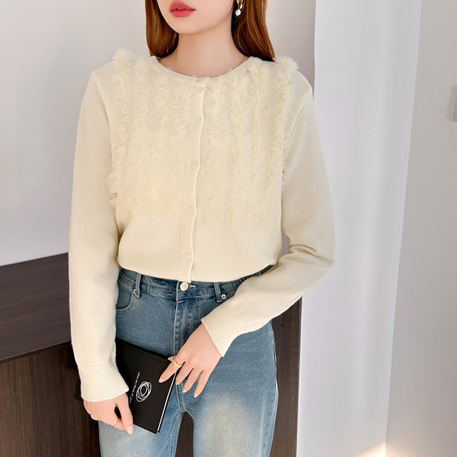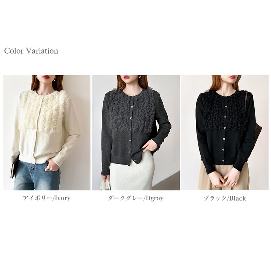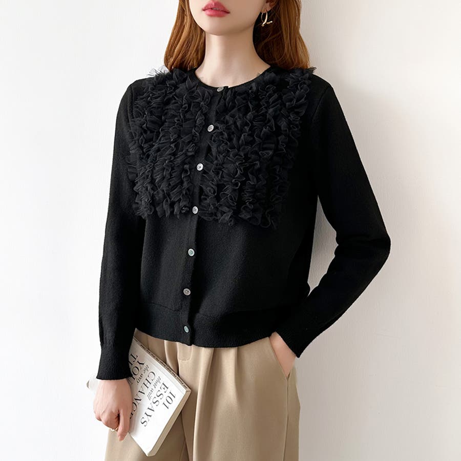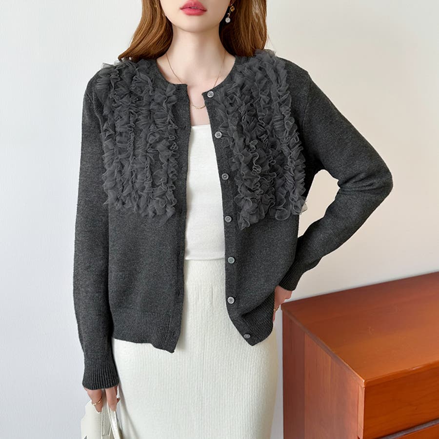 カーディガン チュールフリルカーディガン レディース チュール フリル ニットカーディガン きれいめ トップス 長袖 クルーネック 丸首 ニット クルーネックカーディガン オフィス オフィスカジュアル 大人 羽織 おしゃれ 重ね着 レイヤード ニットトップス きれいめカーディガン ニットカーデ ニットセーター 羽織り 羽織りもの 上着 tops 着回し 伸縮性 ストレッチ 前開き 前あき 柔らかい やわらかい 洗える 暖 暖かい あったかい セレモニー 食事会 デート おでかけ お出かけ 旅行 オフィスカジュアル秋冬 オフィカジ カジュアル フェミニン 韓国風 韓国服 華やか 上品 大人カジュアル 大人可愛い 大人かわいい かわいい 可愛い きれい め きれいめカジュアル 大人カジュアル オシャレ 女性 プチプラ 高見え トレンド ヒット 商品 おすすめ 服 服装 ファッション コーデ コーディネート アイボリー ダークグレー グレー 灰色 ブラック 黒 春ニット 秋ニット 冬ニット 春トップス 秋トップス 冬トップス 秋トップスレディース レディース秋冬 レディース春 レディース秋 レディース冬 レディース秋物 レディース秋冬トップス 羽織りものレディース トップスレディース トップスレディース長袖 レディーストップス 長袖レディース 二ットレディース 長袖トップス 長袖トップスレディース 長袖トップスおしゃれ ニットカーディガンレディース 新作 春秋 秋冬 春 秋 冬 春服 秋服 冬服 春物 秋物 冬物 春用 秋用 冬用 韓国 韓国ファッション 10代 20代 30代 40代 50代 60代 70代 cocomomo ココモモ