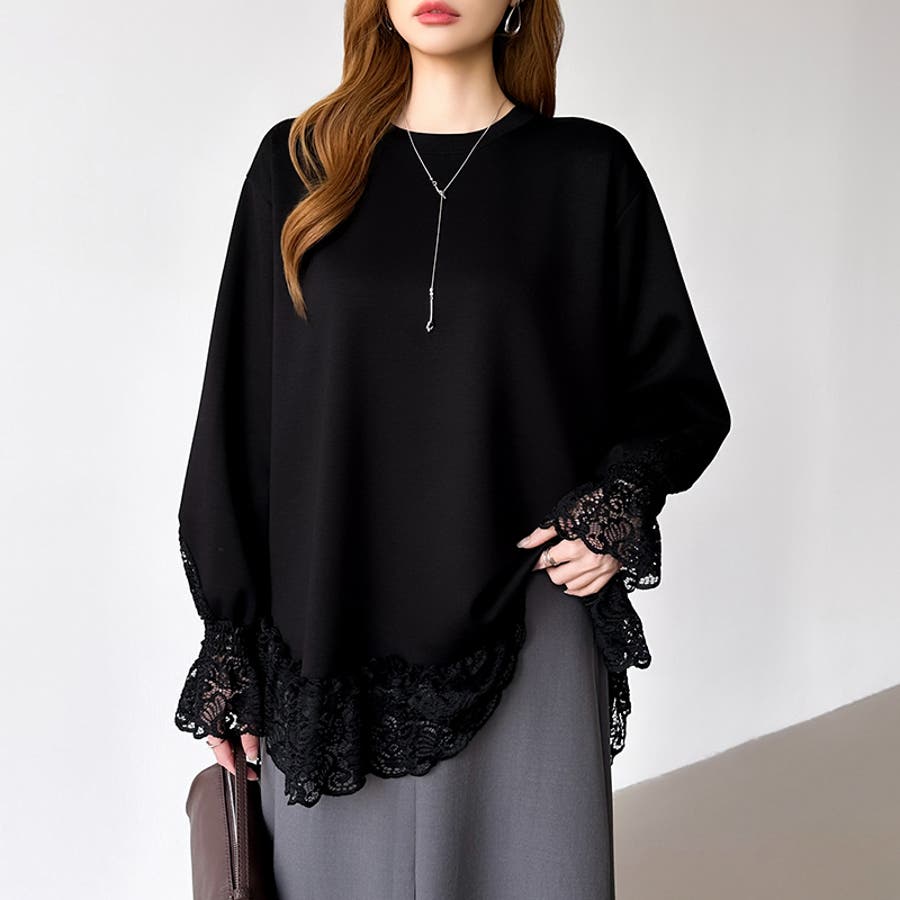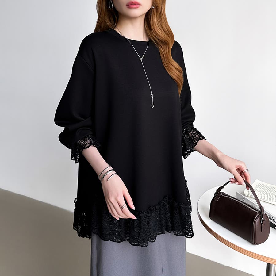 繊細レースを贅沢にあしらった チュニックレーストップス。 ゆったりとしたサイズ感と 後ろが長めのデザインで ヒップまわりもカバー。 袖や裾のレースがアクセントになり、 アウターを重ねて袖からのぞかせた レースも華やかで可愛さアップ。 ほどよいハリと柔らかさを兼ね備えた ポンチ生地で伸縮性もありデイリー 使いにも快適な着心地です。