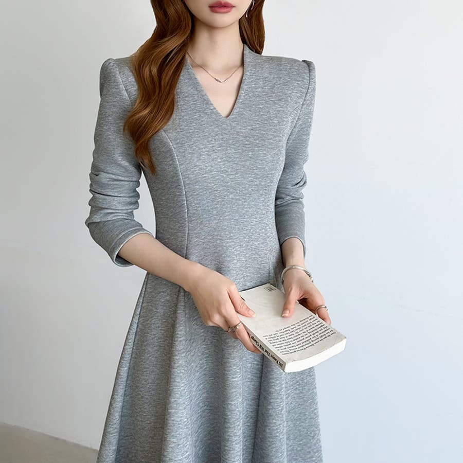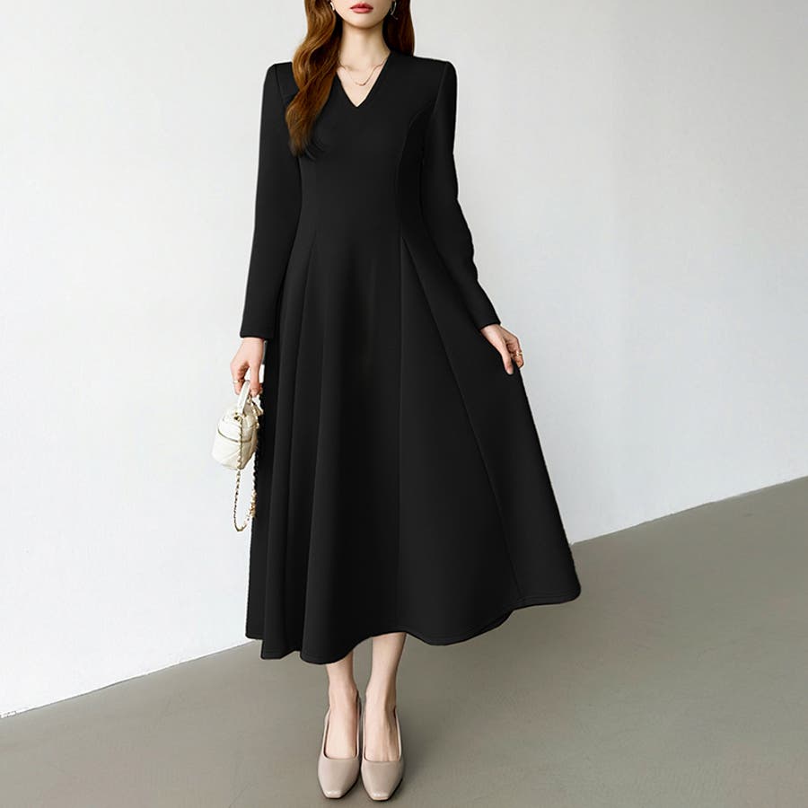 一目で美人。美ラインフレアワンピ vネックワンピース フレアワンピース