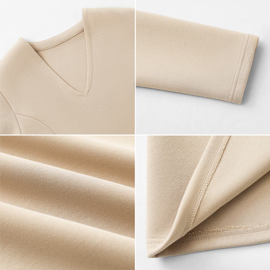 立体的なウエストラインで すっきりとした印象に仕上げた Vネックフレアワンピース。 ポンチ生地ならではの程よいハリ感と、 ウエストをさりげなくシェイプする デザインで、着るだけでスタイルアップ する一枚。 甘すぎないフレアシルエットが美しく映え 女性らしさを引き立てます。