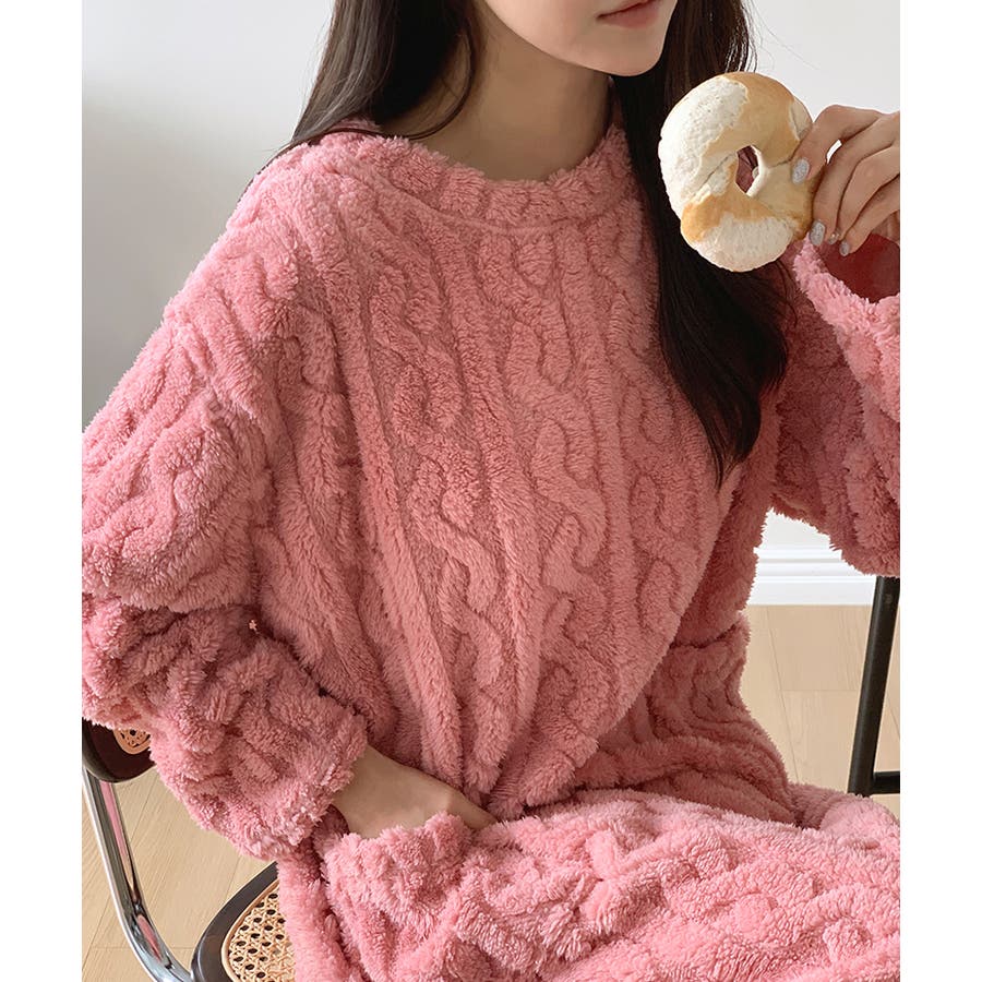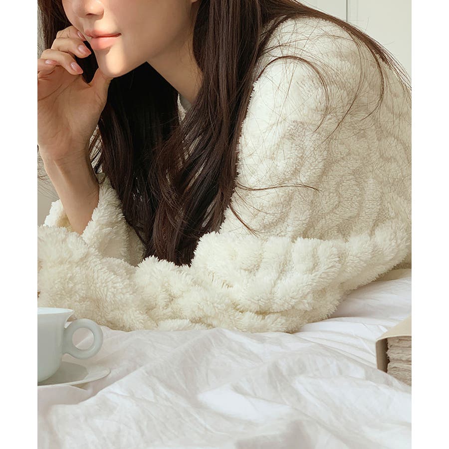 ふわもこな質感が心地いい、 リラックス感たっぷりの ルームウェア。 ふんわりとした編み地が肌に やさしくなじみ、着た瞬間から ほっとする着心地です。 空気を含んだような柔らかな 素材感で、見た目も着心地も ぬくもりのある仕上がりで 長時間の着用も快適。