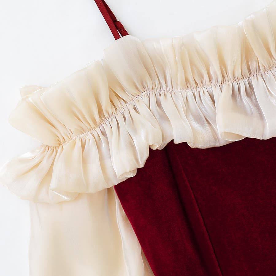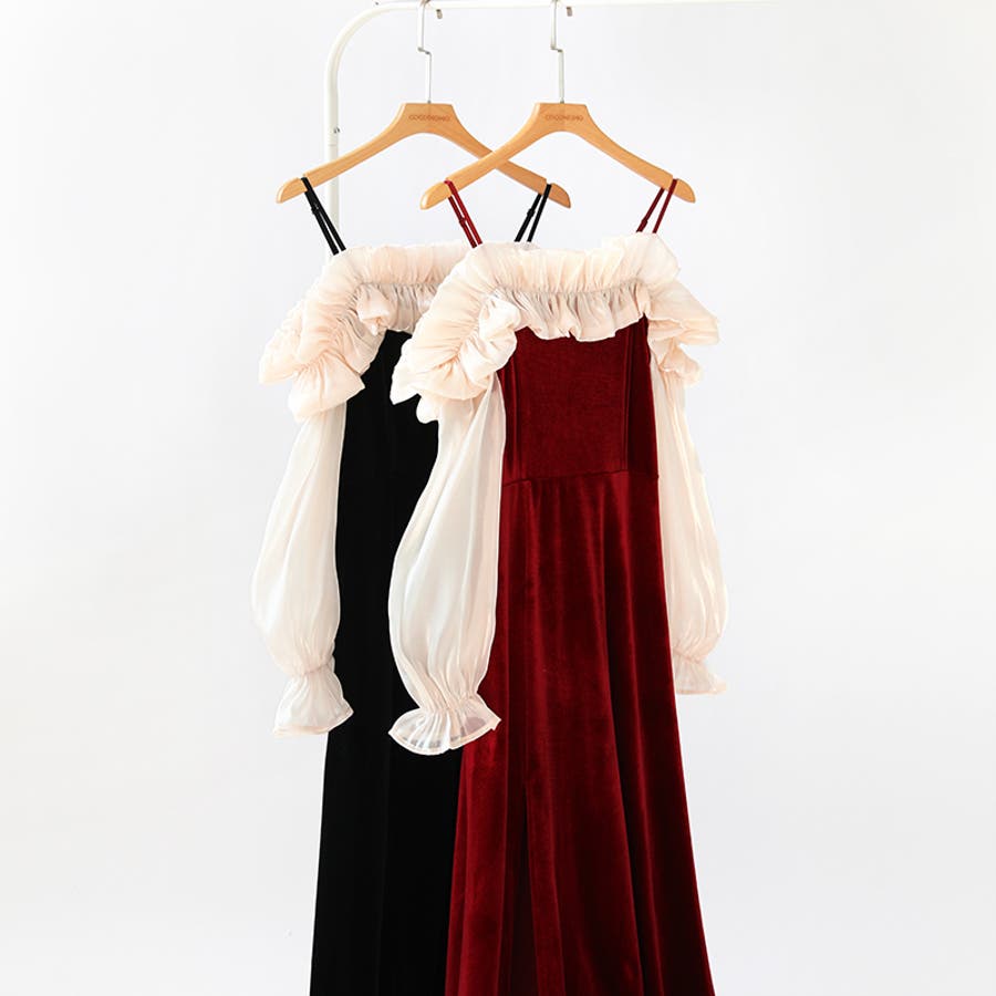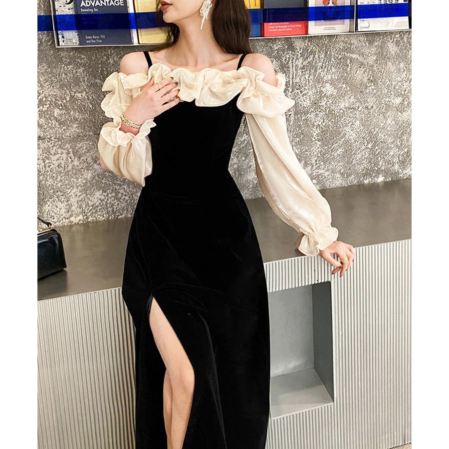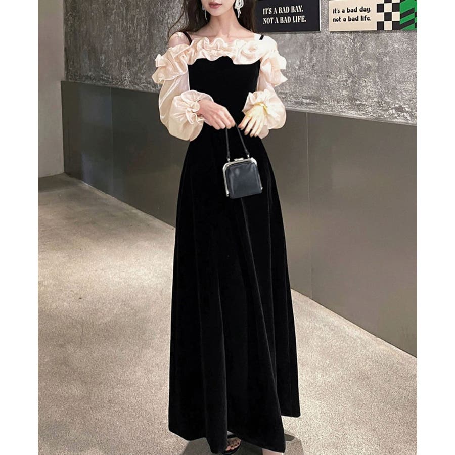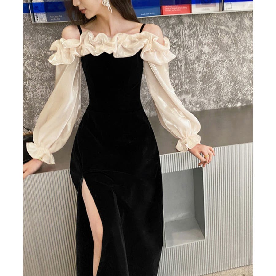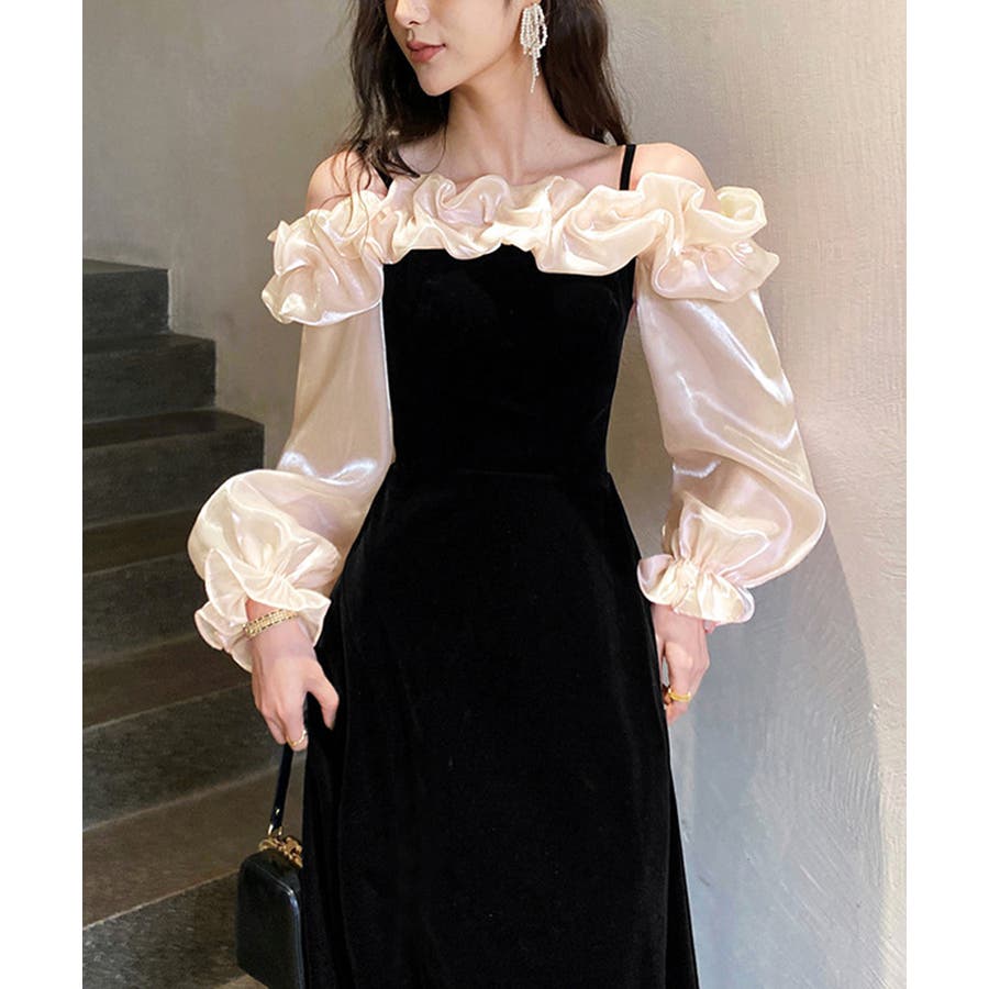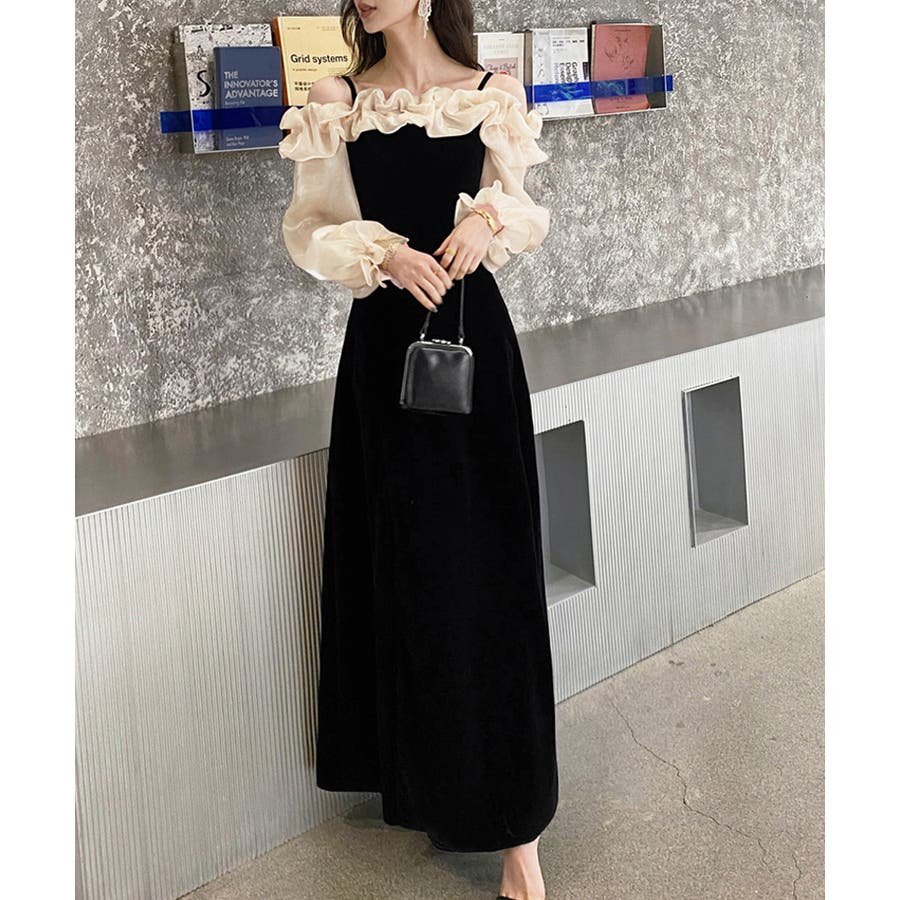 しっとりとした光沢が美しいベロアと オフショル風デザインを合わせた パーティードレス。 デコルテラインを美しく魅せる オフショルダー風デザインは上品な 艶感とフリルで華やかさを演出し、 肩紐付きでズレ落ちずに安心。 ラインを拾いすぎないシルエットで 落ち着きと華やかさを両立し、結婚式 二次会・ディナー・記念日など、 オケージョンシーンに活躍する一着です。