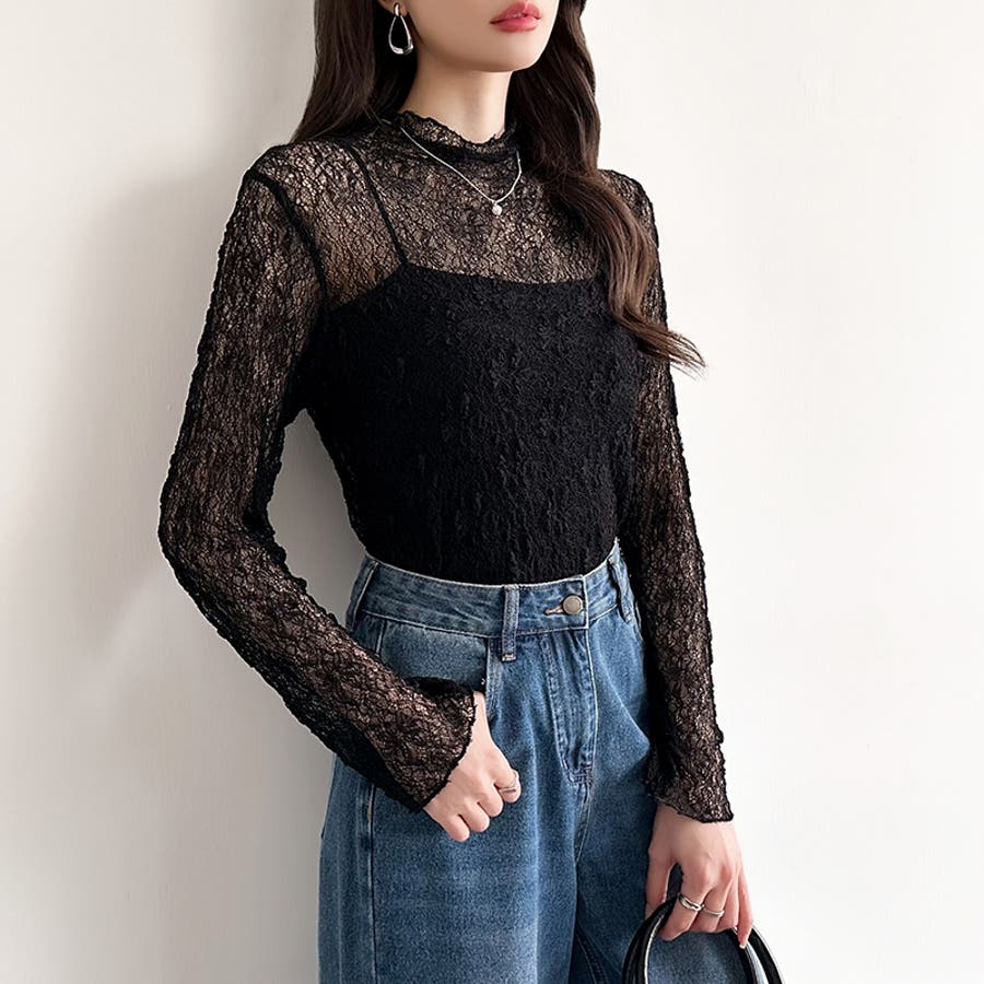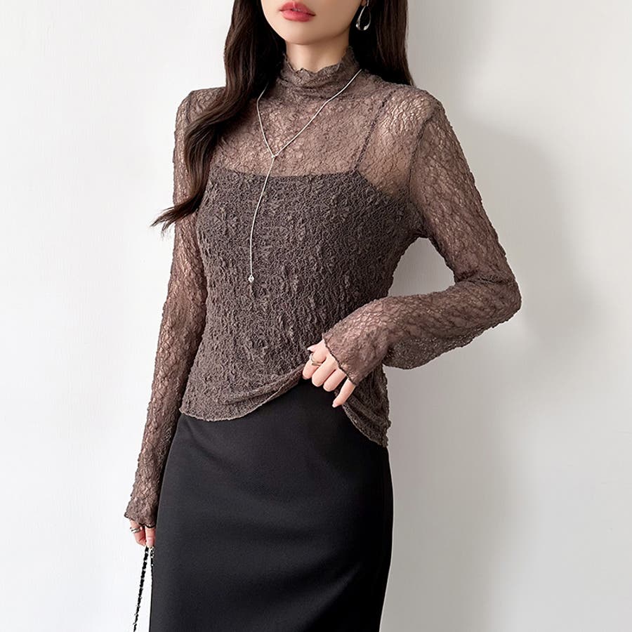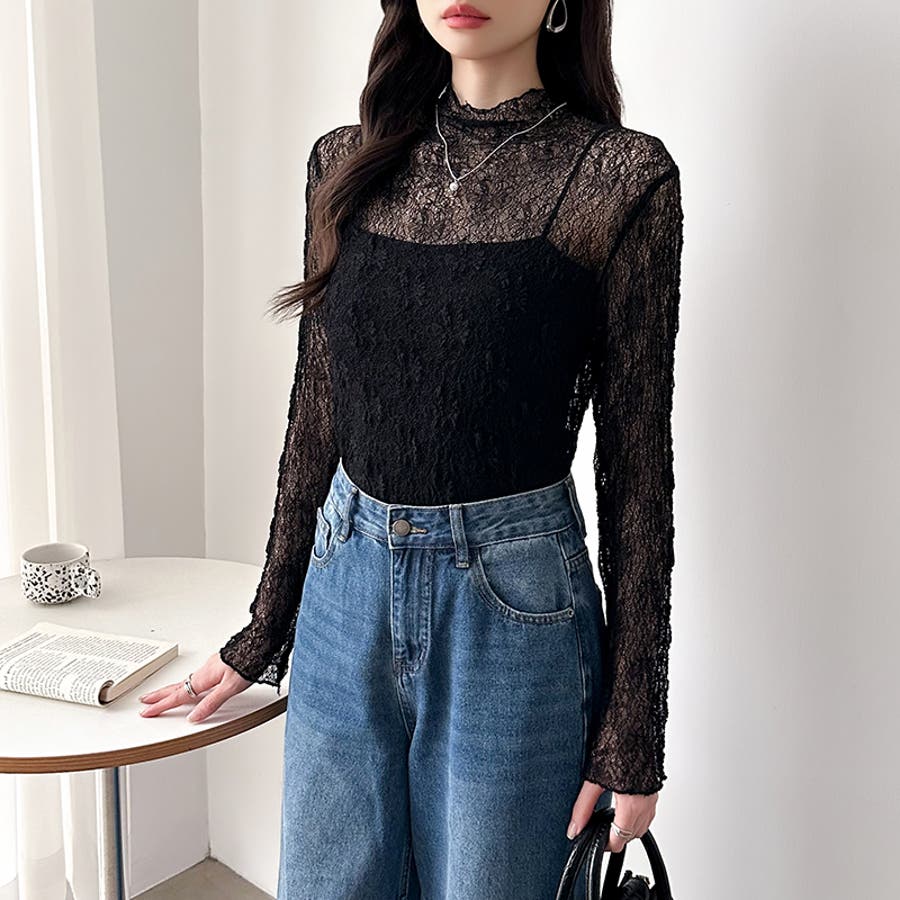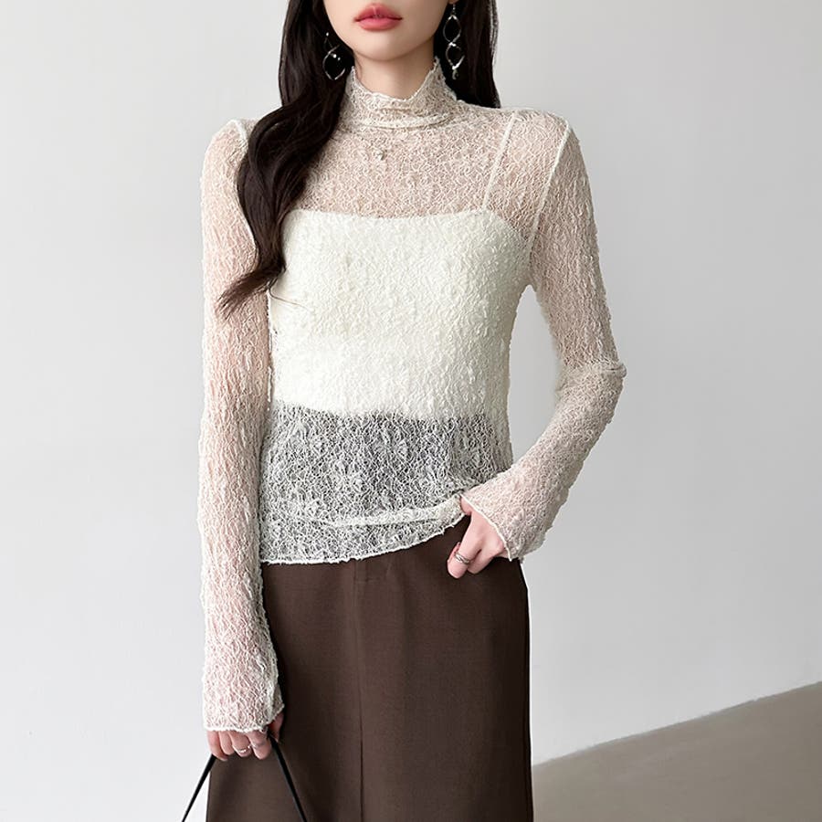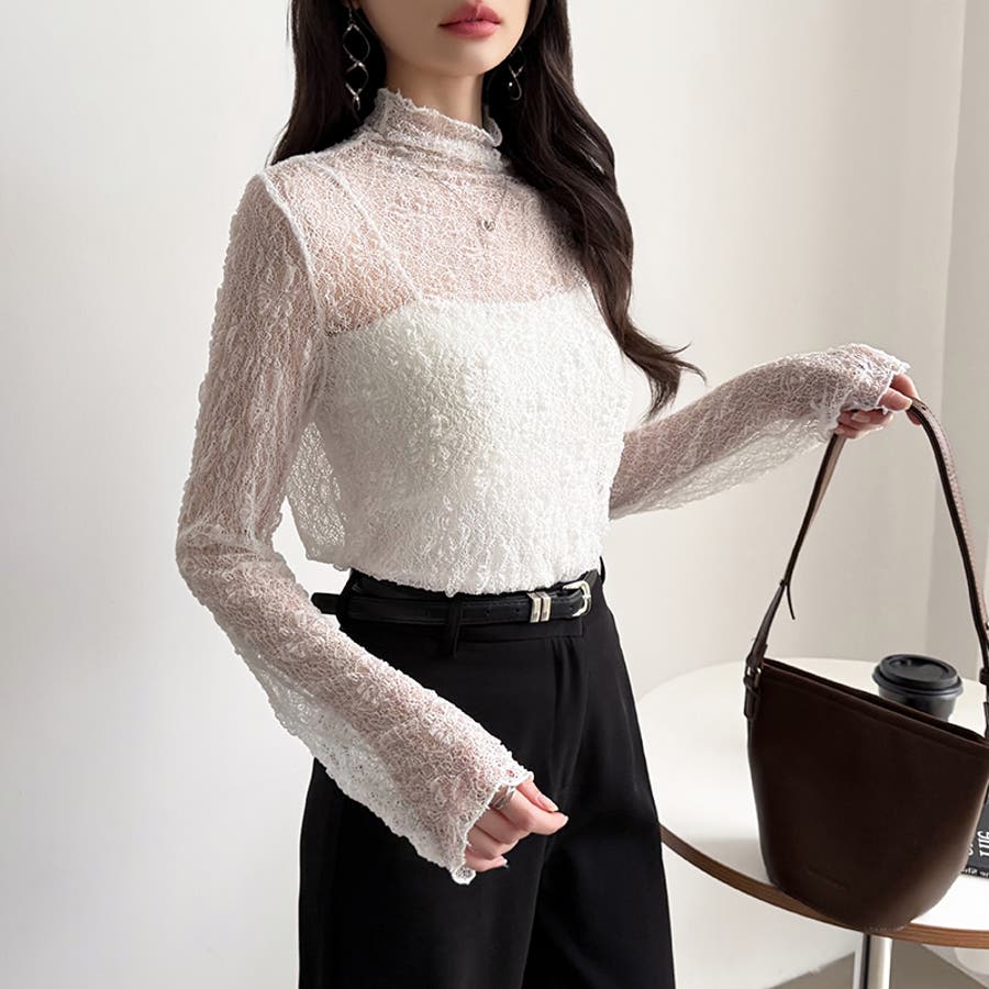 透け感を味方にする、レースシアートップス シアー ハイネック