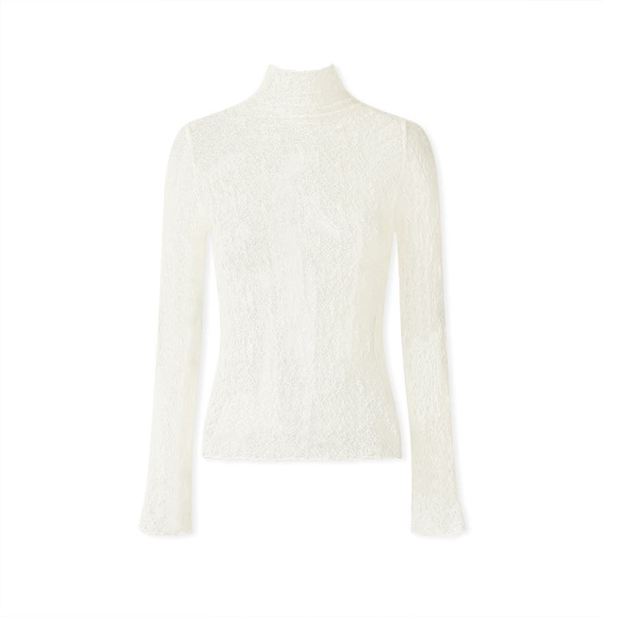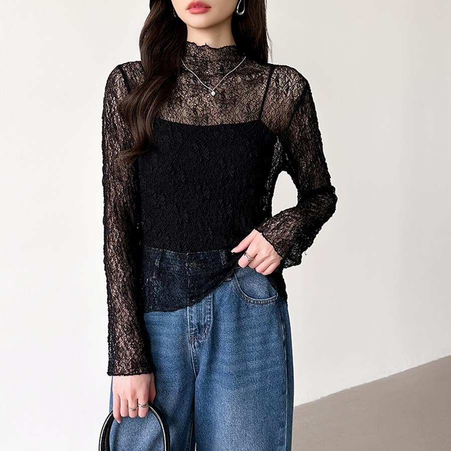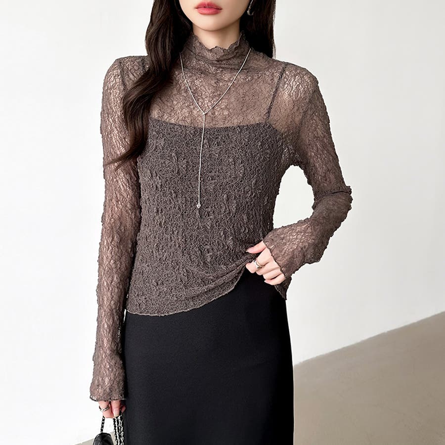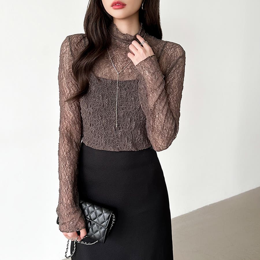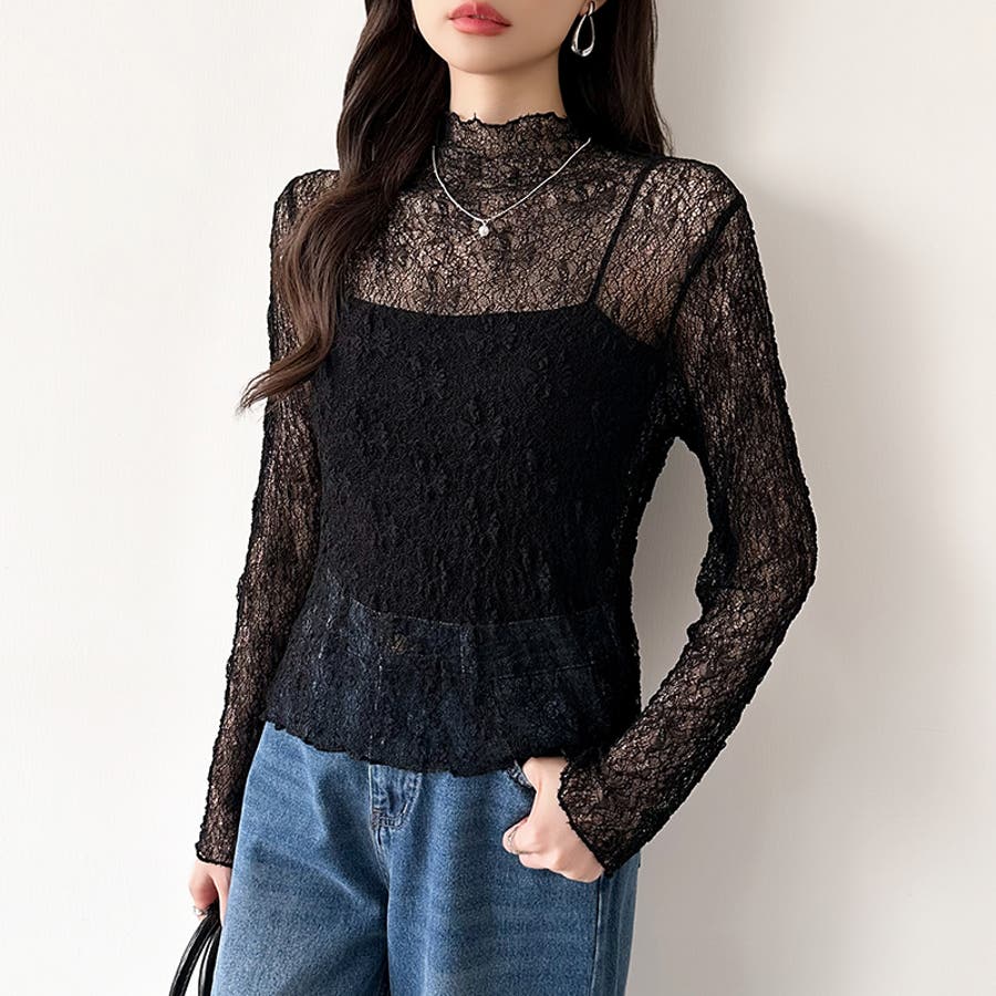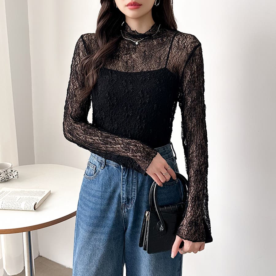 透け感を味方にする、レースシアートップス シアー ハイネック