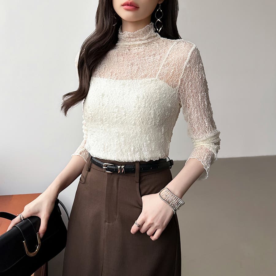 重ねるだけでコーデがぐっと上品に、 繊細なレース素材を使用した ハイネックシアートップス。 程よい透け感と、肌に重ねたときの ニュアンスが大人の装いに奥行きを 与えます。 ジャケットやスーツのインナーとしても キャミワンピースやジャンスカとの レイヤードにも好相性。 きれいめカジュアルからオケージョンまで、 幅広いシーンで活躍します。