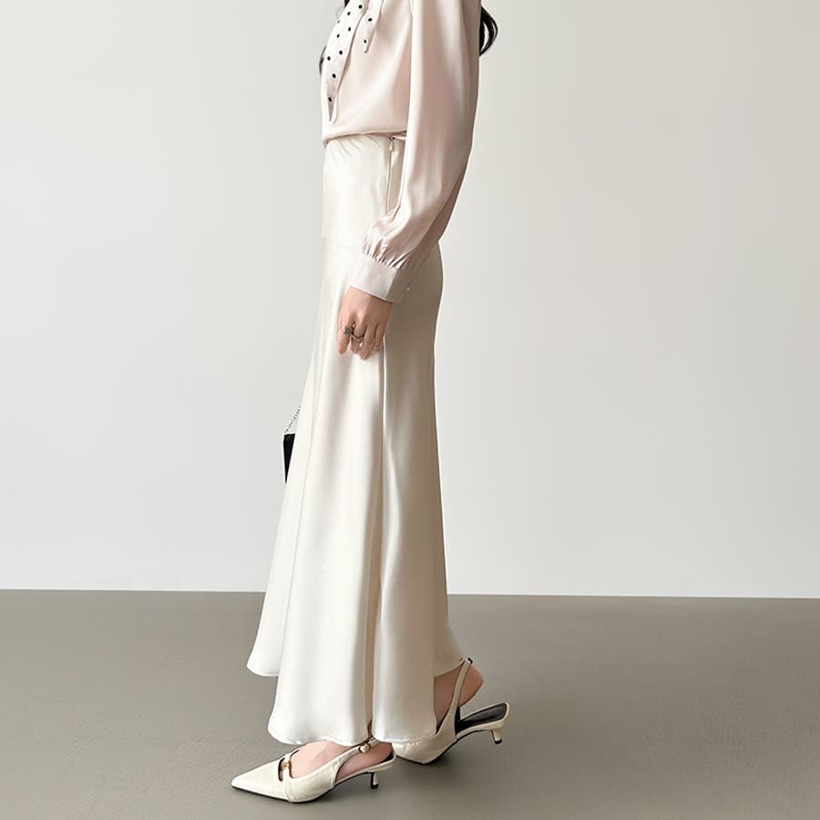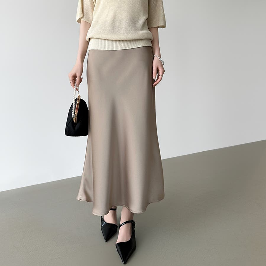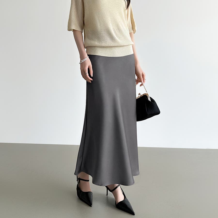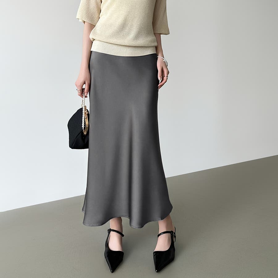 落ち感のある、なめらかな サテン生地が上品さを際立てる サテンマーメイドスカート。 腰まわりはすっきり、裾にかけて 自然なフレアを描き軽やかで 華やかな印象を演出します。 きちんと見えしつつウエスト裏側は ゴム仕様でさらにファスナー付きで 着脱もスムーズ。 きれいめなお出かけやオケージョン ブラウス合わせでオフィスカジュアル にも活躍するスカートです。