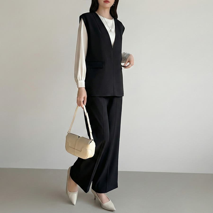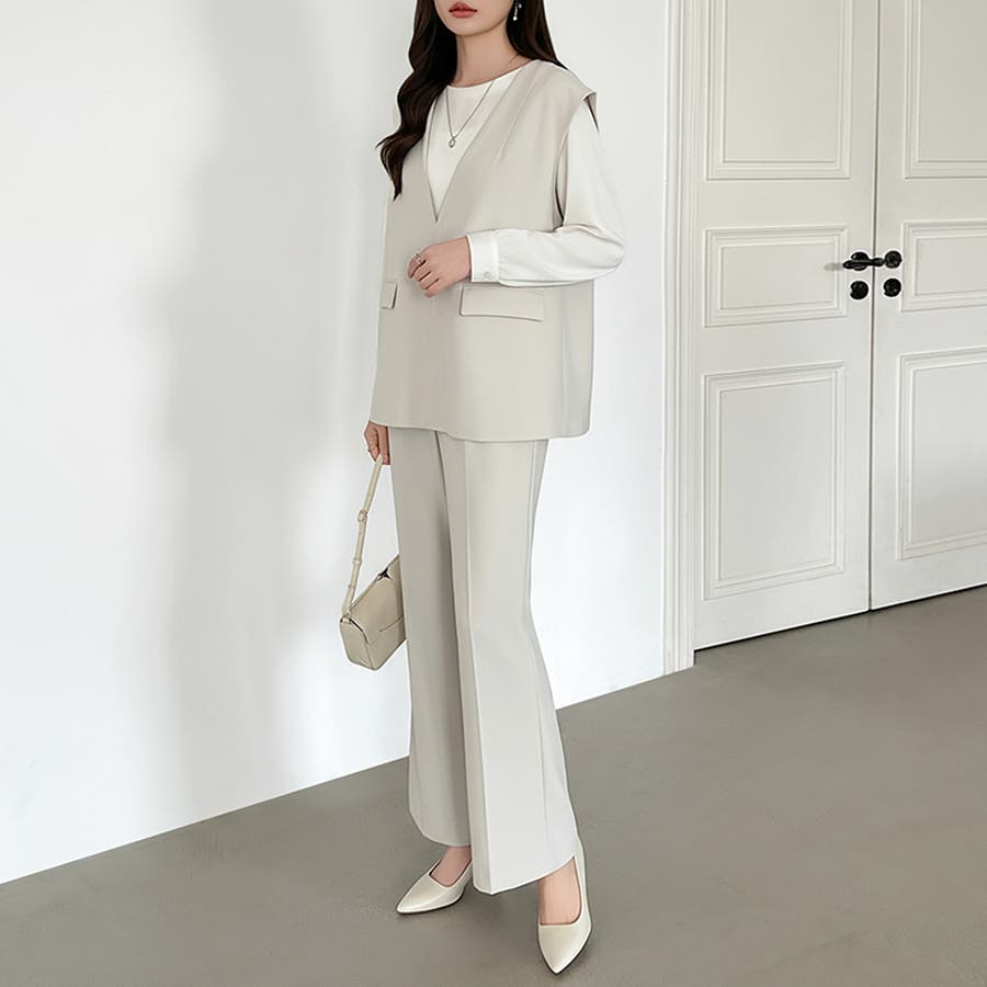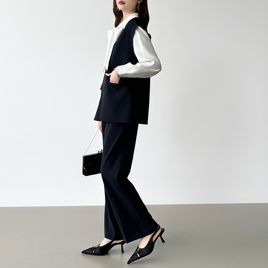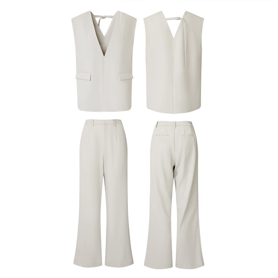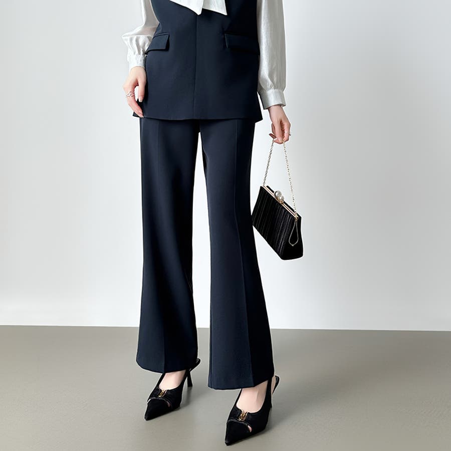 vネックベストとセミフレアパンツの 上品さと今っぽさを兼ね備えた セットアップ。 すっきりとしたVネックと、 センタープレス入りのパンツが 美しいシルエットを演出します。 卒入学式やセレモニーシーンには もちろん、インナー次第で カジュアルにも着回し可能。 それぞれ単品使いもできオンオフ問わず 活躍する、万能フォーマルセットです。