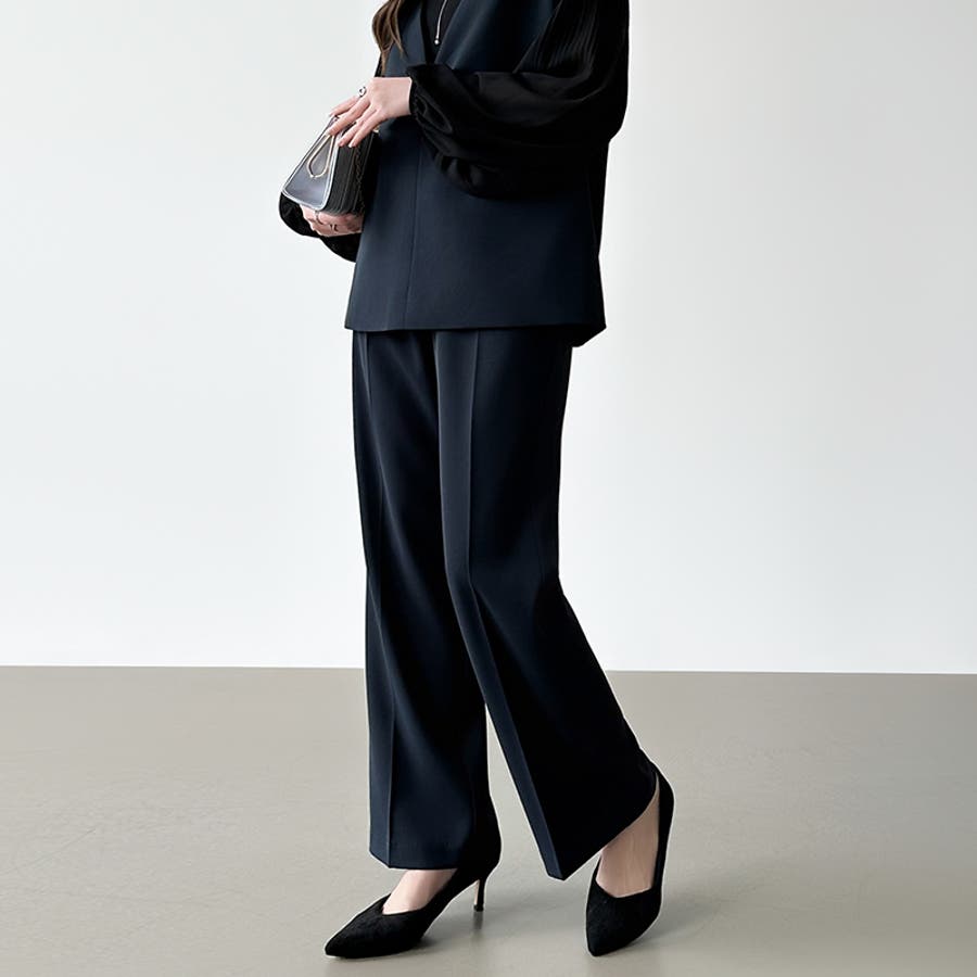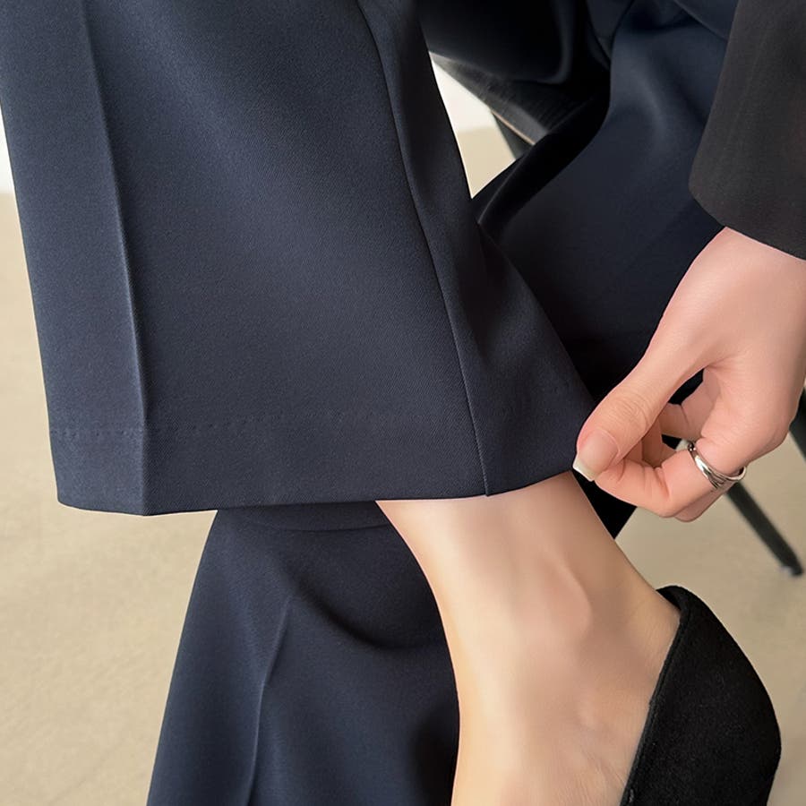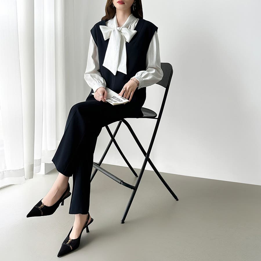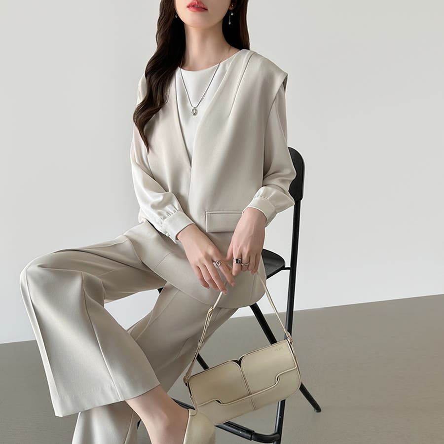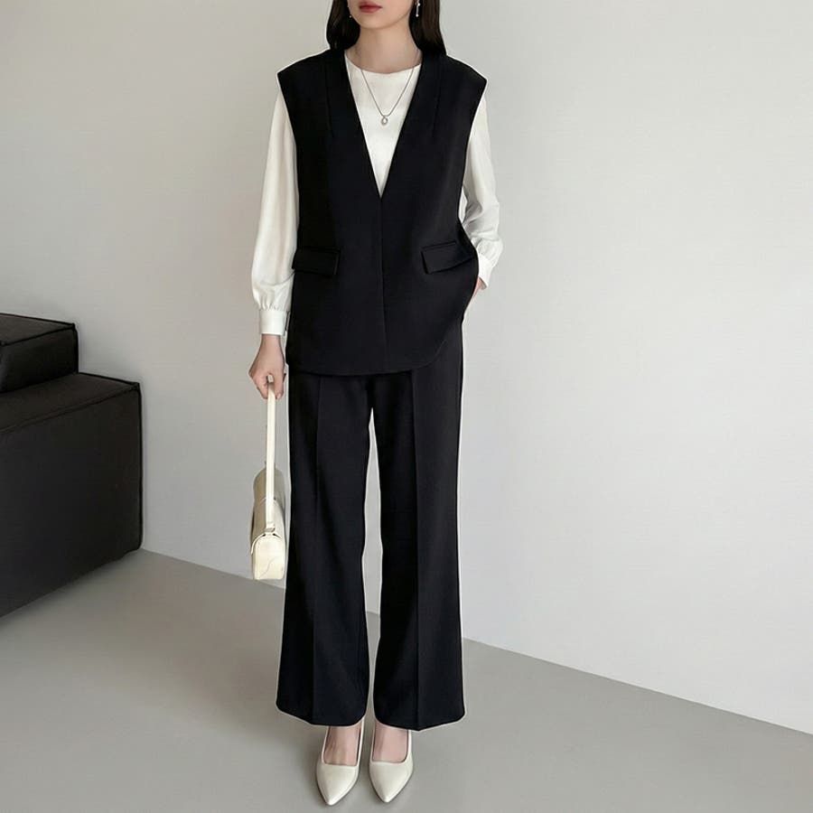 vネックベストとセミフレアパンツの 上品さと今っぽさを兼ね備えた セットアップ。 すっきりとしたVネックと、 センタープレス入りのパンツが 美しいシルエットを演出します。 卒入学式やセレモニーシーンには もちろん、インナー次第で カジュアルにも着回し可能。 それぞれ単品使いもできオンオフ問わず 活躍する、万能フォーマルセットです。