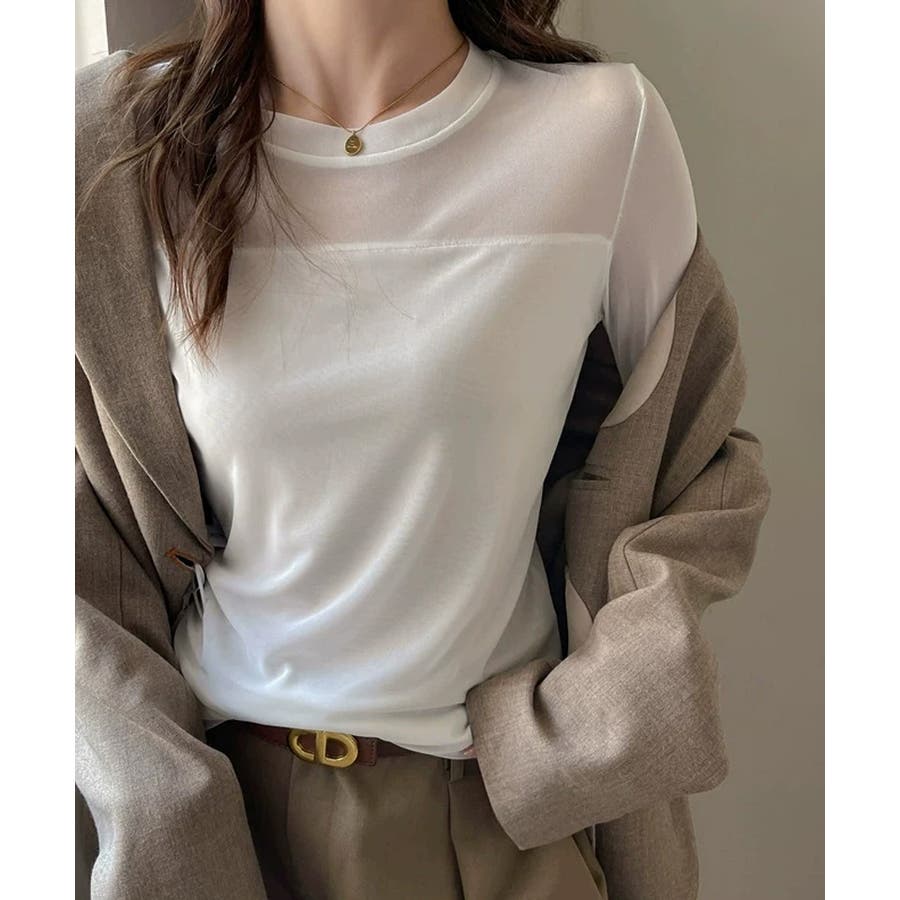上品な透け感と安心感を両立した シアートップス。 デコルテと袖は程よく透け、 胸元は切替デザインで透けにくく 仕上げたシアーアイテムです。 トップスとしてもジャケットやスーツ カーディガンのインナーとしても、 ジレやキャミワンピースなど レイヤードにも活躍。