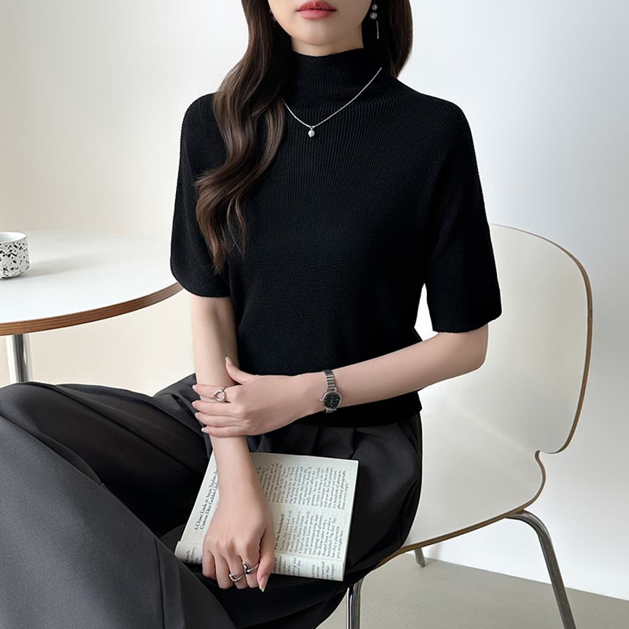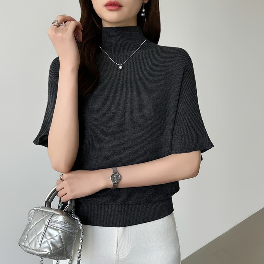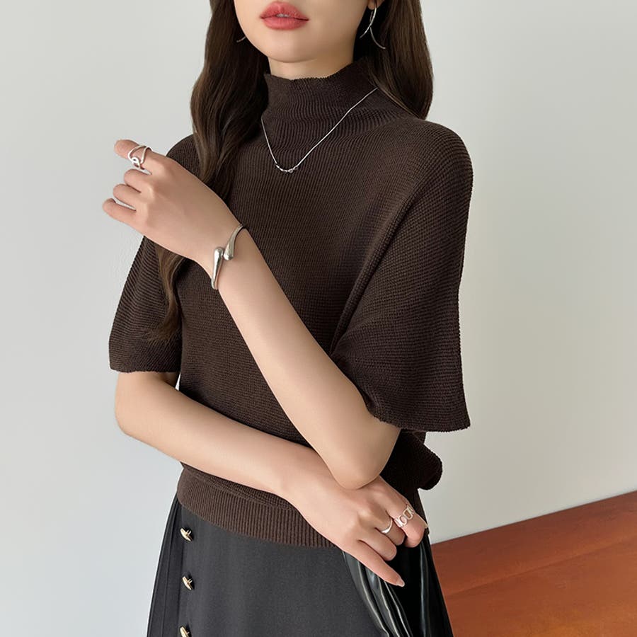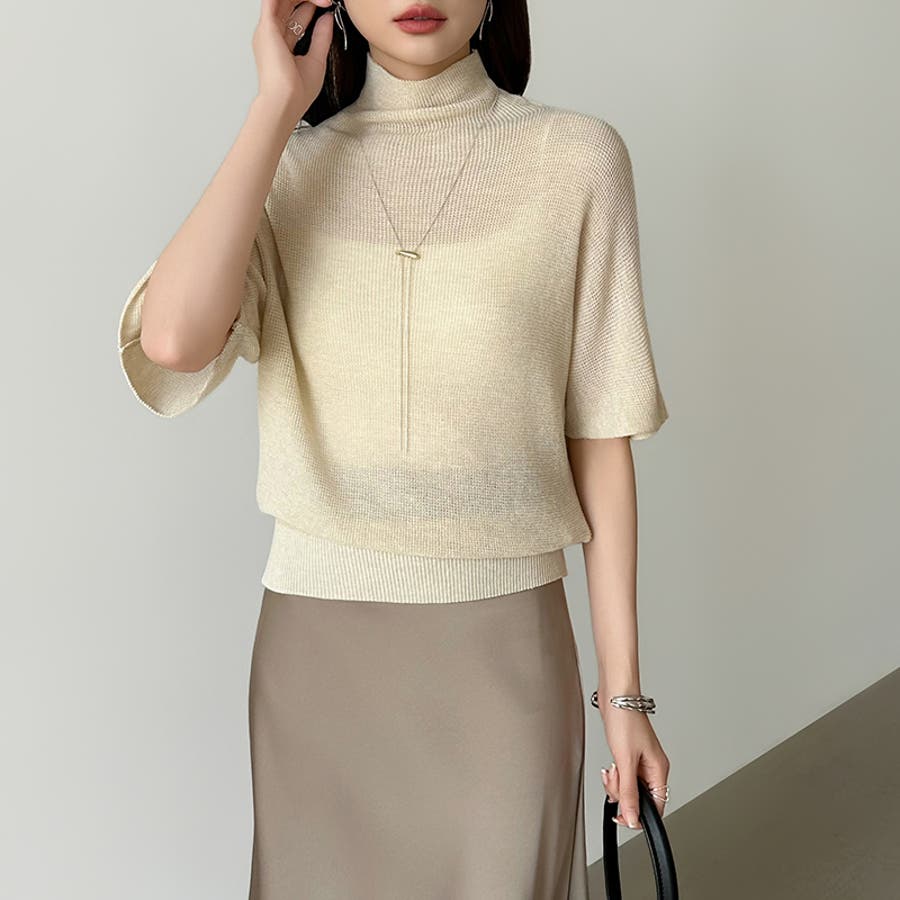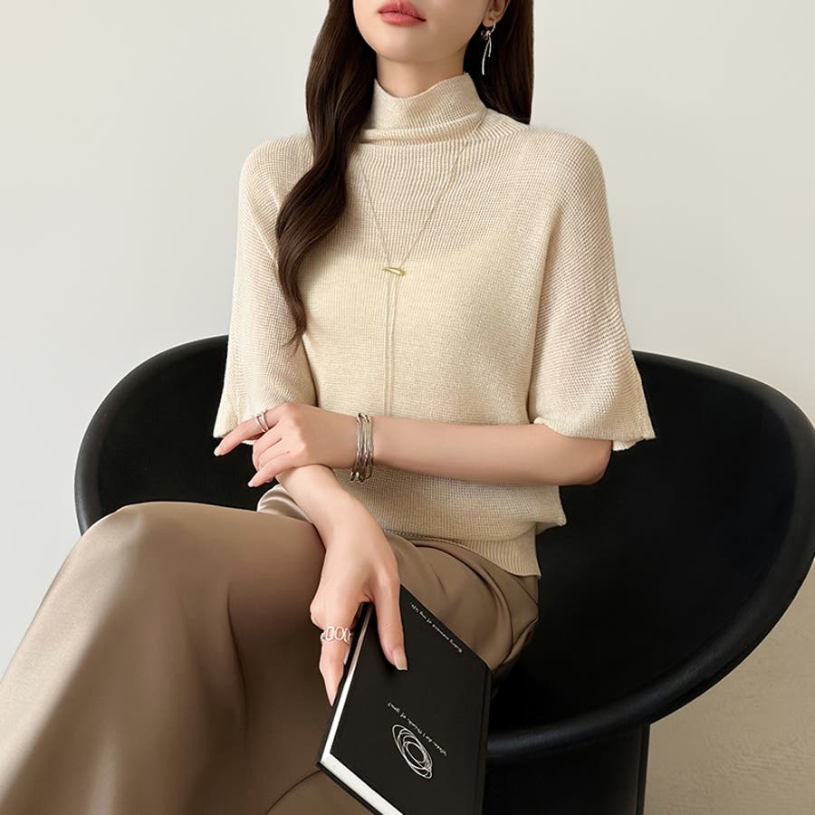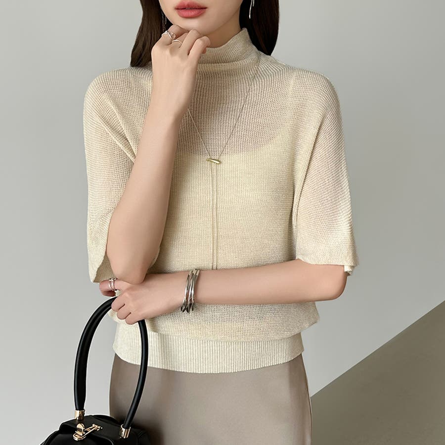 さらっと着られてきちんと見える。 毎日に寄り添う、サマーニット。 レーヨン混のなめらかな編地は、 肌離れがよく暑い季節も快適な着心地。 ほどよい透け感が重たさを抑え、 ニットならではの上品さを引き立てます。 長めの半袖丈で気になる二の腕を 自然にカバーし、ハイネックが 顔まわりをすっきりと見せてくれます。 一枚で着るのはもちろん、春秋は ジャケットやカーディガンの インナーとしても活躍。