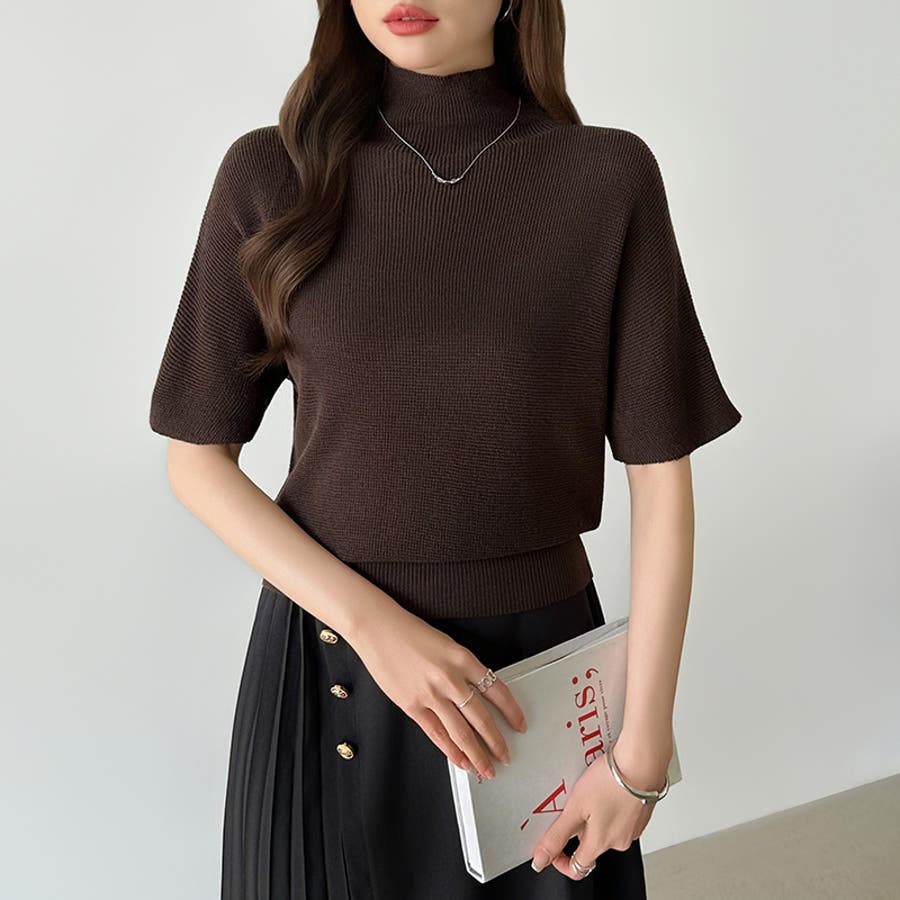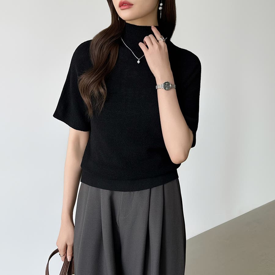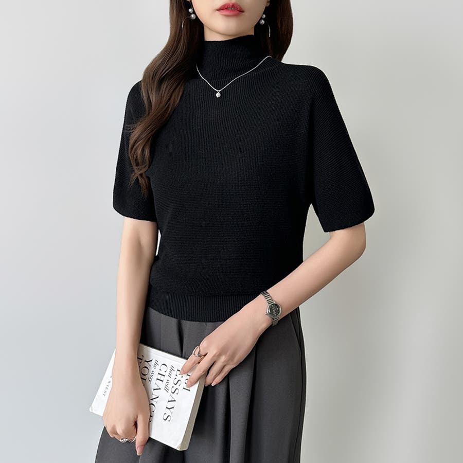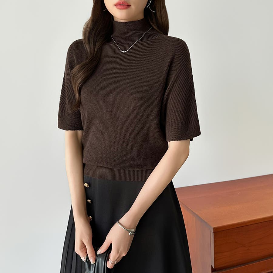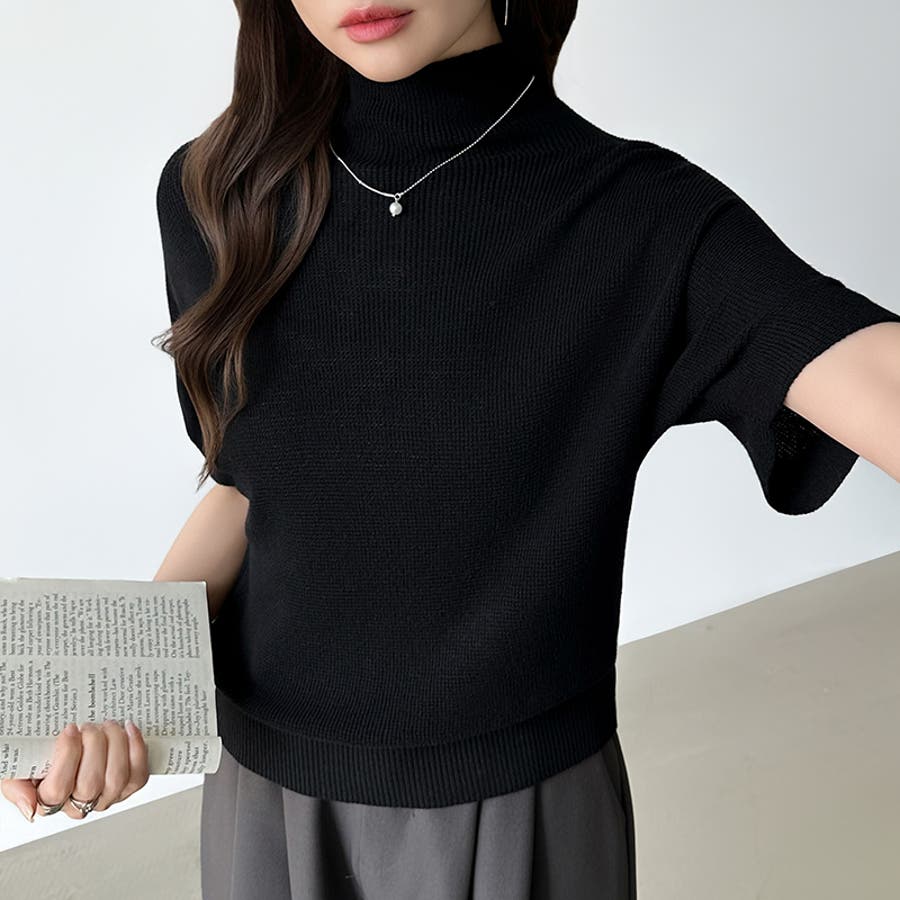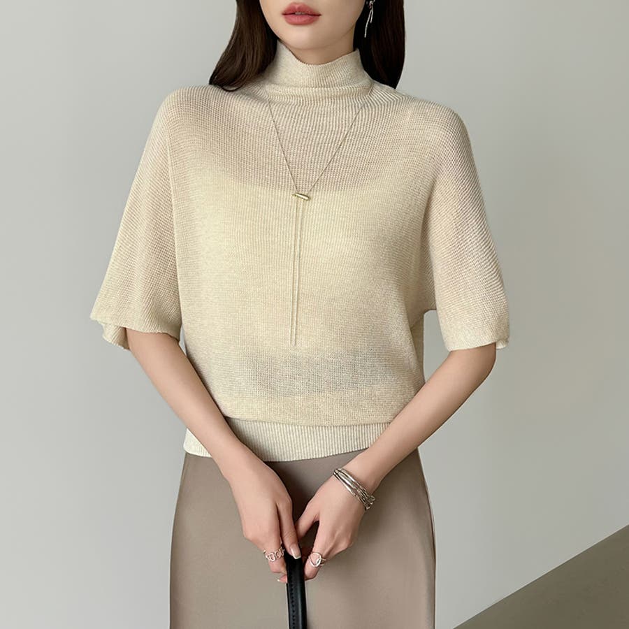 さらっと着られてきちんと見える。 毎日に寄り添う、サマーニット。 レーヨン混のなめらかな編地は、 肌離れがよく暑い季節も快適な着心地。 ほどよい透け感が重たさを抑え、 ニットならではの上品さを引き立てます。 長めの半袖丈で気になる二の腕を 自然にカバーし、ハイネックが 顔まわりをすっきりと見せてくれます。 一枚で着るのはもちろん、春秋は ジャケットやカーディガンの インナーとしても活躍。