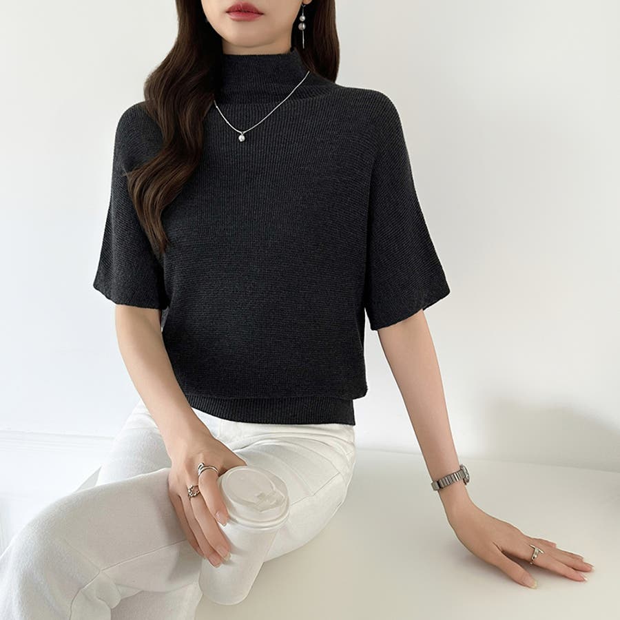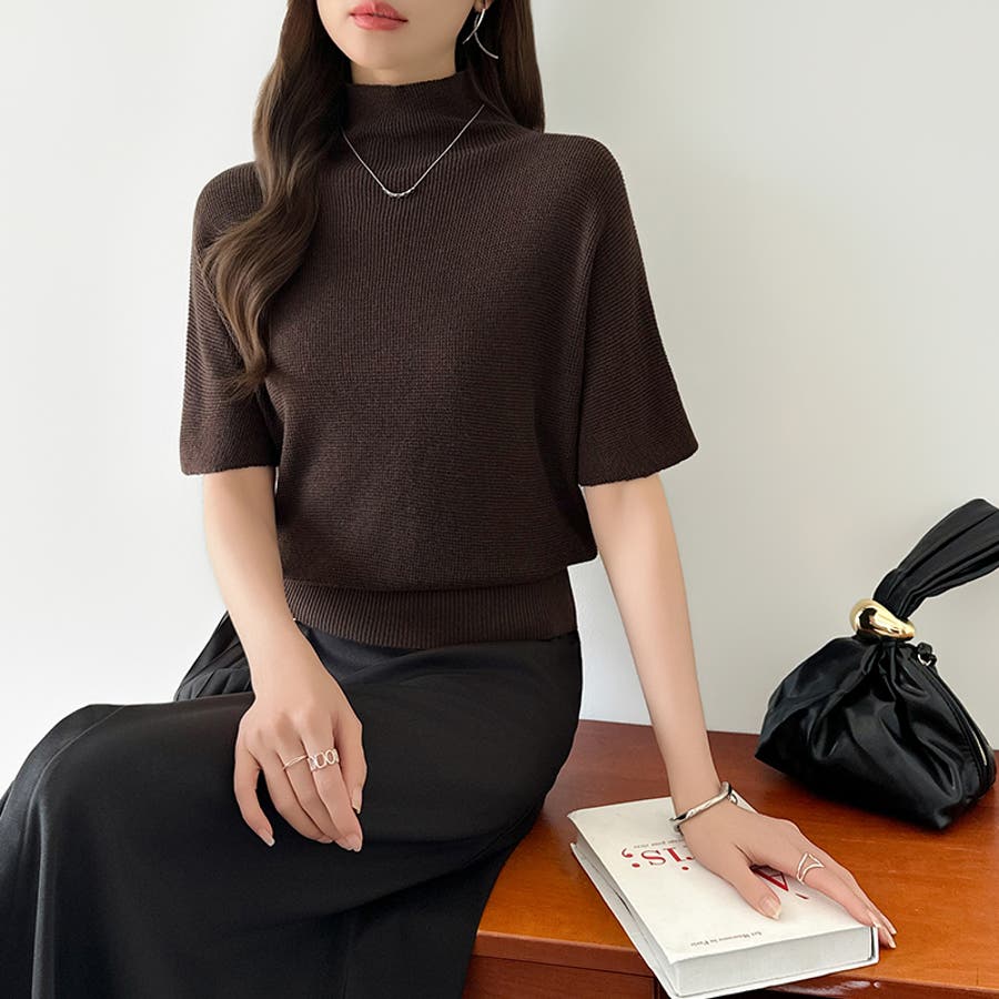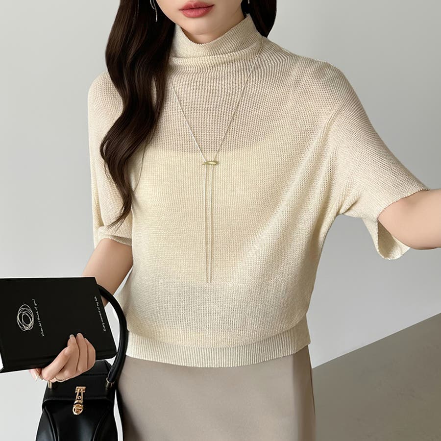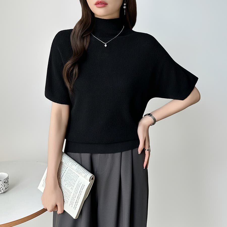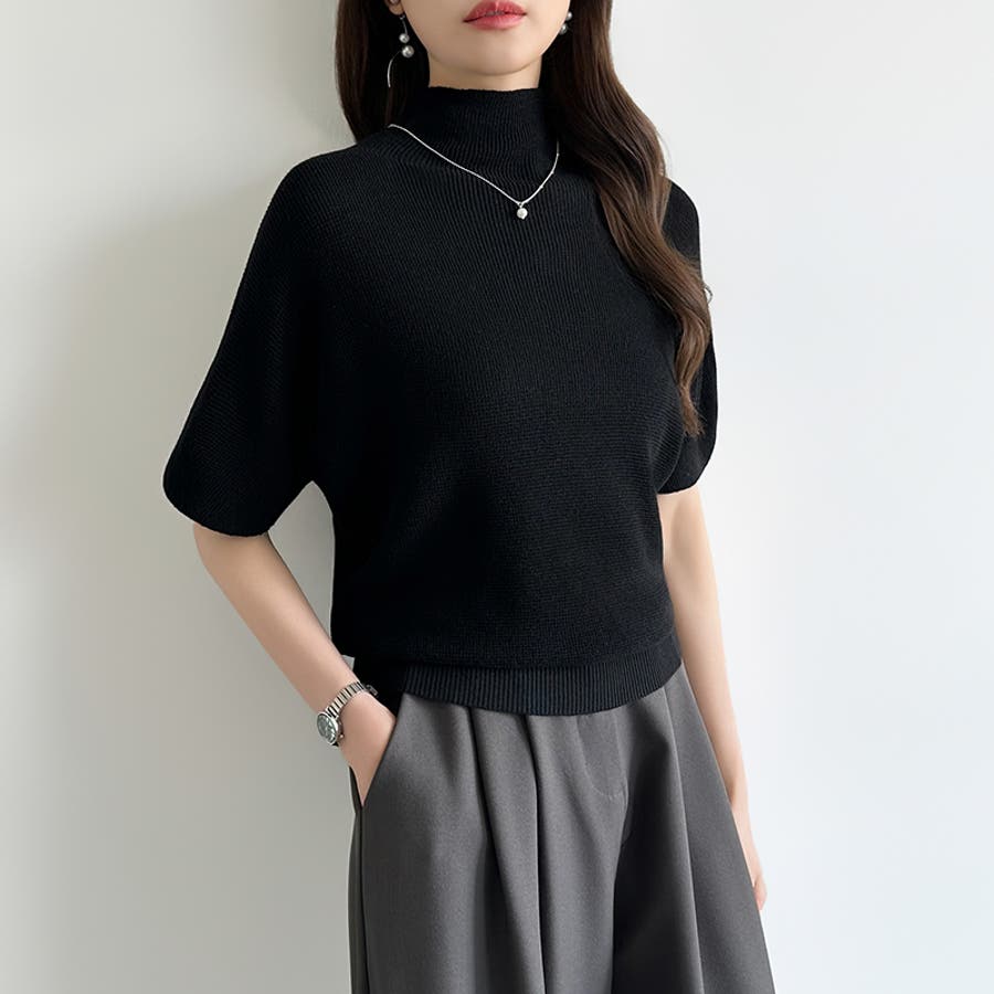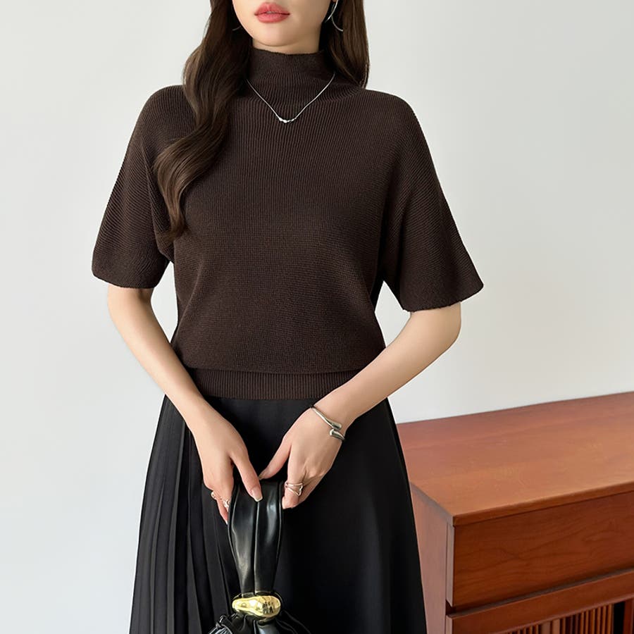 さらっと着られてきちんと見える。 毎日に寄り添う、サマーニット。 レーヨン混のなめらかな編地は、 肌離れがよく暑い季節も快適な着心地。 ほどよい透け感が重たさを抑え、 ニットならではの上品さを引き立てます。 長めの半袖丈で気になる二の腕を 自然にカバーし、ハイネックが 顔まわりをすっきりと見せてくれます。 一枚で着るのはもちろん、春秋は ジャケットやカーディガンの インナーとしても活躍。
