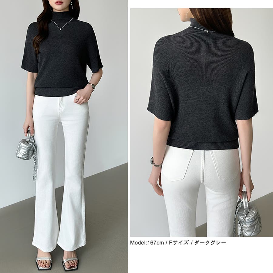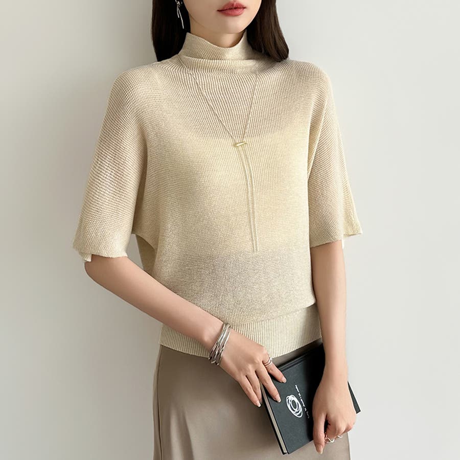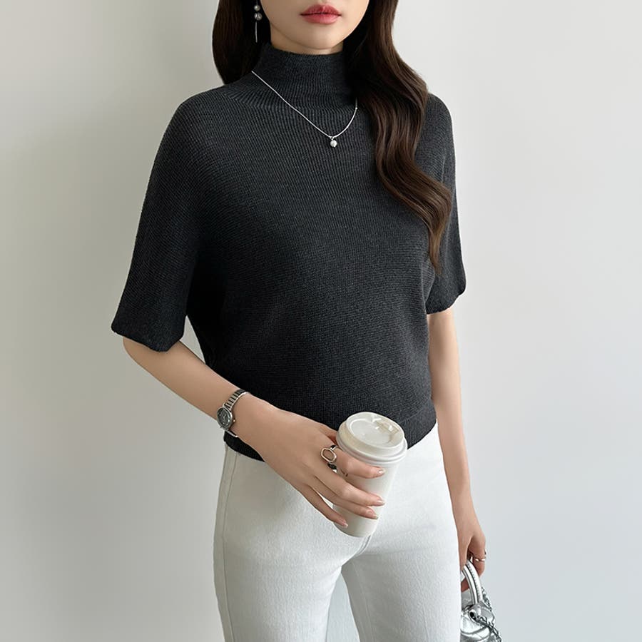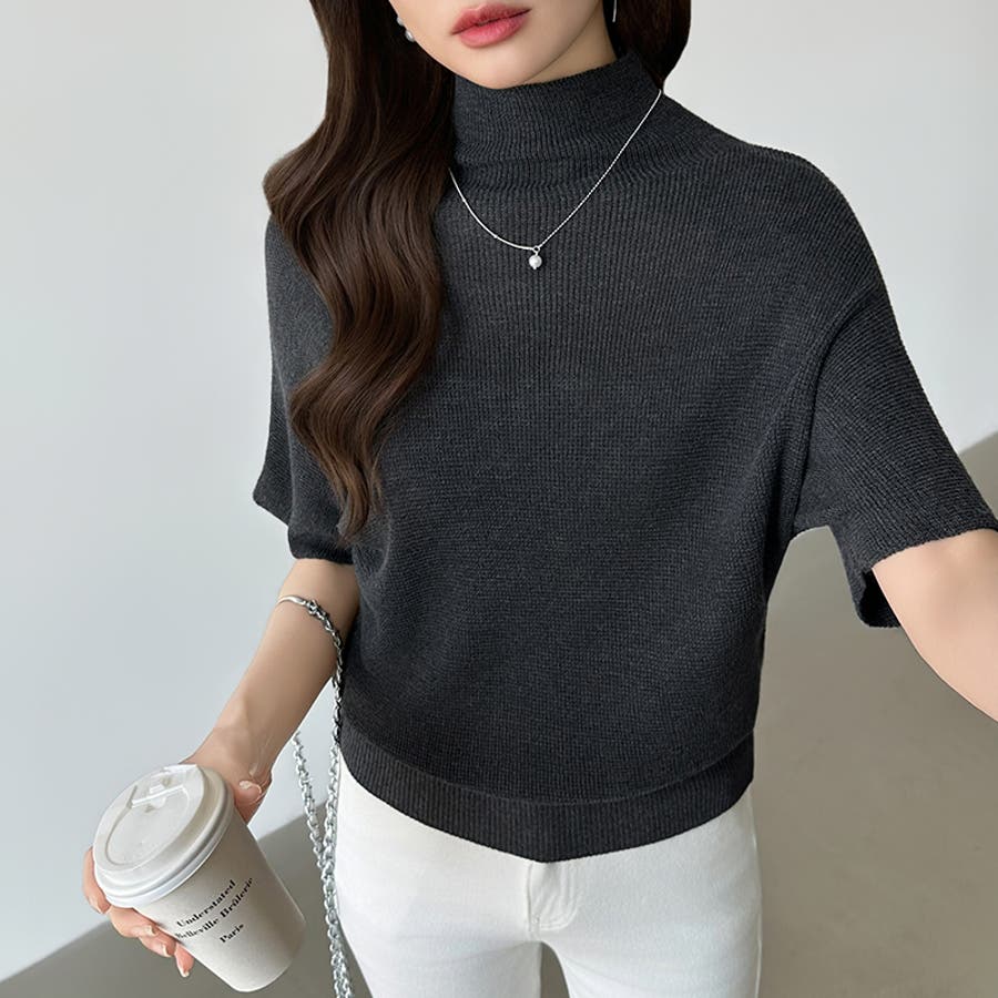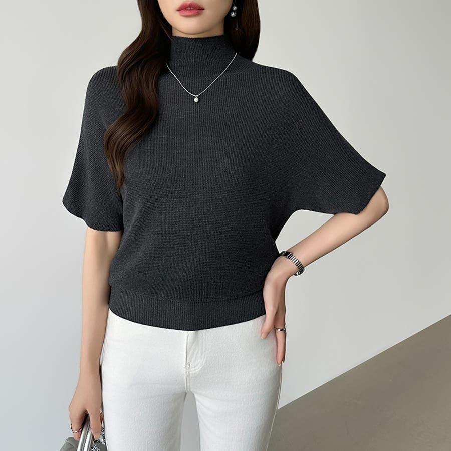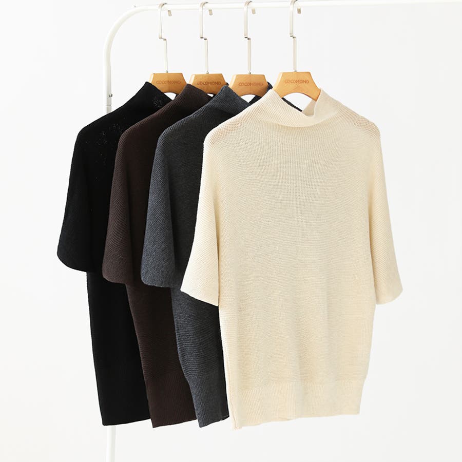 さらっと着られてきちんと見える。 毎日に寄り添う、サマーニット。 レーヨン混のなめらかな編地は、 肌離れがよく暑い季節も快適な着心地。 ほどよい透け感が重たさを抑え、 ニットならではの上品さを引き立てます。 長めの半袖丈で気になる二の腕を 自然にカバーし、ハイネックが 顔まわりをすっきりと見せてくれます。 一枚で着るのはもちろん、春秋は ジャケットやカーディガンの インナーとしても活躍。