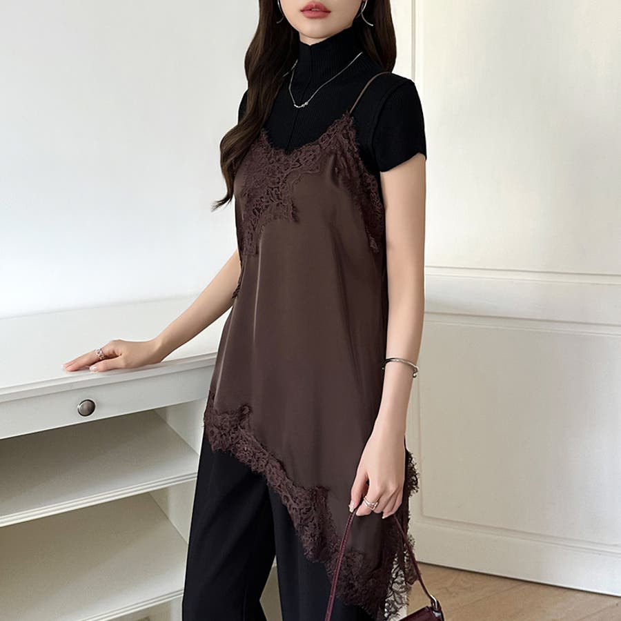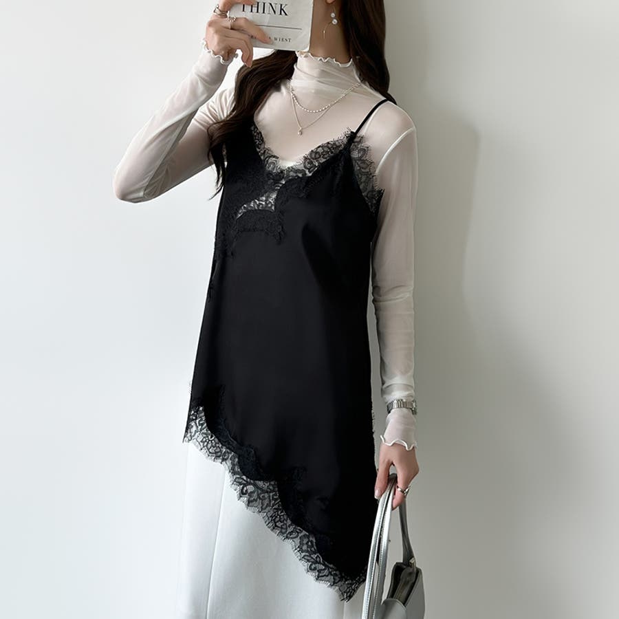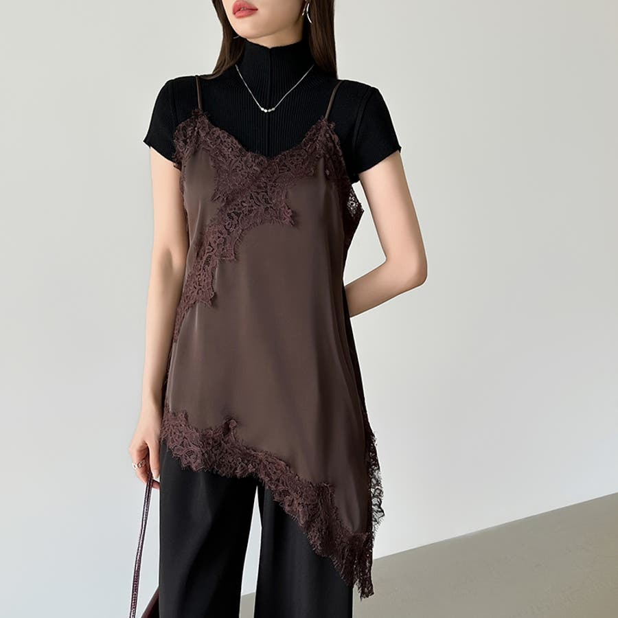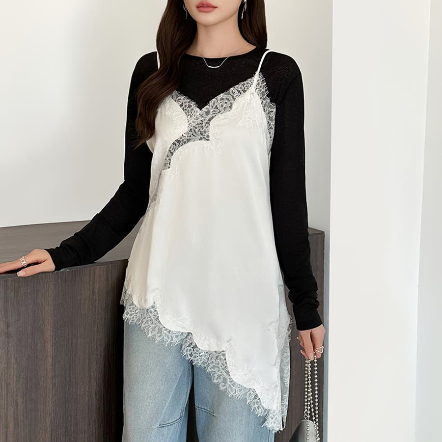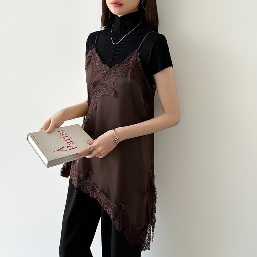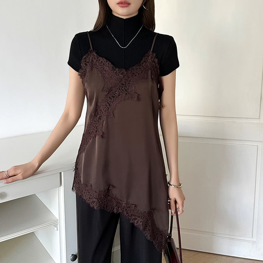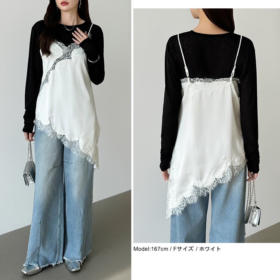 重ねるだけで今っぽい、 カジュアルにもきれいめにもハマる アシンメトリーレースキャミソール。 繊細なレースと上品な艶感のある サテン調素材を組み合わせ、 アシンメトリーなヘムラインで 甘くなりすぎない印象に仕上げました。 Tシャツに重ねてカジュアルダウン したり、ジャケット合わせで綺麗めにも インナー次第で幅広く楽しめます。