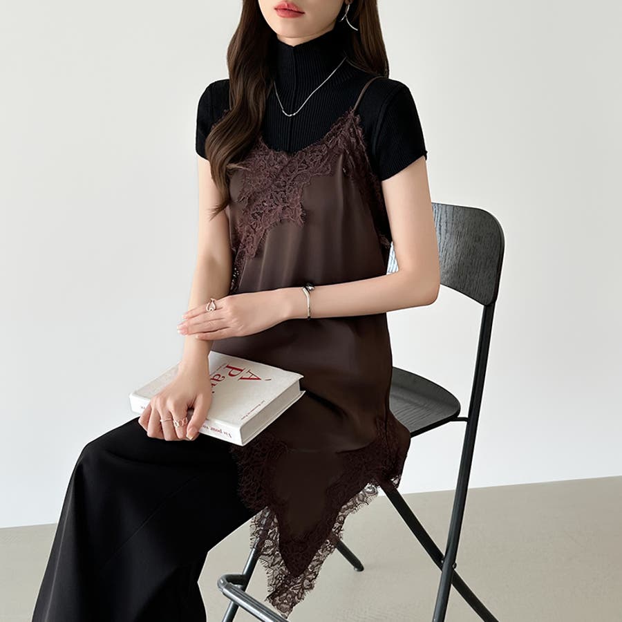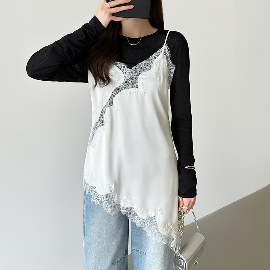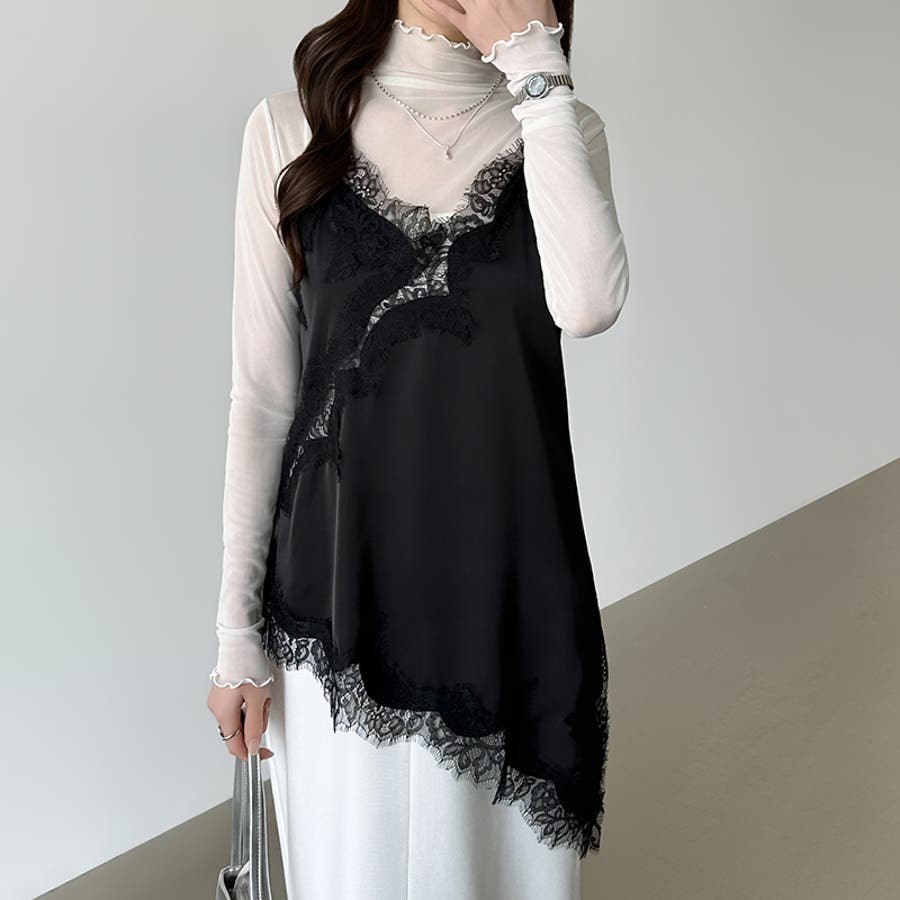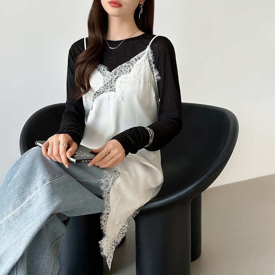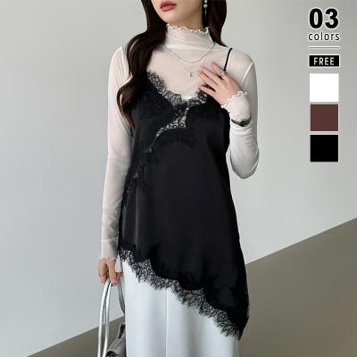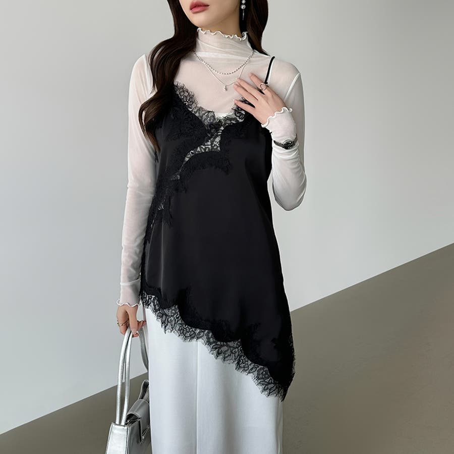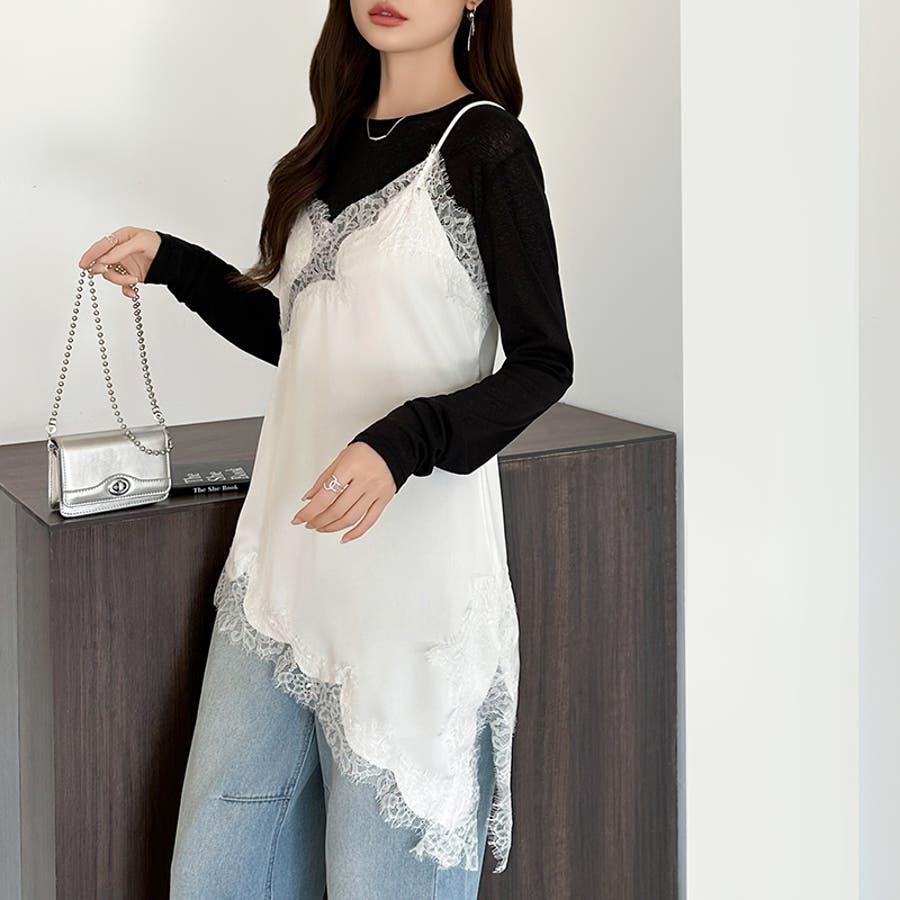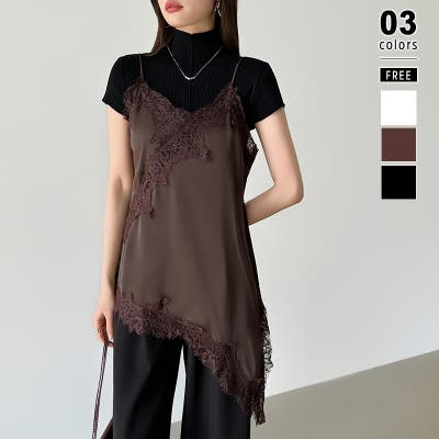 重ねるだけで今っぽい、 カジュアルにもきれいめにもハマる アシンメトリーレースキャミソール。 繊細なレースと上品な艶感のある サテン調素材を組み合わせ、 アシンメトリーなヘムラインで 甘くなりすぎない印象に仕上げました。 Tシャツに重ねてカジュアルダウン したり、ジャケット合わせで綺麗めにも インナー次第で幅広く楽しめます。