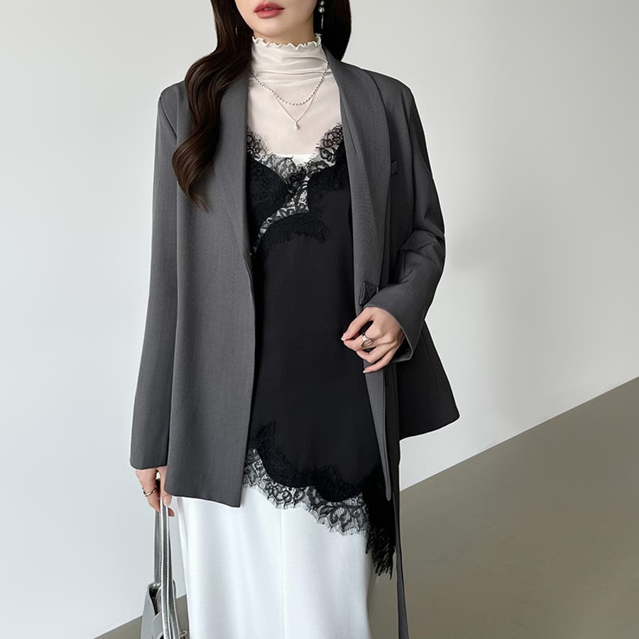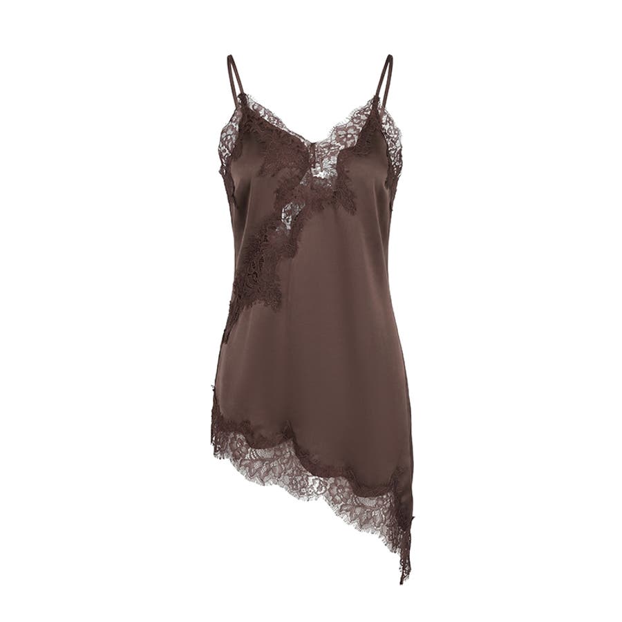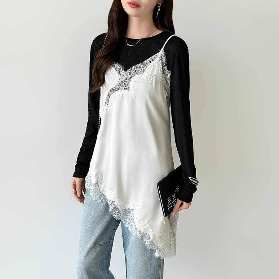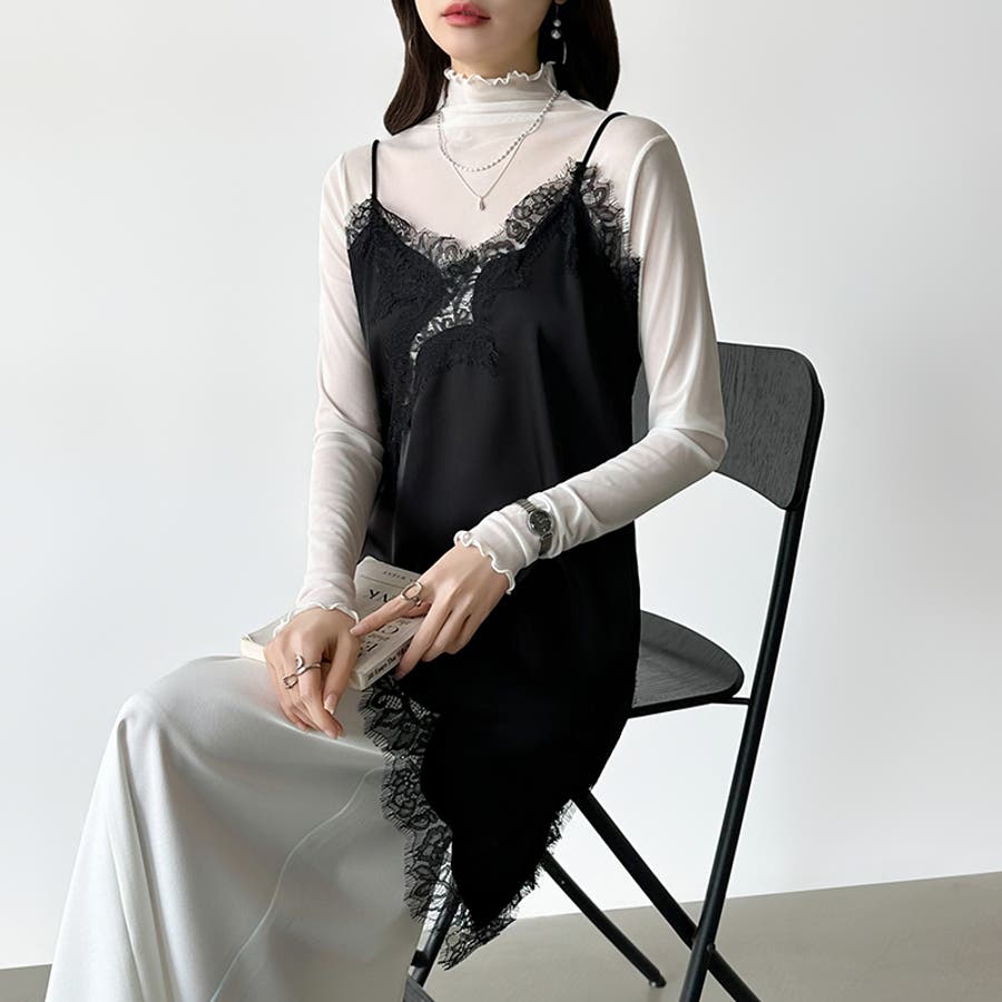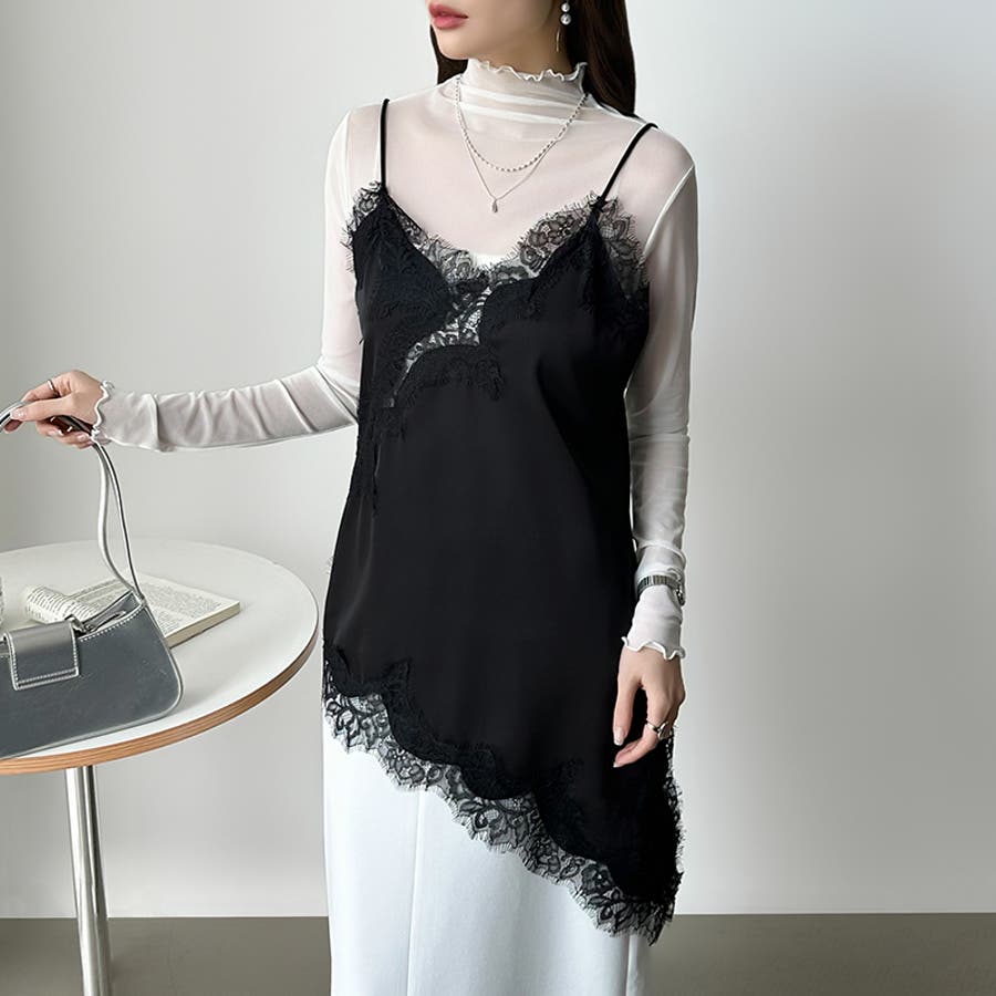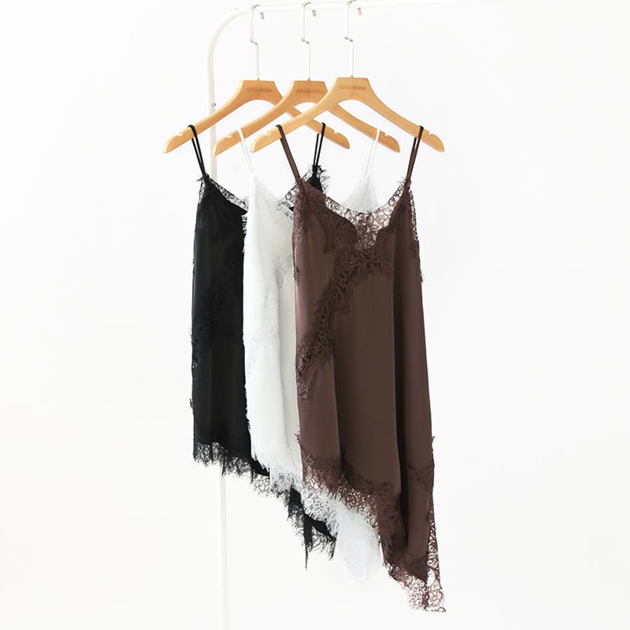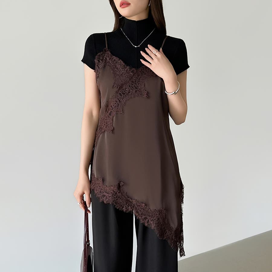 重ねるだけで今っぽい、 カジュアルにもきれいめにもハマる アシンメトリーレースキャミソール。 繊細なレースと上品な艶感のある サテン調素材を組み合わせ、 アシンメトリーなヘムラインで 甘くなりすぎない印象に仕上げました。 Tシャツに重ねてカジュアルダウン したり、ジャケット合わせで綺麗めにも インナー次第で幅広く楽しめます。