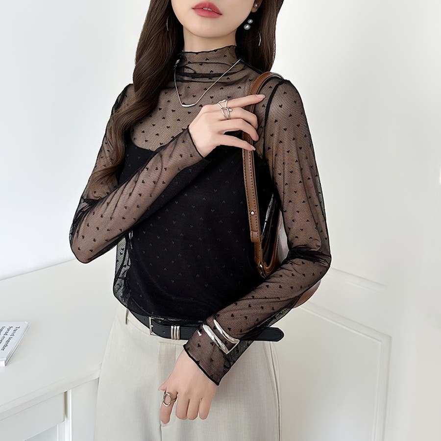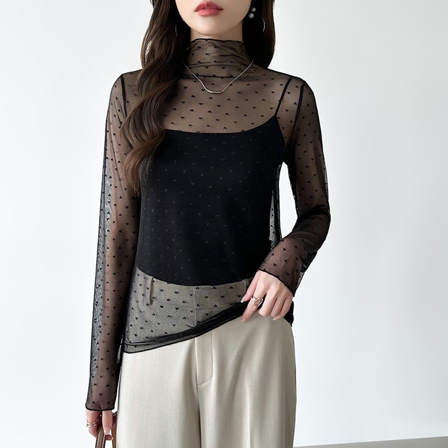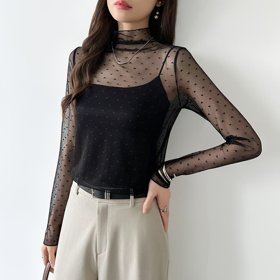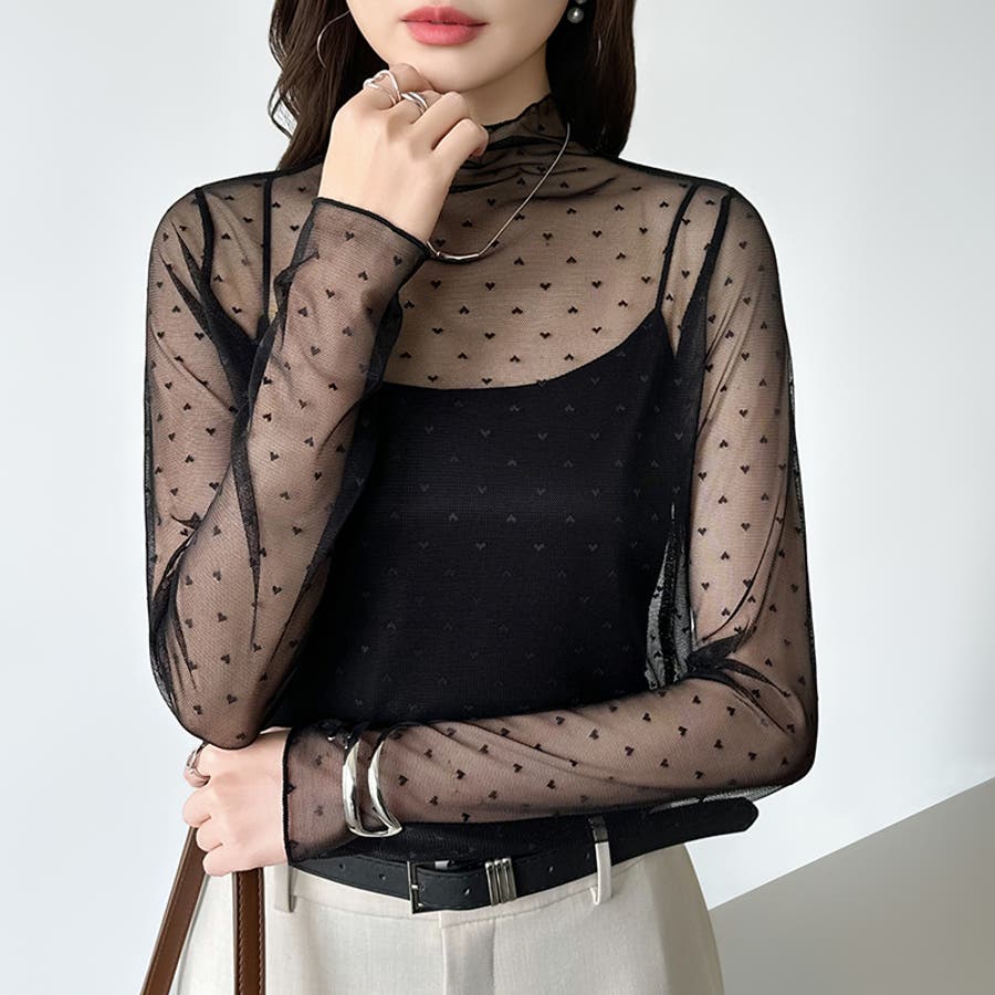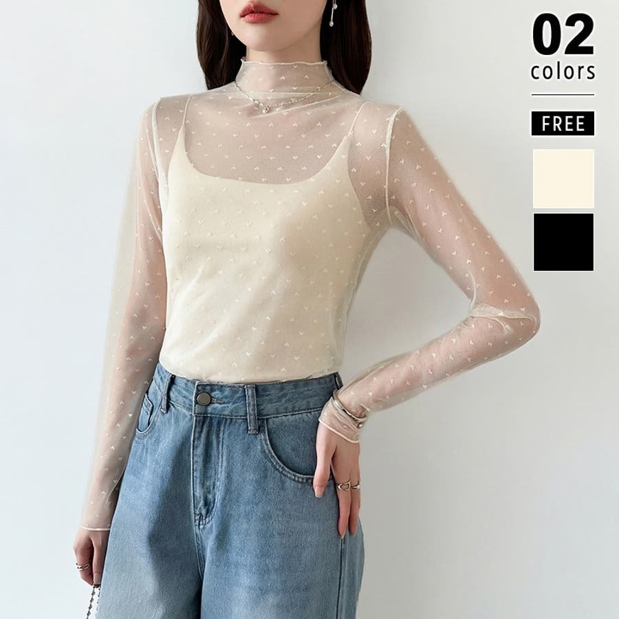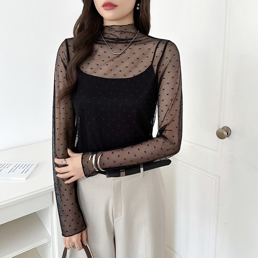一枚でも重ねても。甘すぎないハート柄シアートップス シアー ハイネック
