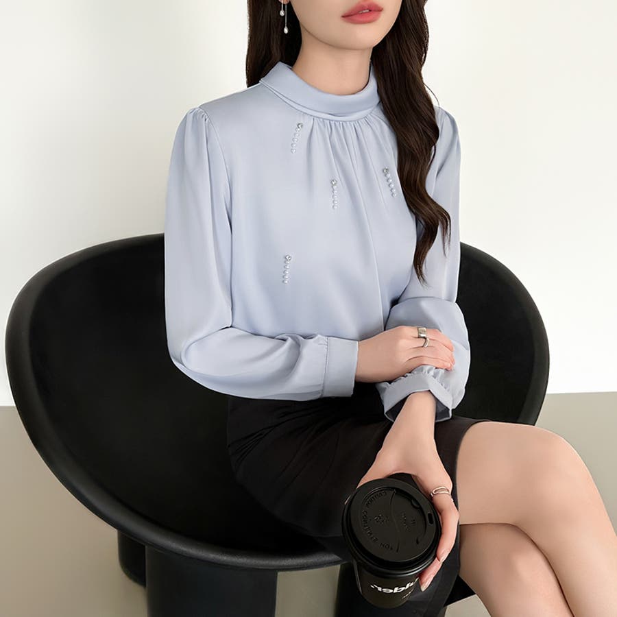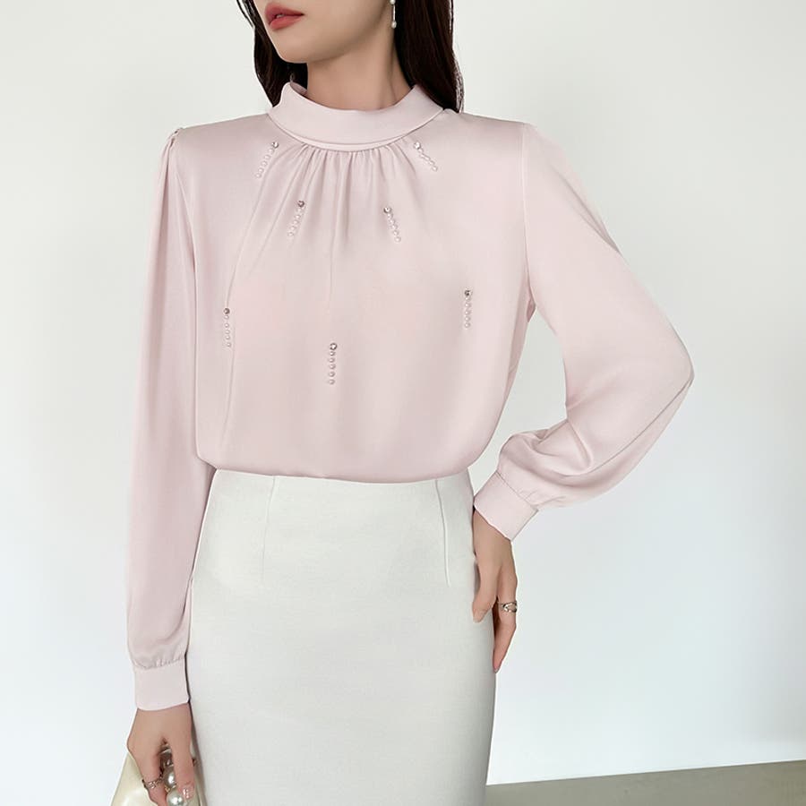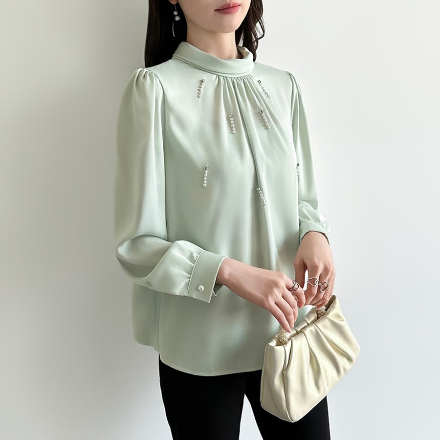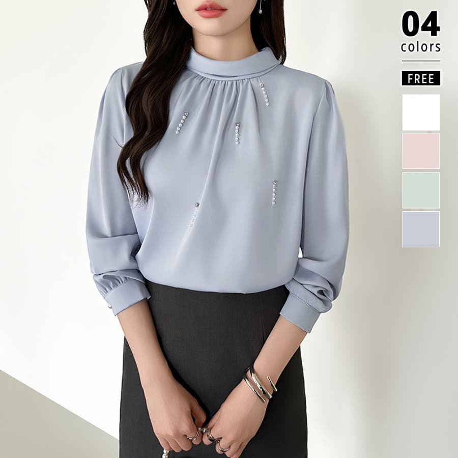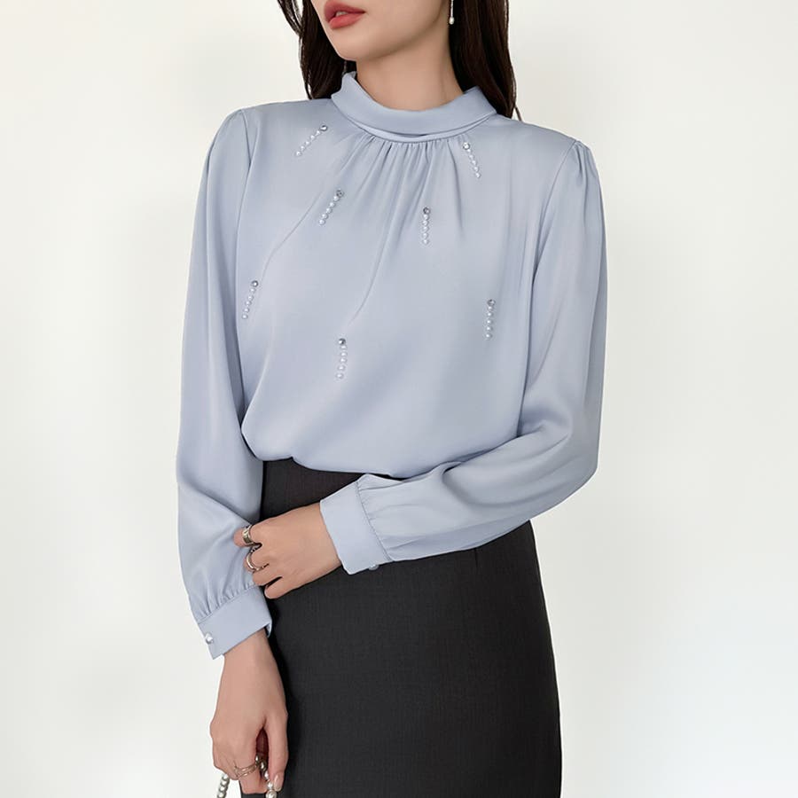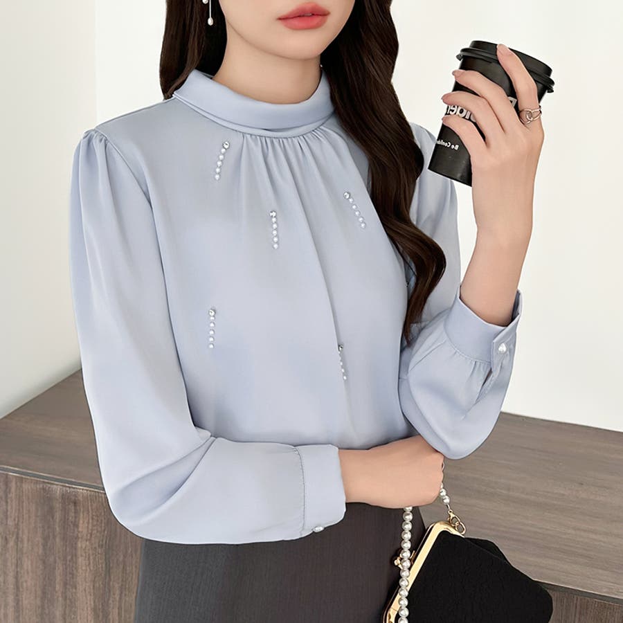 パールビジューが華やかに映える 上品なスタンドカラーブラウス。 艶のあるなめらかな素材感が 美しく洗練された印象に。 パールとビジューがアクセサリー いらずで顔まわりを華やかに 演出します。 一枚で着てもきちんと感があり、 ジャケットやスーツのインナー としても映え、オフィススタイル から食事会、オケージョンシーン まで幅広く活躍します。