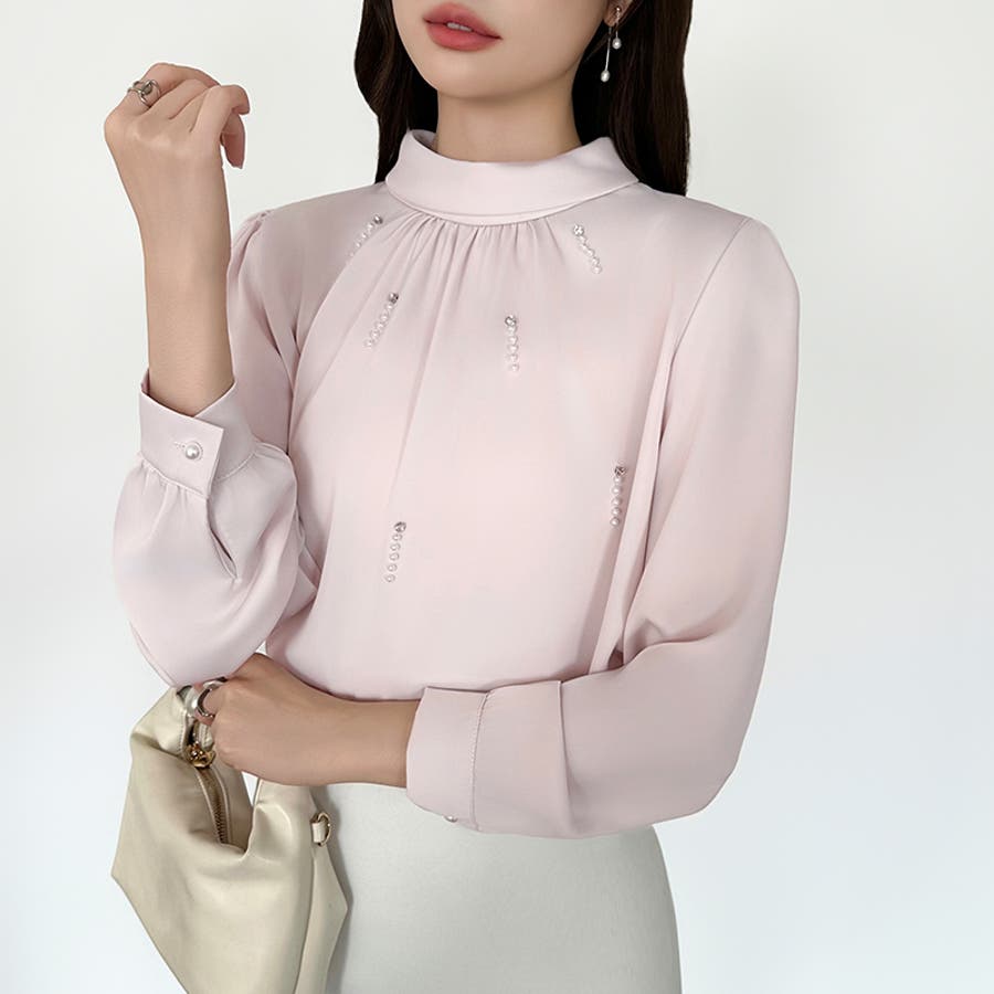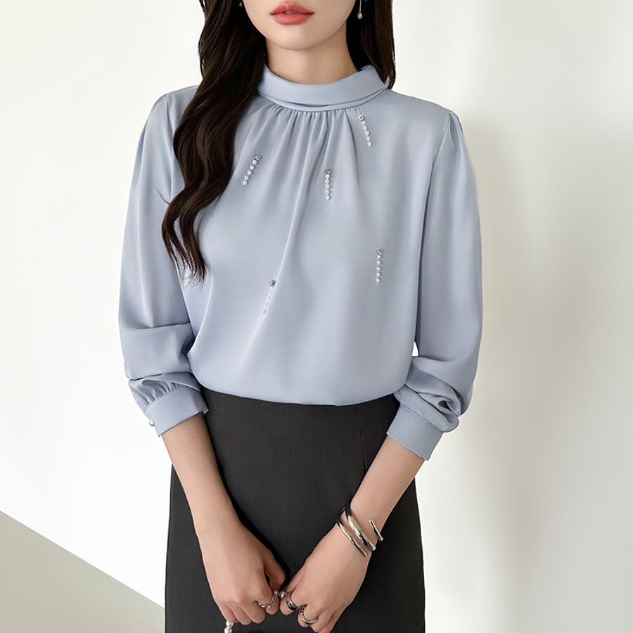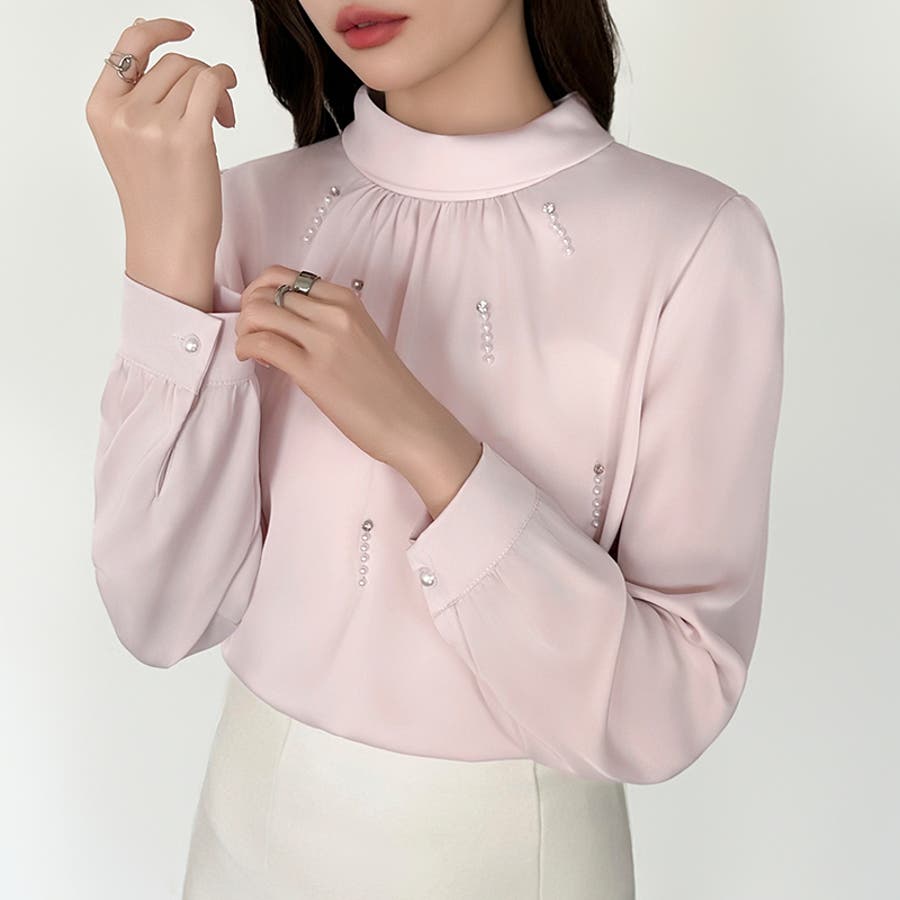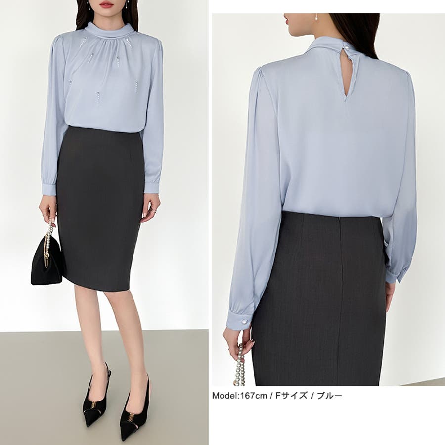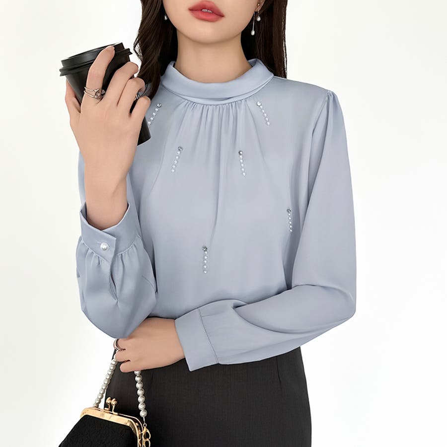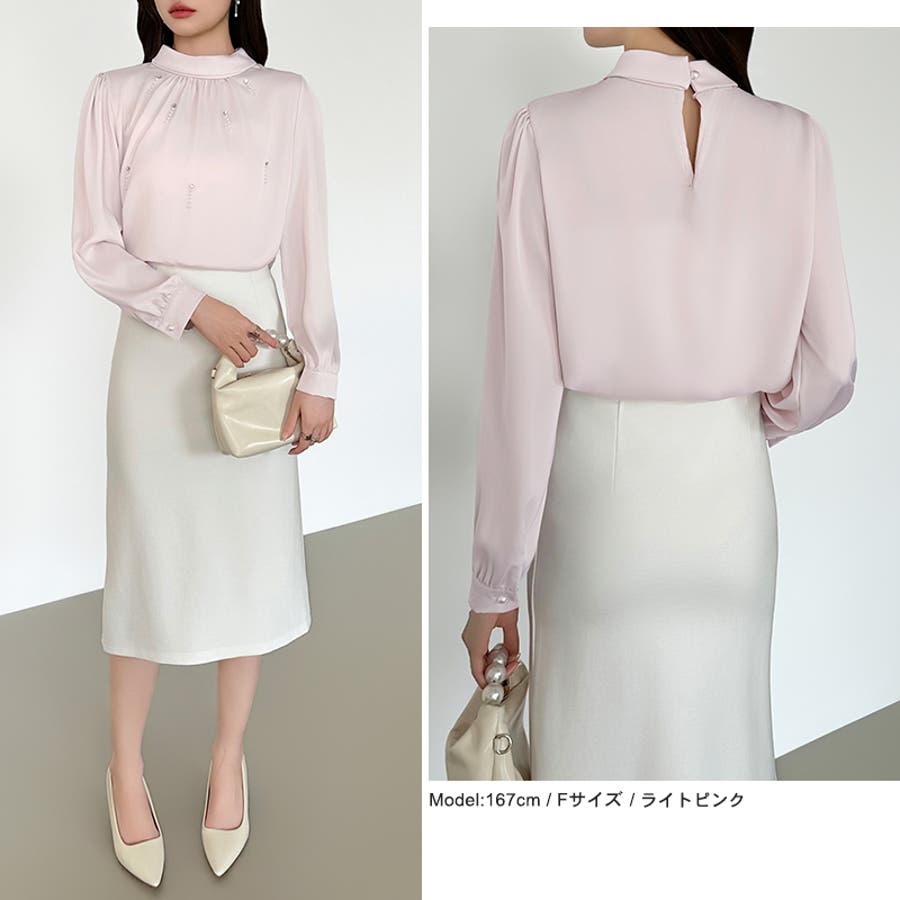 パールビジューが華やかに映える 上品なスタンドカラーブラウス。 艶のあるなめらかな素材感が 美しく洗練された印象に。 パールとビジューがアクセサリー いらずで顔まわりを華やかに 演出します。 一枚で着てもきちんと感があり、 ジャケットやスーツのインナー としても映え、オフィススタイル から食事会、オケージョンシーン まで幅広く活躍します。