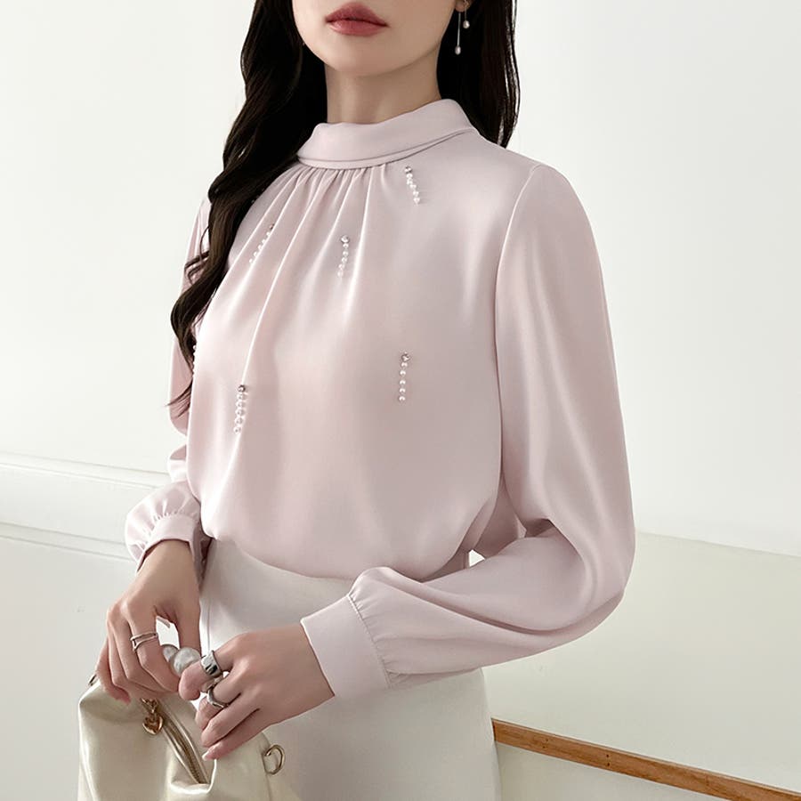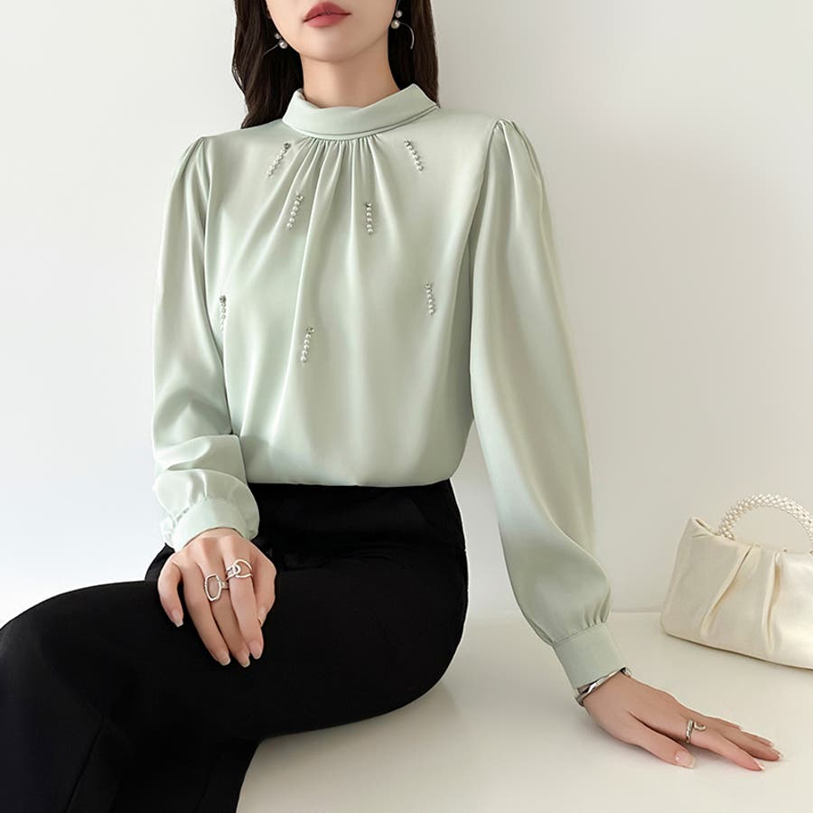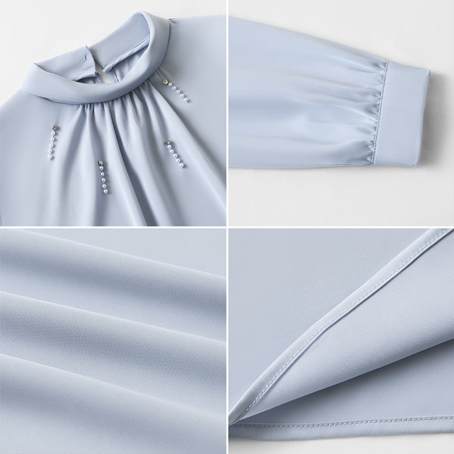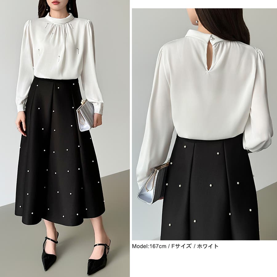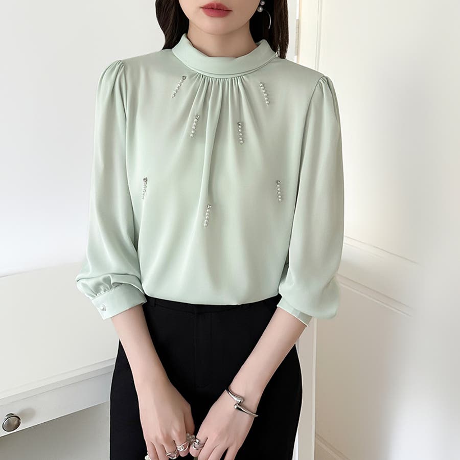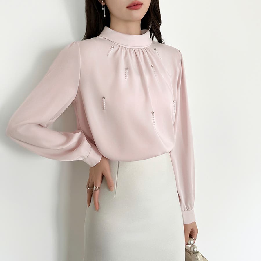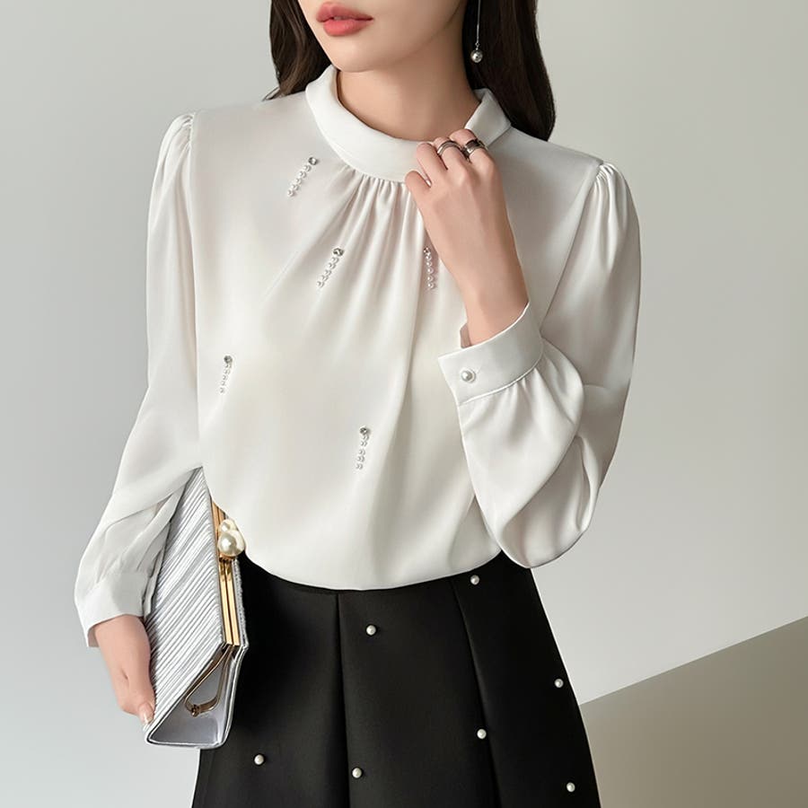 パールビジューが華やかに映える 上品なスタンドカラーブラウス。 艶のあるなめらかな素材感が 美しく洗練された印象に。 パールとビジューがアクセサリー いらずで顔まわりを華やかに 演出します。 一枚で着てもきちんと感があり、 ジャケットやスーツのインナー としても映え、オフィススタイル から食事会、オケージョンシーン まで幅広く活躍します。