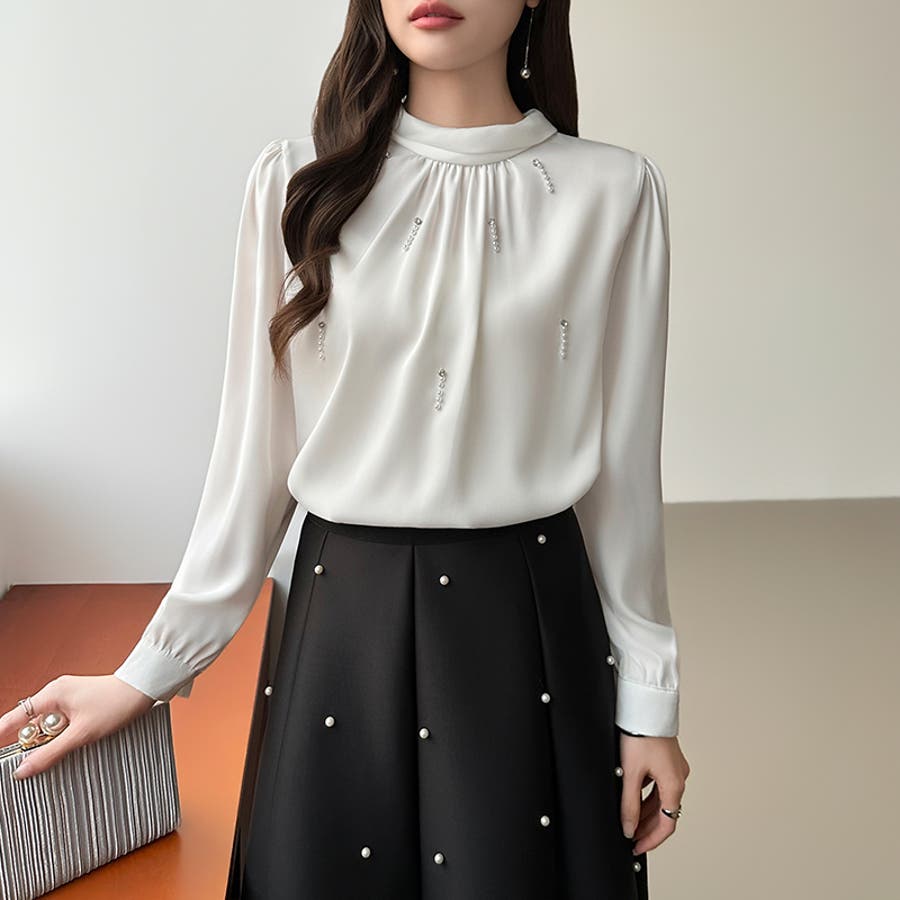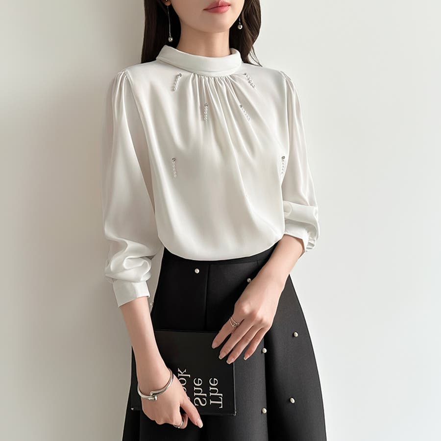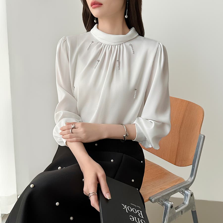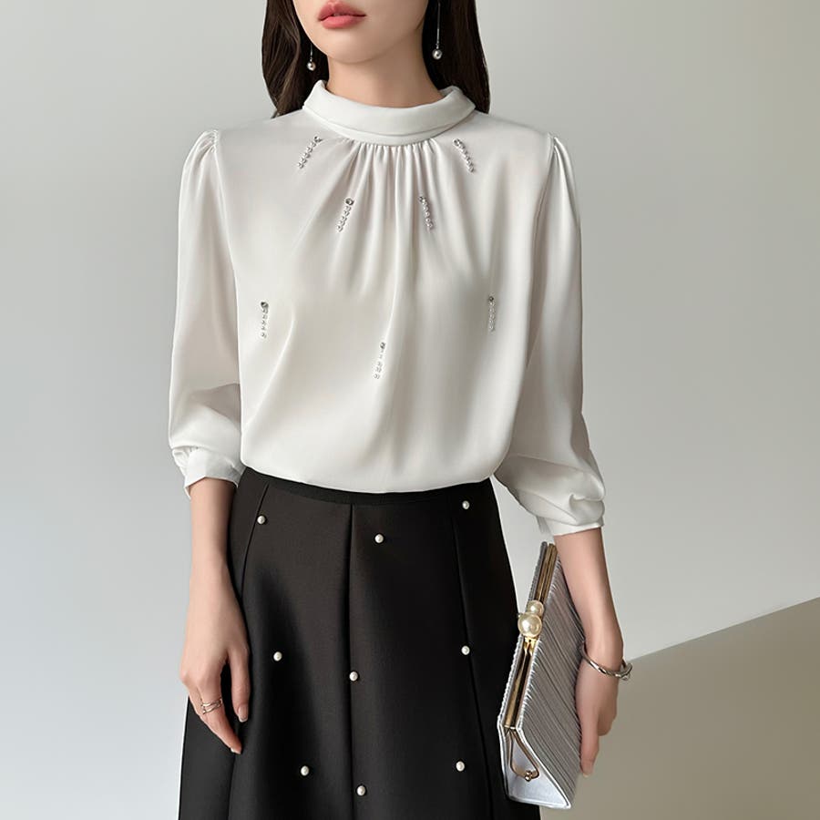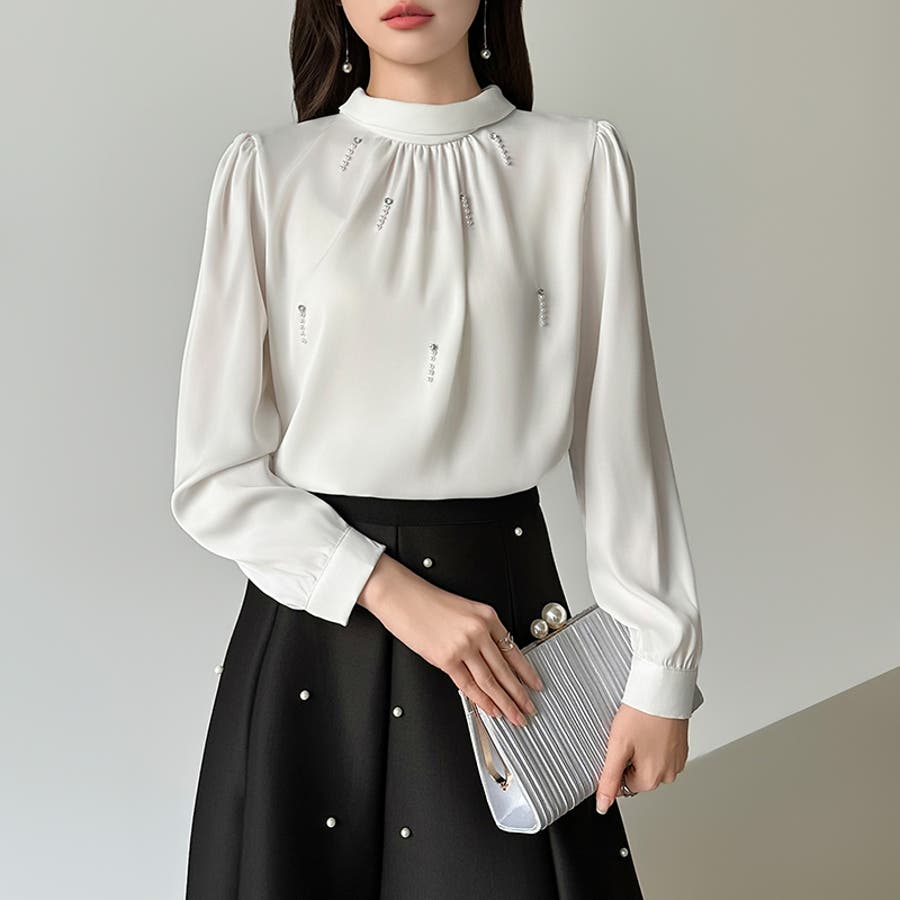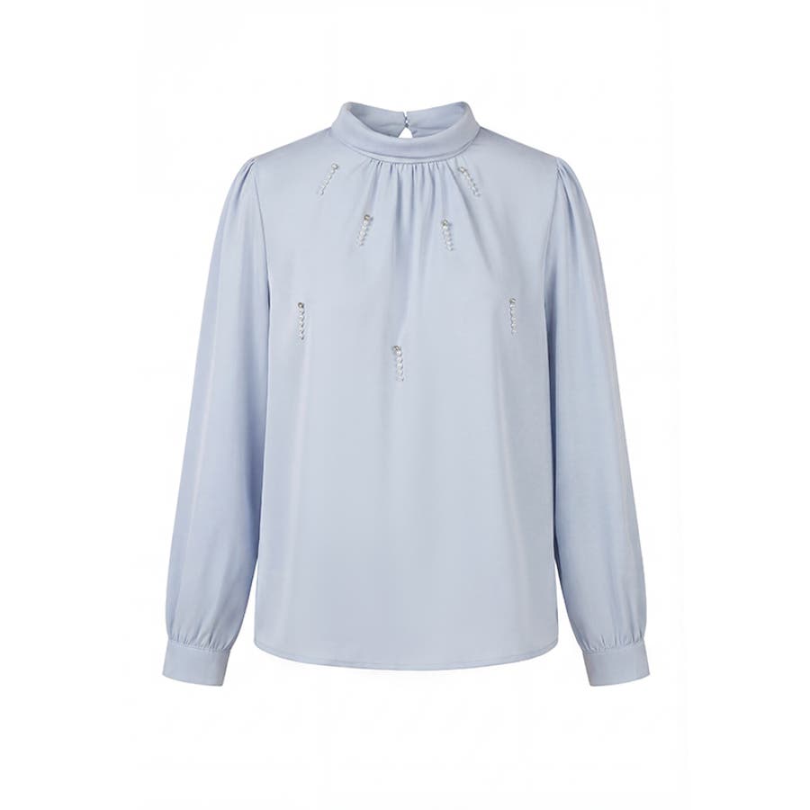 パールビジューが華やかに映える 上品なスタンドカラーブラウス。 艶のあるなめらかな素材感が 美しく洗練された印象に。 パールとビジューがアクセサリー いらずで顔まわりを華やかに 演出します。 一枚で着てもきちんと感があり、 ジャケットやスーツのインナー としても映え、オフィススタイル から食事会、オケージョンシーン まで幅広く活躍します。
