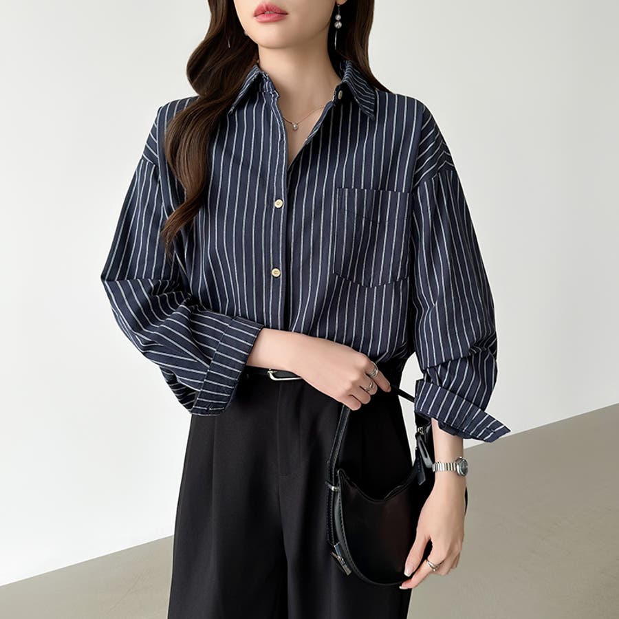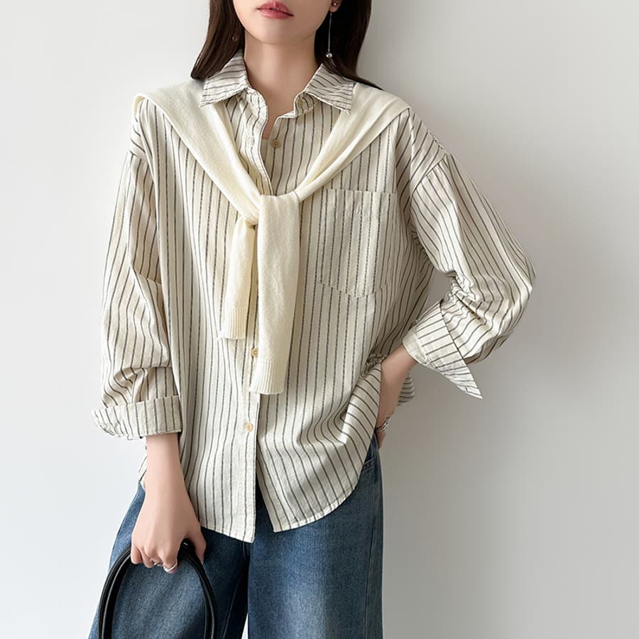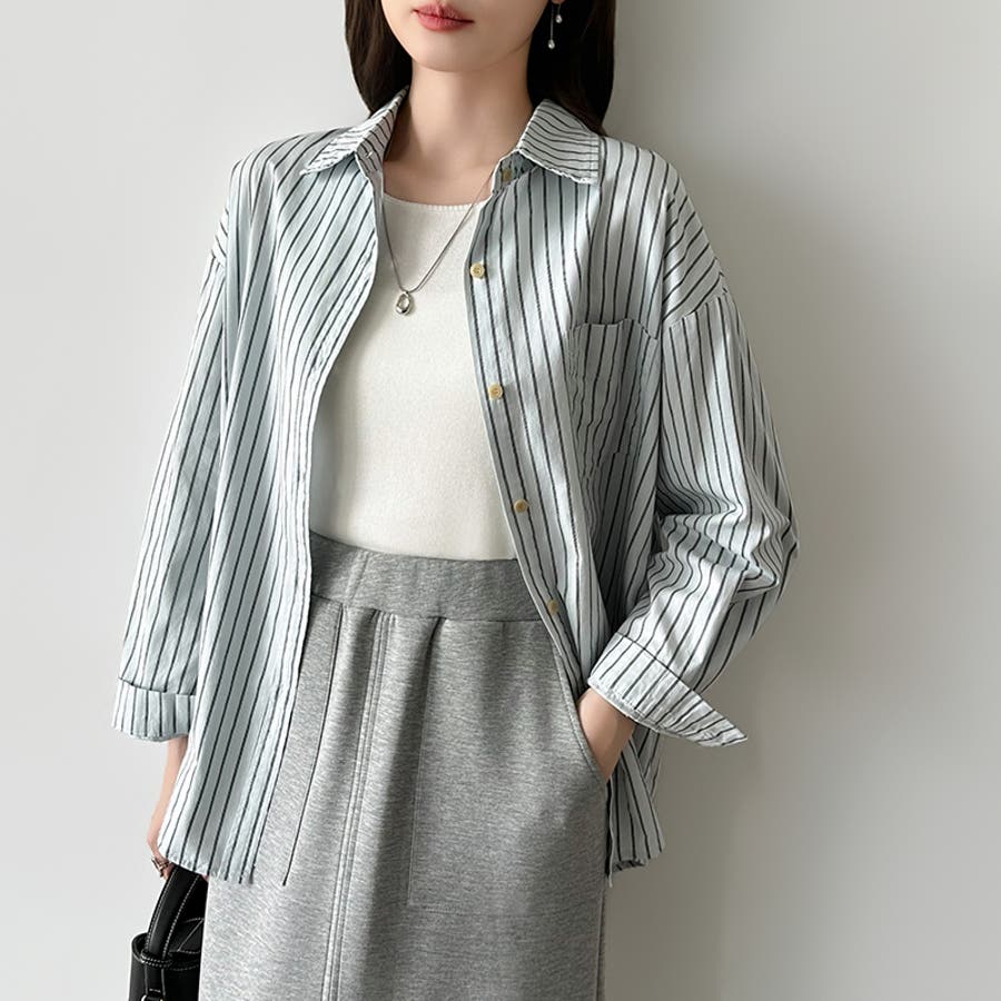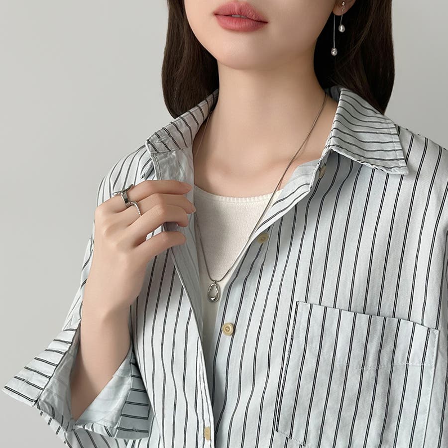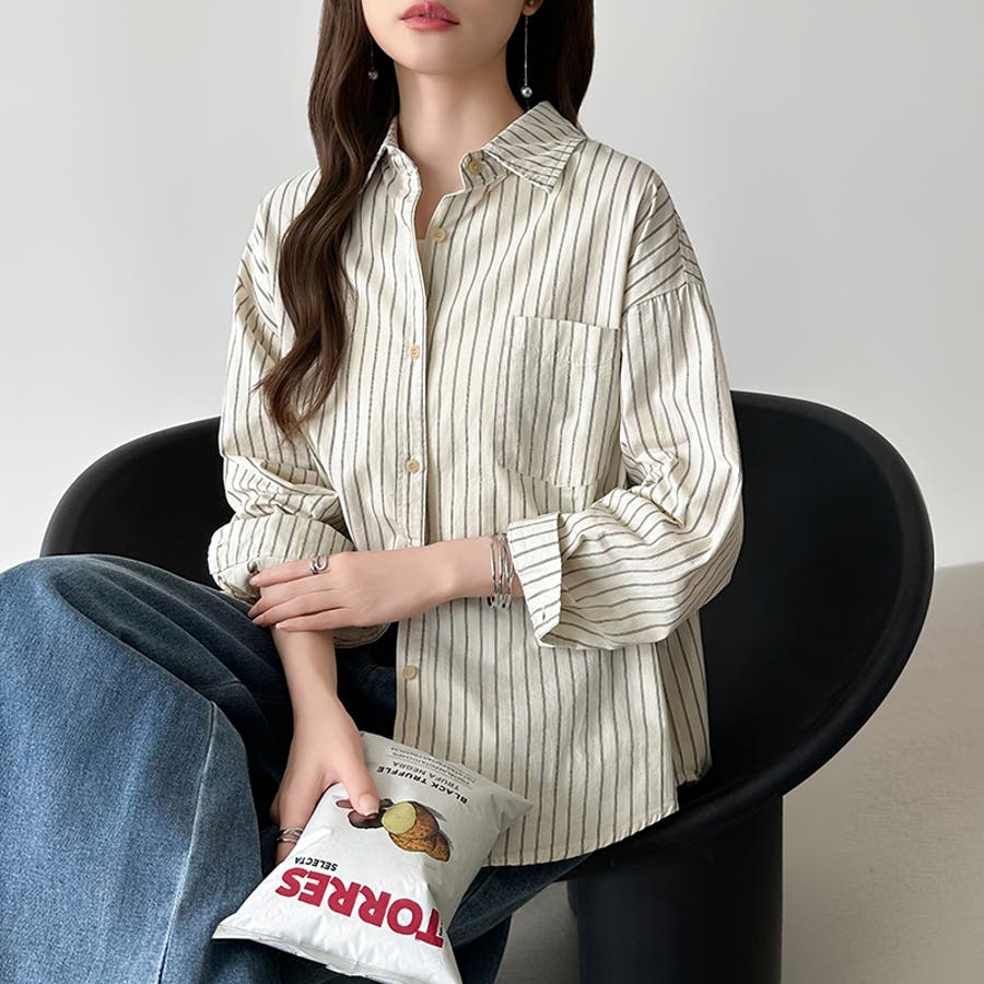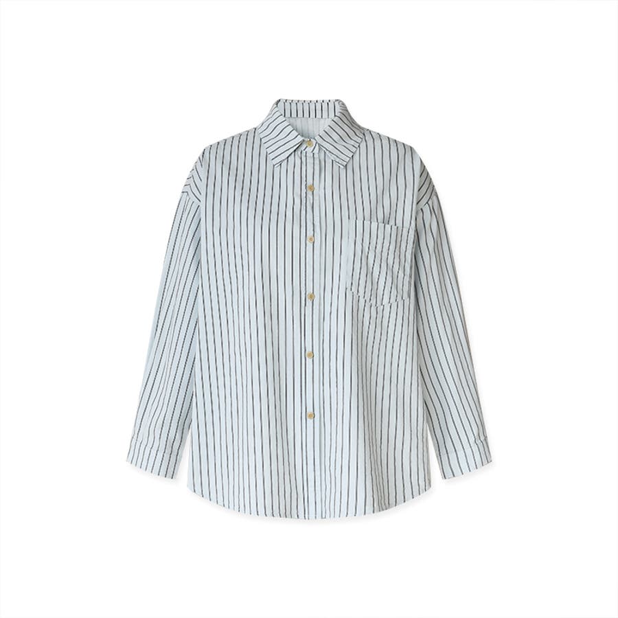 気負わず着られて、ちゃんと今っぽい ストライプシャツ。 細いラインを重ねたダブルライン ストライプが、ベーシックな中に さりげない表情をプラス。 素材はコットン100%のほどよくハリの ある生地感で、一枚でも羽織りとしても 使いやすい仕上がりに。 ラインを拾わないゆったりシルエットと 後ろ長めの丈感でヒップをカバーし、 デイリーからオフィスカジュアルまで 頼れる一枚です。