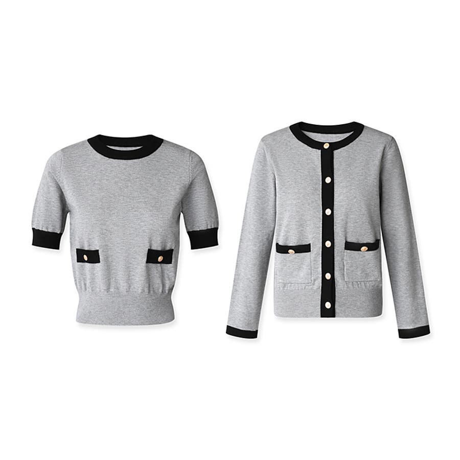 アンサンブル ニット カーディガン 配色 金ボタン レディース きれいめ 半袖 長袖 ツインニット アンサンブルニットカーディガン 配色ニット トップス サマーニット クルーネック 半袖ニット 長袖カーディガン 重ね着 レイヤード 上品 ニットアンサンブル ニットカーディガン 丈短め ショート丈 配色ニットカーディガン バイカラー バイカラーニット セットアップ セット きれいめニット ニットトップス ボタン可愛い クルーネックニット クルーネックカーディガン 2点セット 羽織り 丸首 ショートニット ショート 丈 クロップド クロップド丈 クロップド丈ニット ゴールドボタン ゴールドボタンニット 羽織 おしゃれ プルオーバー キレイめトップス tops 着回し 着まわし 伸縮性 ストレッチ フィット 細見え 華奢見え 着痩せ 洗える 手洗い 手洗い可能 洗濯できる 洗濯 洗濯可能 洗濯可 通勤 デート おでかけ お出かけ 旅行 食事会 服装 オフィス オフィスカジュアル オフィスカジュアル春夏 オフィカジ オフィスニット フェミニン カジュアル エレガント 清楚 ミセス 大人 大人カジュアル オトナ かわいい 可愛い 大人可愛い 大人かわいい 大人っぽい きれい め キレイめ 綺麗め きれいめカジュアル オシャレ 女性 母 母親 ママ ママコーデ プチプラ 高見え トレンド ヒット 商品 おすすめ 服 服装 洋服 ファッション コーデ コーディネート フリーサイズ フリー サイズ グレー 灰色 ブラック 黒 カラー レディース春 レディース夏 レディース秋 レディース春夏 レディース春物 レディース夏物 レディース秋物 春トップス 夏トップス 秋トップス 春トップスレディース 夏トップスレディース 秋トップスレディース 春ニット 夏ニット 秋ニット 二ットレディース 長袖レディース 長袖トップスレディース 長袖トップスおしゃれ トップスレディース トップスレディース長袖 セットレディース ニットカーディガンレディース 新作 春秋 春夏 春 夏 秋 春服 夏服 秋服 春物 夏物 秋物 春用 夏用 秋用 韓国 韓国ファッション 10代 20代 30代 40代 50代 60代 70代 cocomomo ココモモ