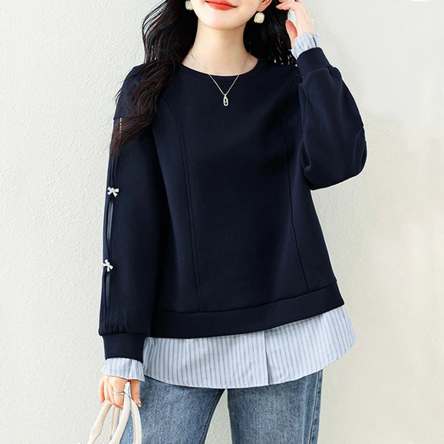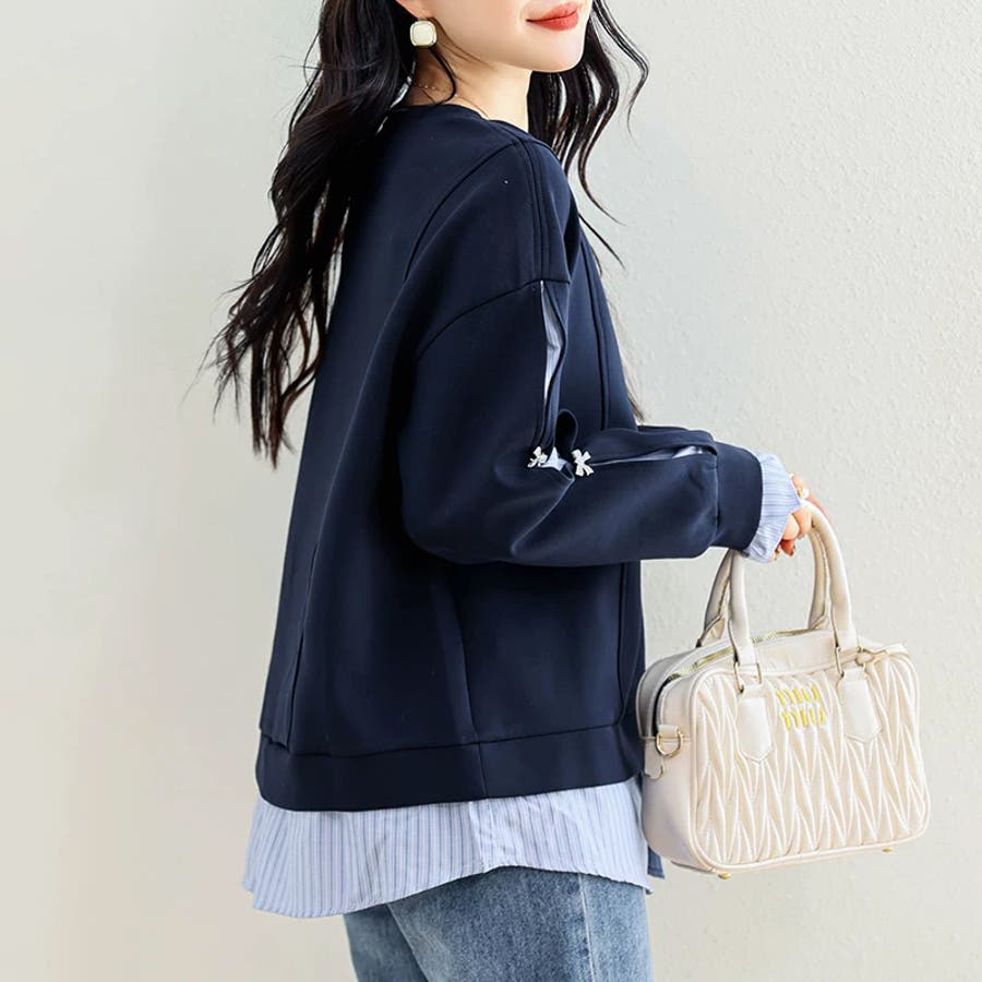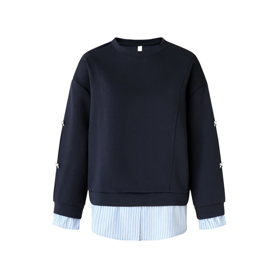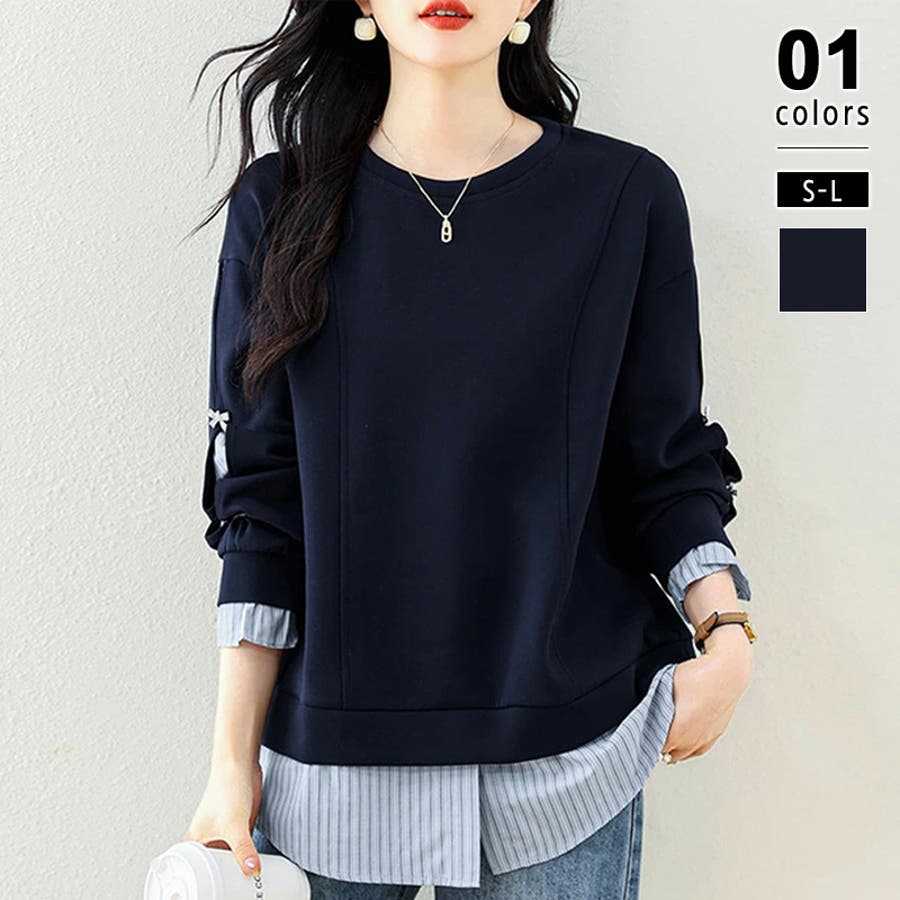 レイヤード風 シャツ スウェット 袖リボン トップス レディース トレーナー 長袖 袖スリット 重ね着風 重ね着風スウェット ドッキング ストライプ ゆったり 体型カバー 切り替え おしり隠し シャツドッキングプルオーバー ストライプシャツ 切り替えシャツ 切り替えトレーナー 袖 スリット きらきら ビジュー ラインストーン 異素材トップス きれいめ 大人 カットソー クルーネック プルオーバー 異素材切り替えトップス 重ね レイヤード 風 大きいサイズ スウェットトレーナー スエット 大きい 大きめ ラウンドネック 体型 カバー 隠し 楽 楽ちん 楽チン tops 洗える 手洗い可 手洗い 洗濯機で洗える リラックス 韓国風 韓国服 フェミニン カジュアル きれいめカジュアル 可愛い かわいい 大人可愛い 大人カジュアル オシャレ おしゃれ プチプラ 高見え トレンド ヒット 商品 おすすめ 服 服装 ファッション コーデ 母 ママ ママコーデ 女性 カジュアルコーデ Sサイズ Mサイズ Lサイズ S M L サイズ ネイビー 紺 紺色 カラー 春トップス 秋トップス 冬トップス 春トップスレディース 秋トップスレディース 冬トップスレディース レディース春 レディース秋 レディース冬 レディース秋冬 レディース秋物 レディース秋冬トップス 長袖トップス トップス長袖 長袖トップスレディース 長袖トップスおしゃれ トップスレディース トップスレディース長袖 レディーストップス 長袖レディース 長袖トレーナーレディース 可愛いトレーナー スウェットレディース スウェットトレーナーレディース 春秋 秋冬 春 秋 冬 春服 秋服 冬服 春用 秋用 冬用 春物 秋物 冬物 韓国 韓国ファッション 10代 20代 30代 40代 50代 60代 70代 cocomomo ココモモ